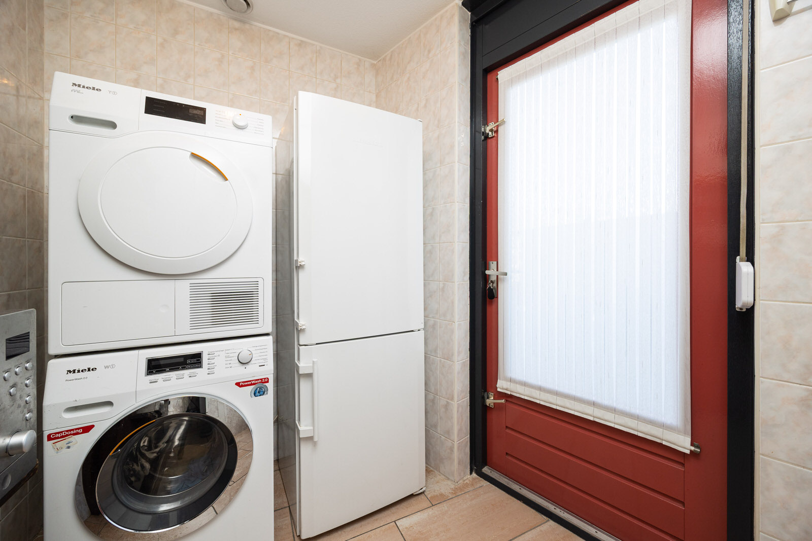 Aansluitend aan de keuken bevindt zich de bijkeuken met aansluitingen voor wasmachine en droger en ruimte voor bijvoorbeeld een vriezer. Vanuit deze ruimte is er een deur naar buiten.
