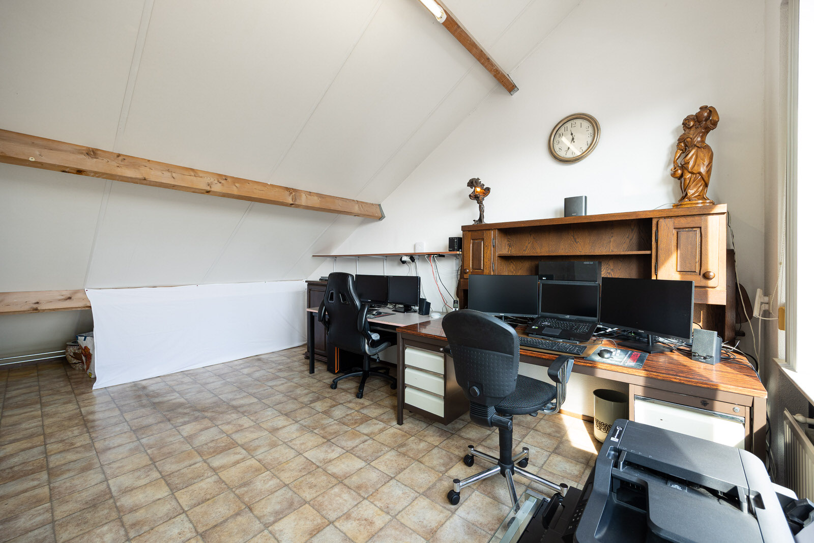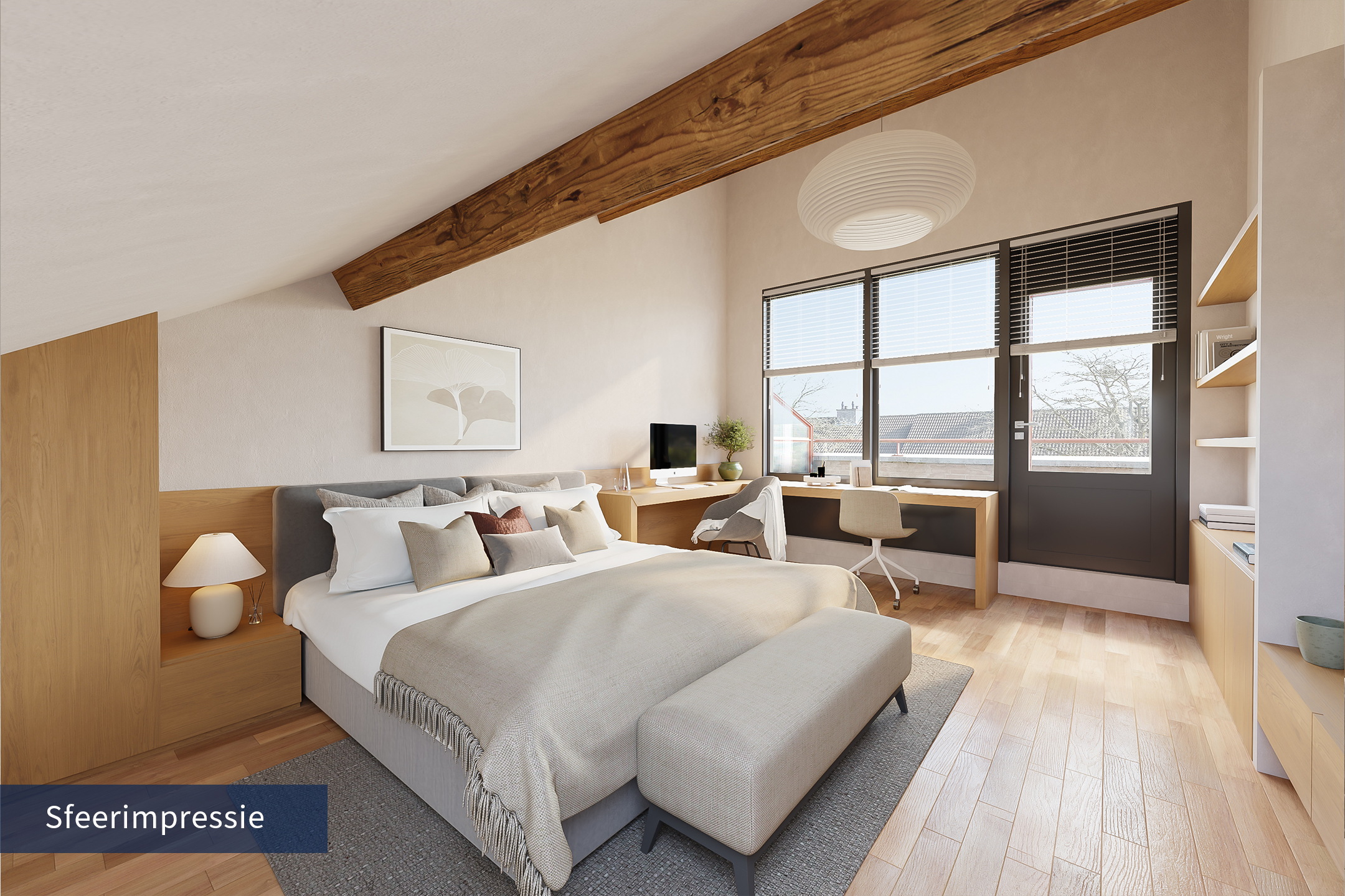 De tweede verdieping biedt een volwaardige vierde slaapkamer. De kamer is ruim van opzet en beschikt over praktische bergruimte onder de schuine dakvlakken. Vanuit deze kamer is er directe toegang tot het dakterras.