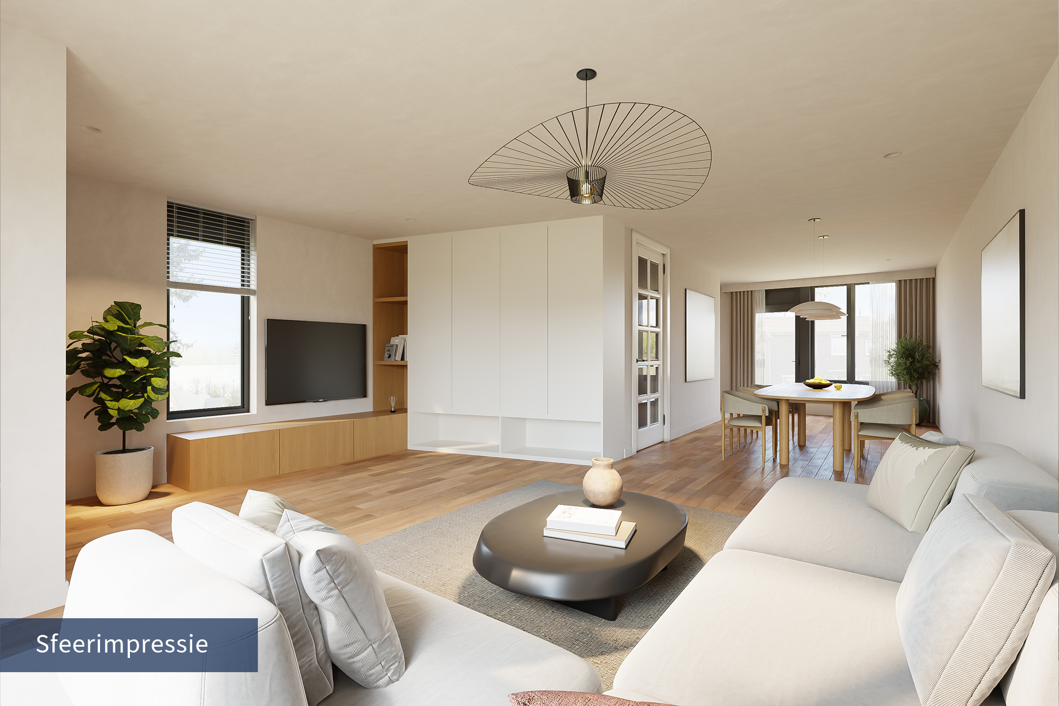 • Ruime en lichte woonkamer met open verbinding naar de keuken.