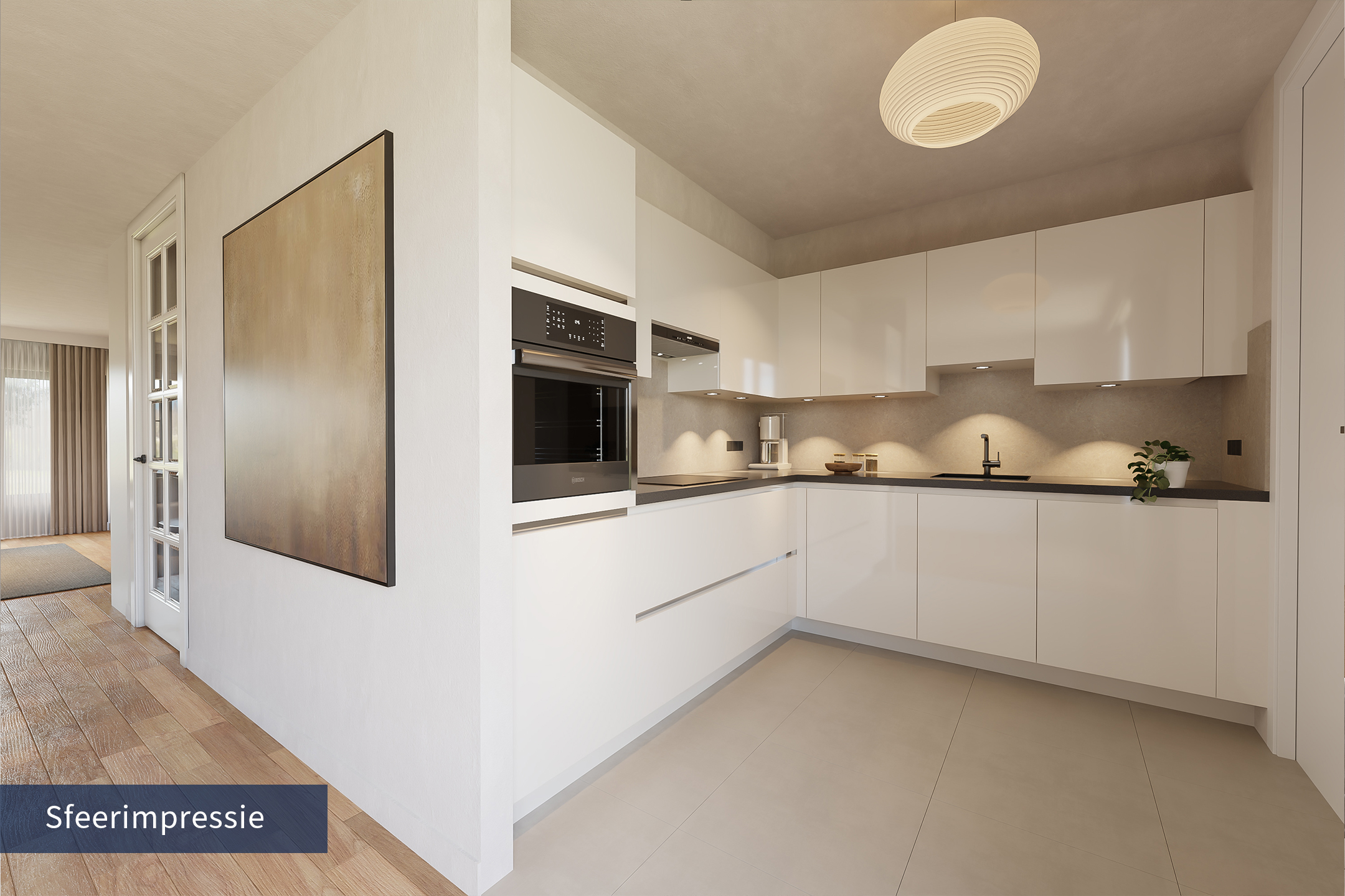 De open keuken is geplaatst in een praktische hoekopstelling en staat in directe verbinding met de eetruimte. Hierdoor blijft het contact met de woonkamer behouden tijdens het koken. De keuken is uitgerust met een inductiekookplaat, afzuigkap en oven en biedt daarnaast veel bergruimte.