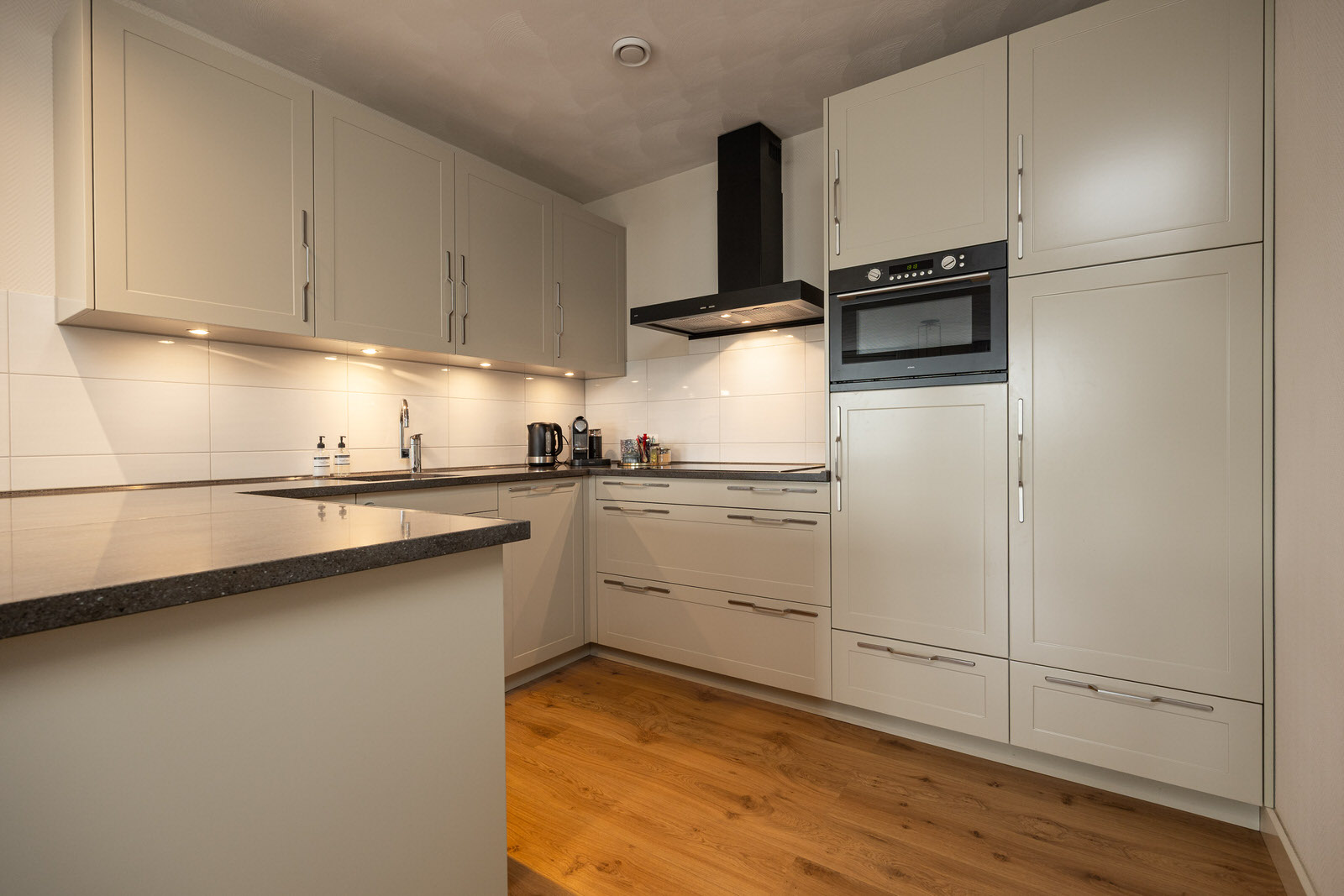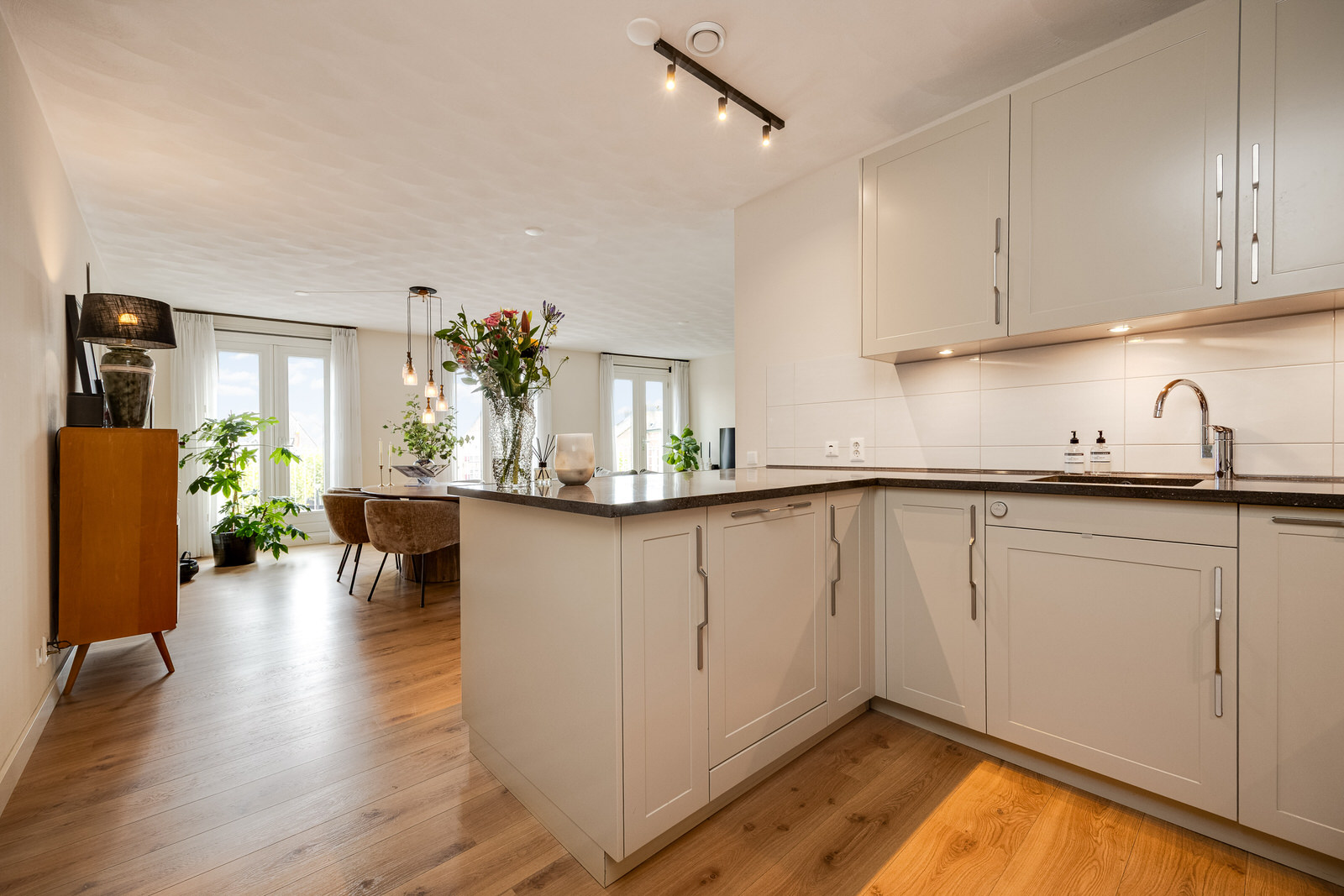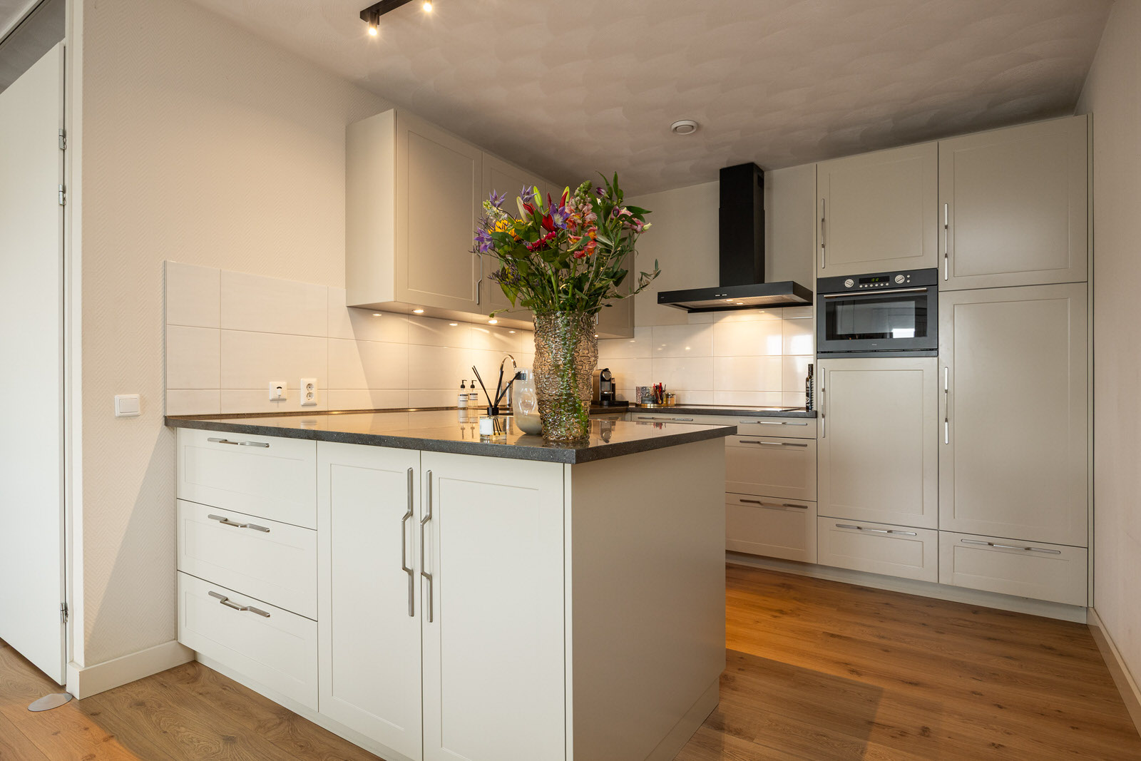 De open keuken vormt een sfeervol geheel met de woonkamer en is in 2010 vernieuwd. De keuken is op maat gemaakt en heeft een moderne uitstraling met lichte fronten en een werkblad van composiet. De keuken is voorzien van complete inbouwapparatuur, waaronder een inductiekookplaat (vernieuwd in 2023) met recirculatie-afzuigkap, combimagnetron, vaatwasser, koelkast en vriezer. Dankzij de ruime hoekopstelling is er volop kastruimte en werkruimte, wat zorgt voor een prettige en overzichtelijke indeling.