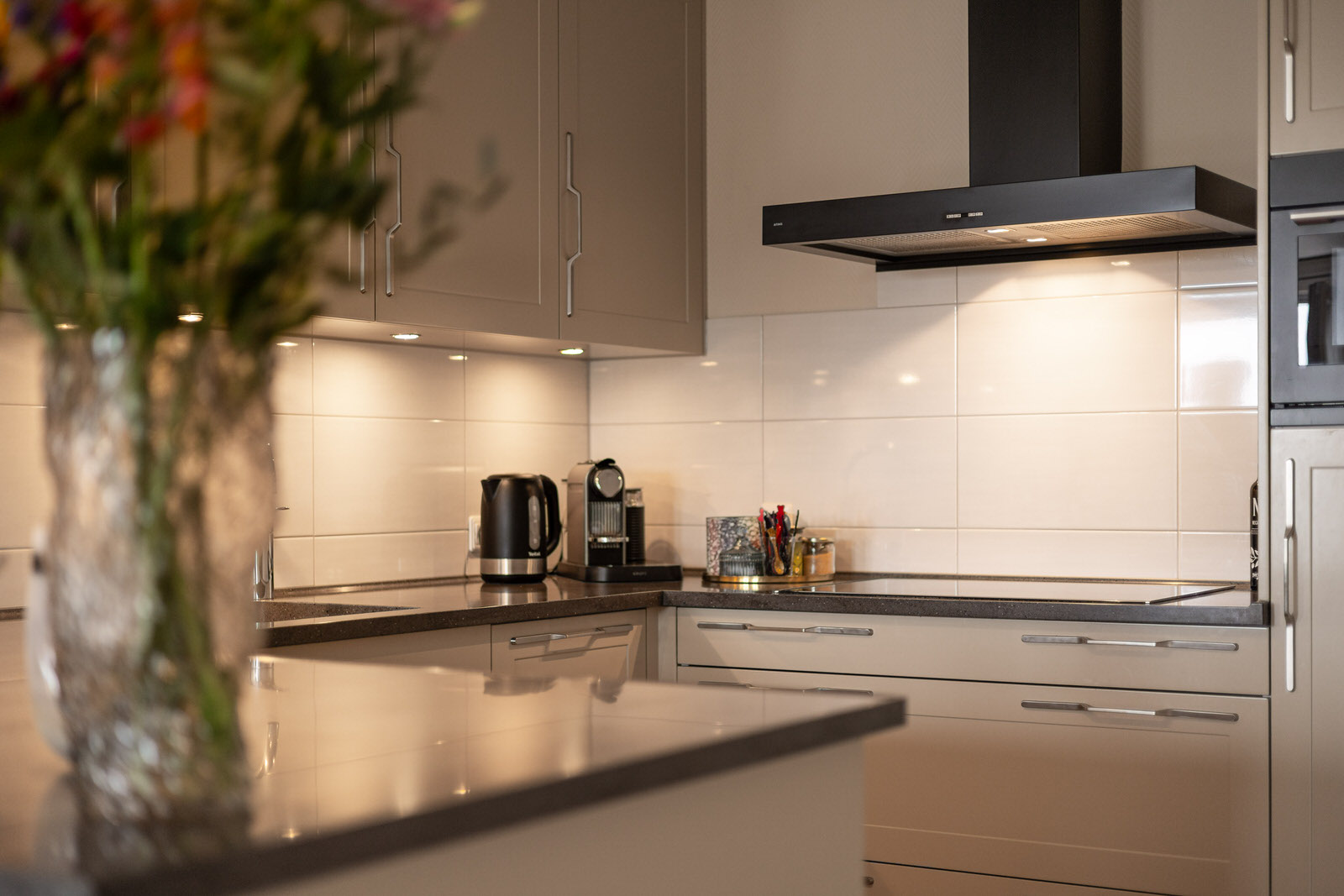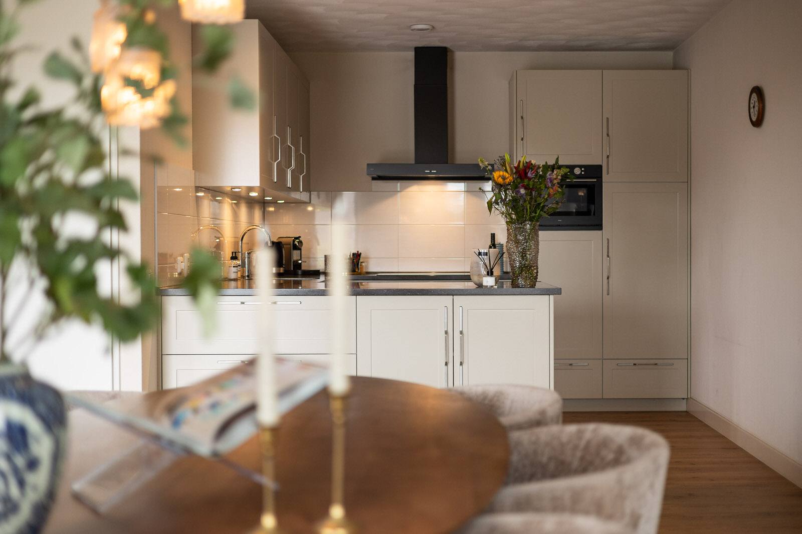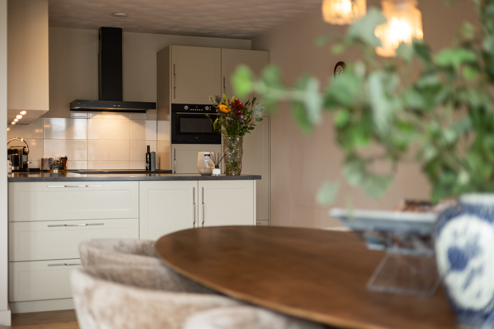 De open keuken vormt een sfeervol geheel met de woonkamer en is in 2010 vernieuwd. De keuken is op maat gemaakt en heeft een moderne uitstraling met lichte fronten en een werkblad van composiet. De keuken is voorzien van complete inbouwapparatuur, waaronder een inductiekookplaat (vernieuwd in 2023) met recirculatie-afzuigkap, combimagnetron, vaatwasser, koelkast en vriezer. Dankzij de ruime hoekopstelling is er volop kastruimte en werkruimte, wat zorgt voor een prettige en overzichtelijke indeling.