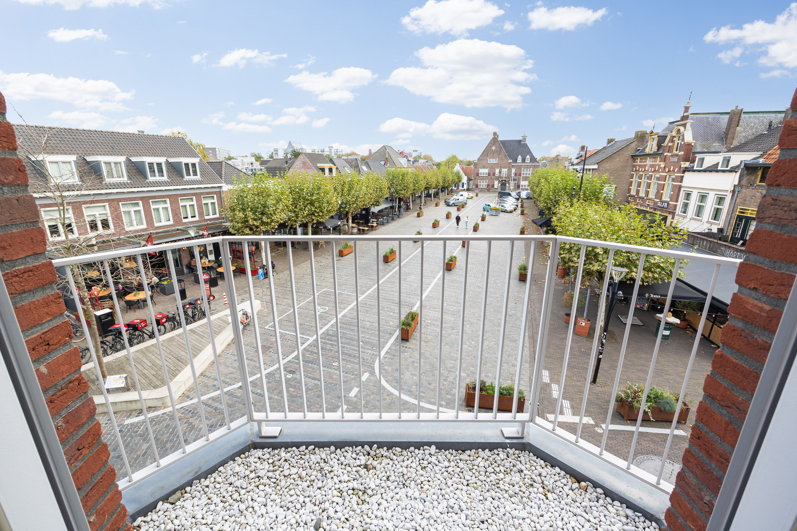 De woonkamer is zonder twijfel het kloppend hart van het appartement. Dankzij de drie dubbele deuren, waarvan twee met Frans balkon en één met toegang tot het balkon, valt er volop licht binnen. De deuren zijn voorzien van handmatige bedienbare screens. Het gevoel van ruimte wordt versterkt door de open indeling en het vrije uitzicht op de Markt. De woonkamer biedt plek aan een royale zithoek en een grote eettafel, waarbij de warme laminaatvloer en lichte wanden zorgen voor een eigentijdse, rustige basis. Vanuit hier ervaar je de levendigheid van het centrum, maar met de rust en het comfort van een modern appartement.