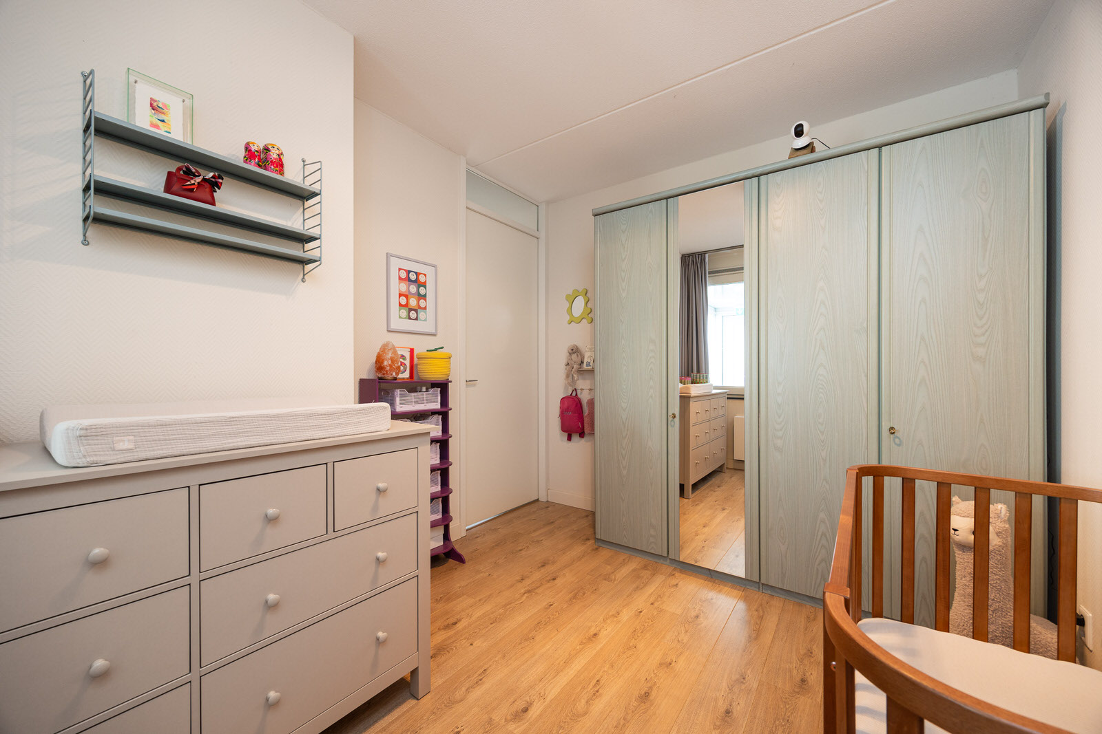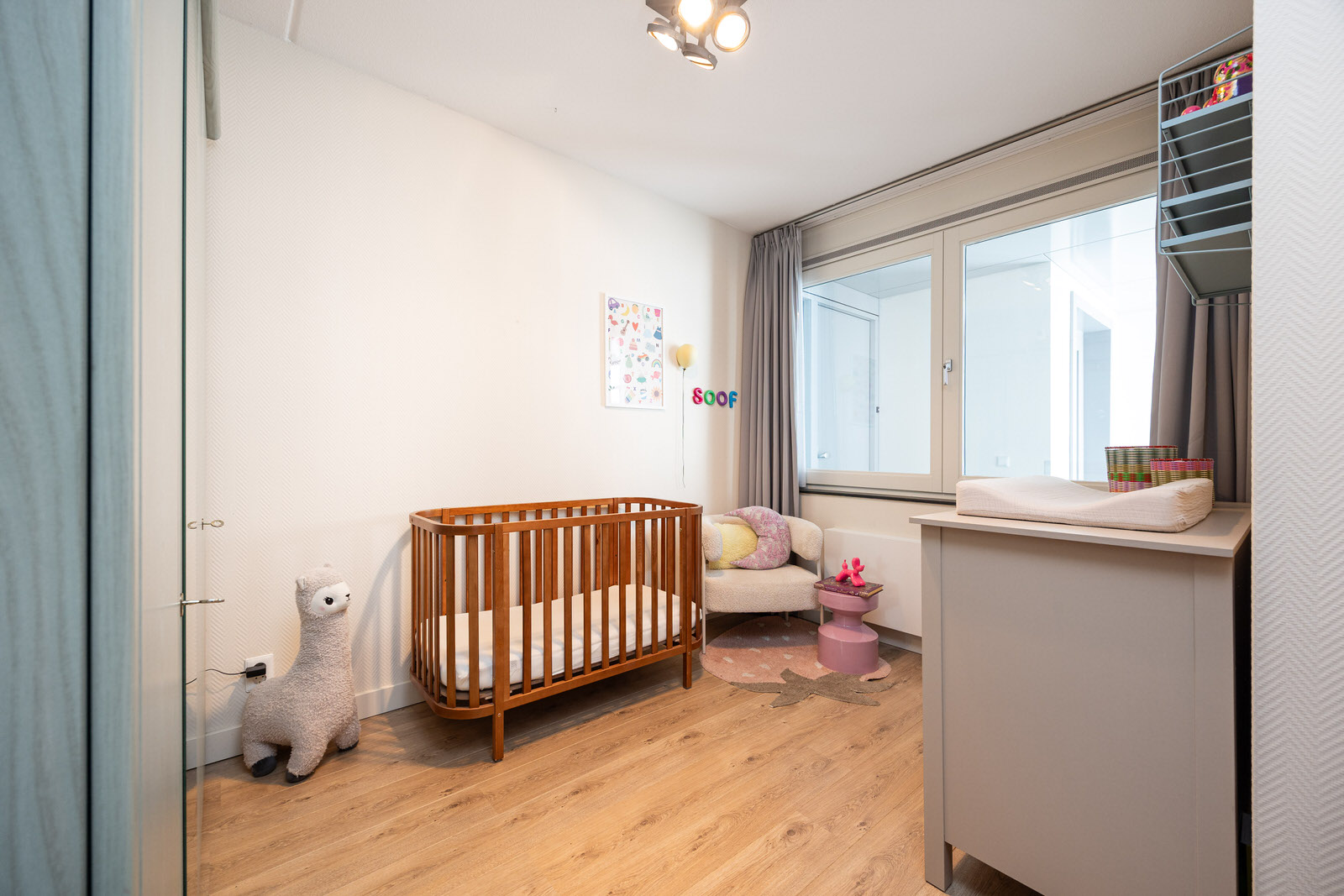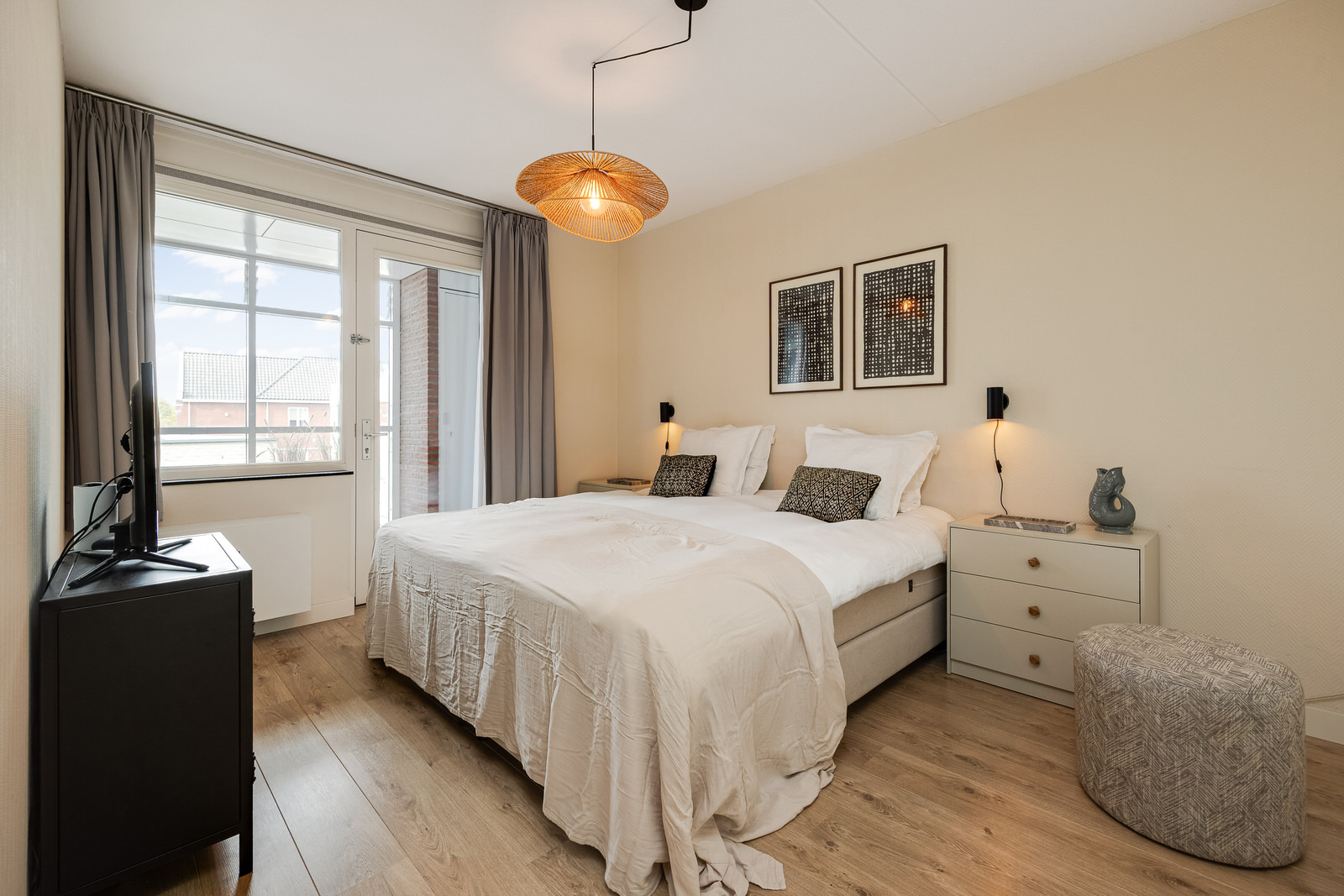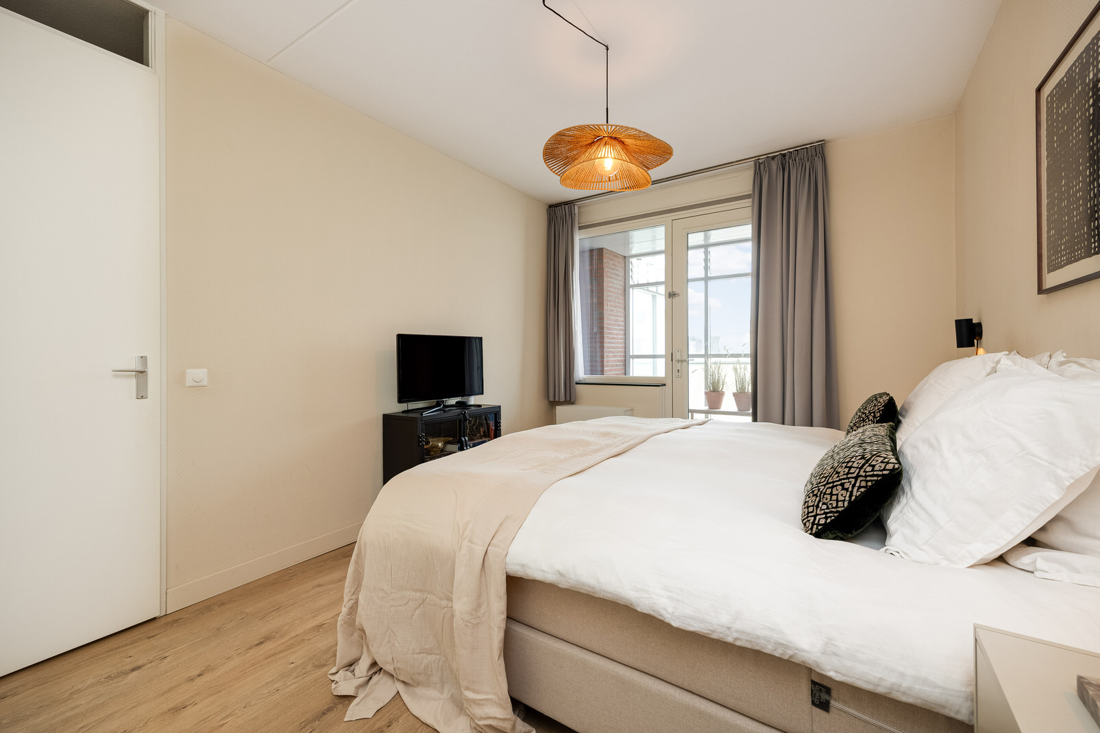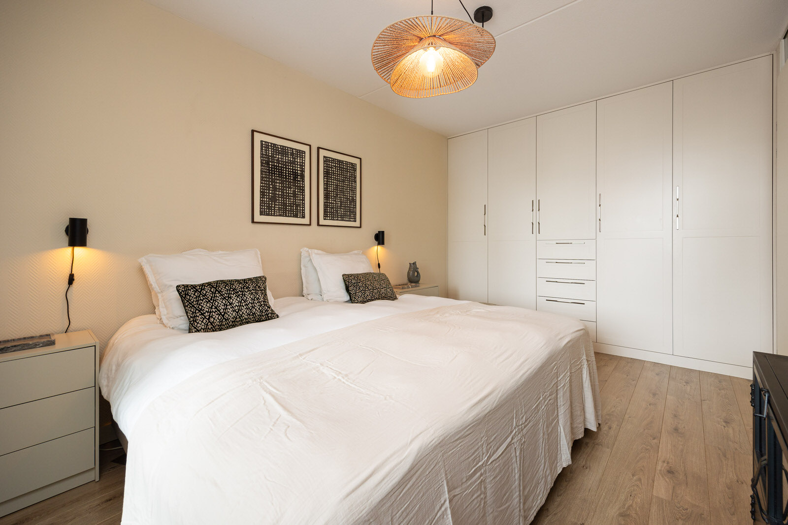 Het appartement beschikt over twee comfortabele slaapkamers. De hoofdslaapkamer ligt aan de rustige zijde van het complex en biedt voldoende ruimte aan een tweepersoonsbed en een grote op maat gemaakte kast. De tweede slaapkamer is ideaal als logeer- of werkkamer. Beide kamers zijn keurig afgewerkt en voorzien van een doorlopende laminaatvloer.