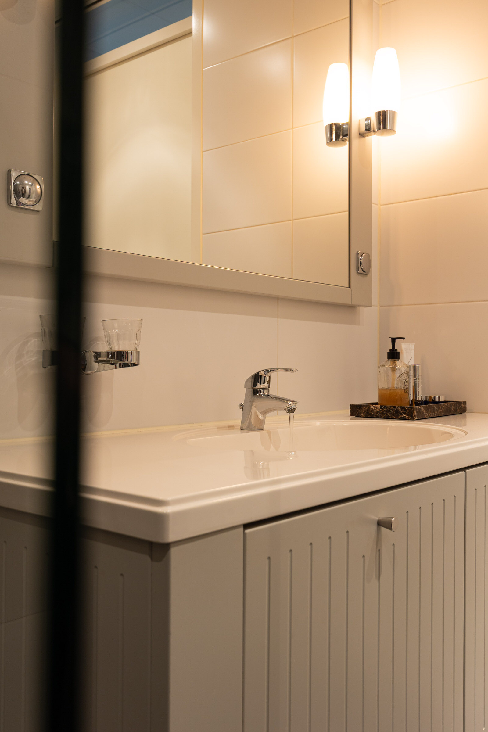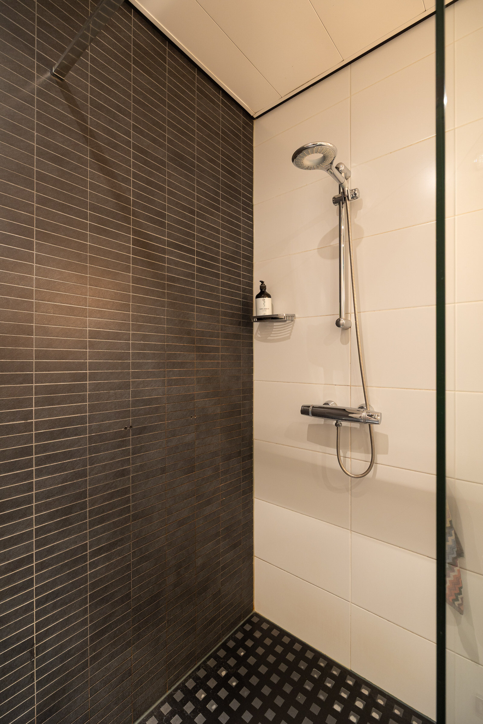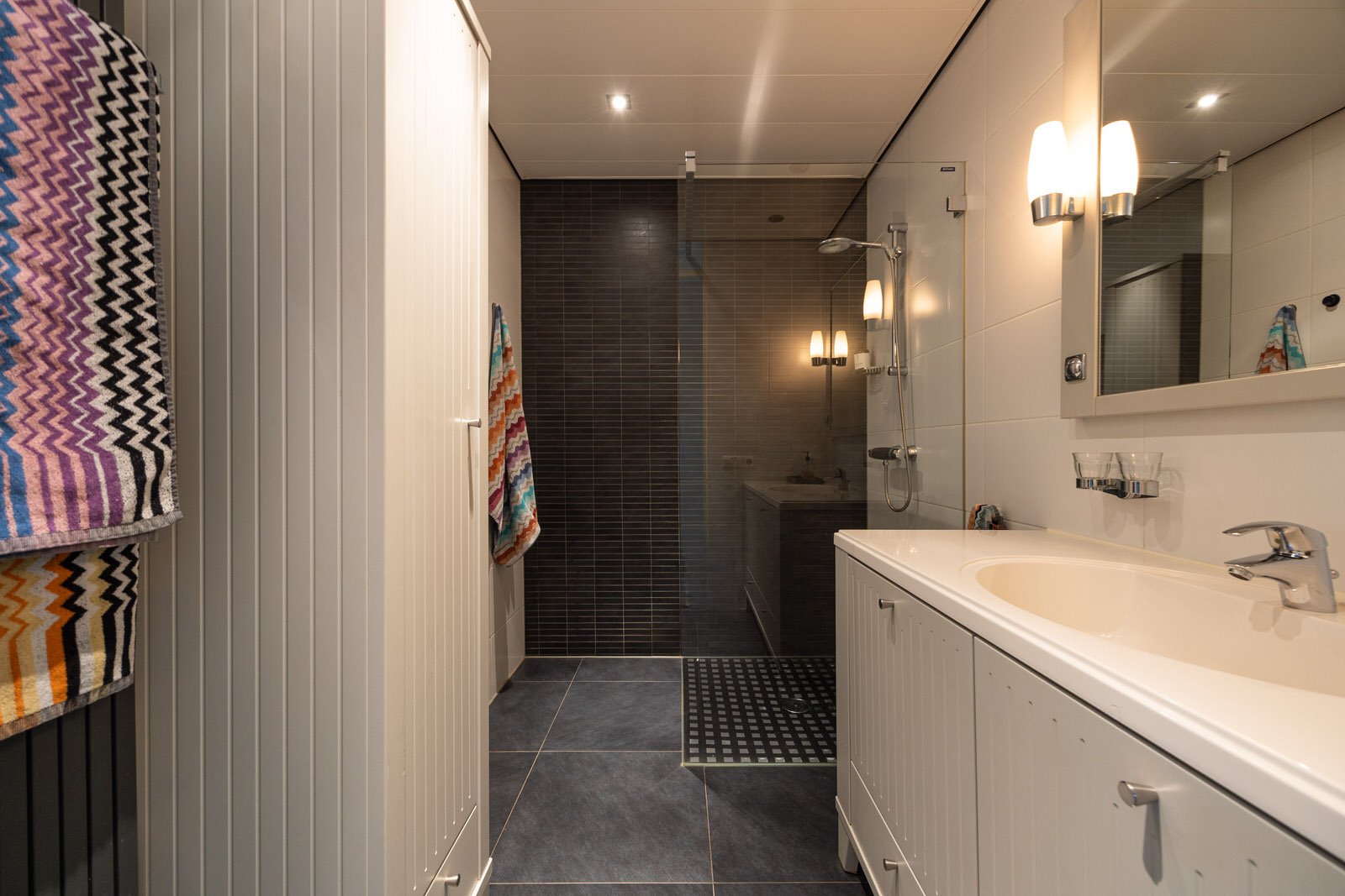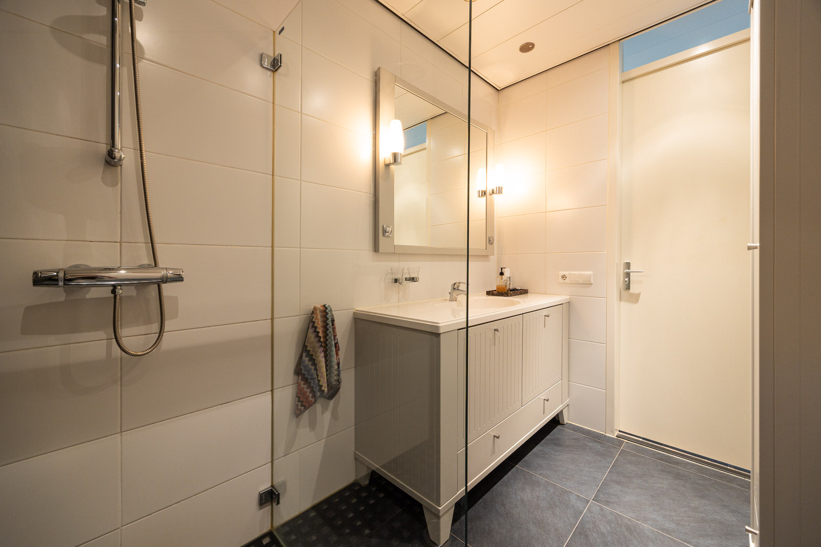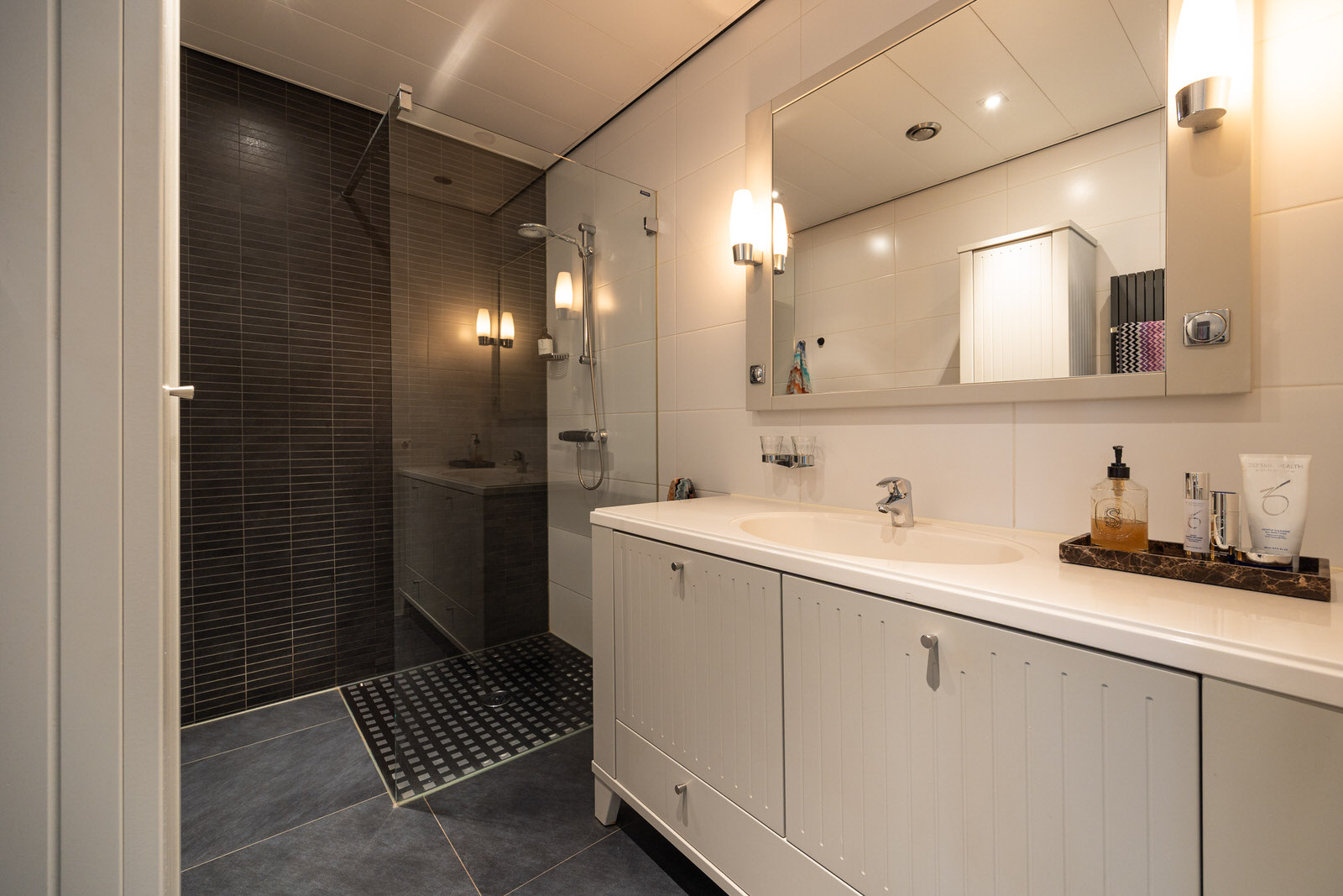 De badkamer is royaal van formaat en uitgevoerd in tijdloze tinten. Er is een ruime inloopdouche met thermostatische kraan en een wastafelmeubel met spiegel. Het aluminium plafond is voorzien van inbouwspots en ingebouwde speakers, waarop via een afstandsbediening radio kan worden afgespeeld. Een goed onderhouden en comfortabele ruimte met een verzorgde uitstraling.