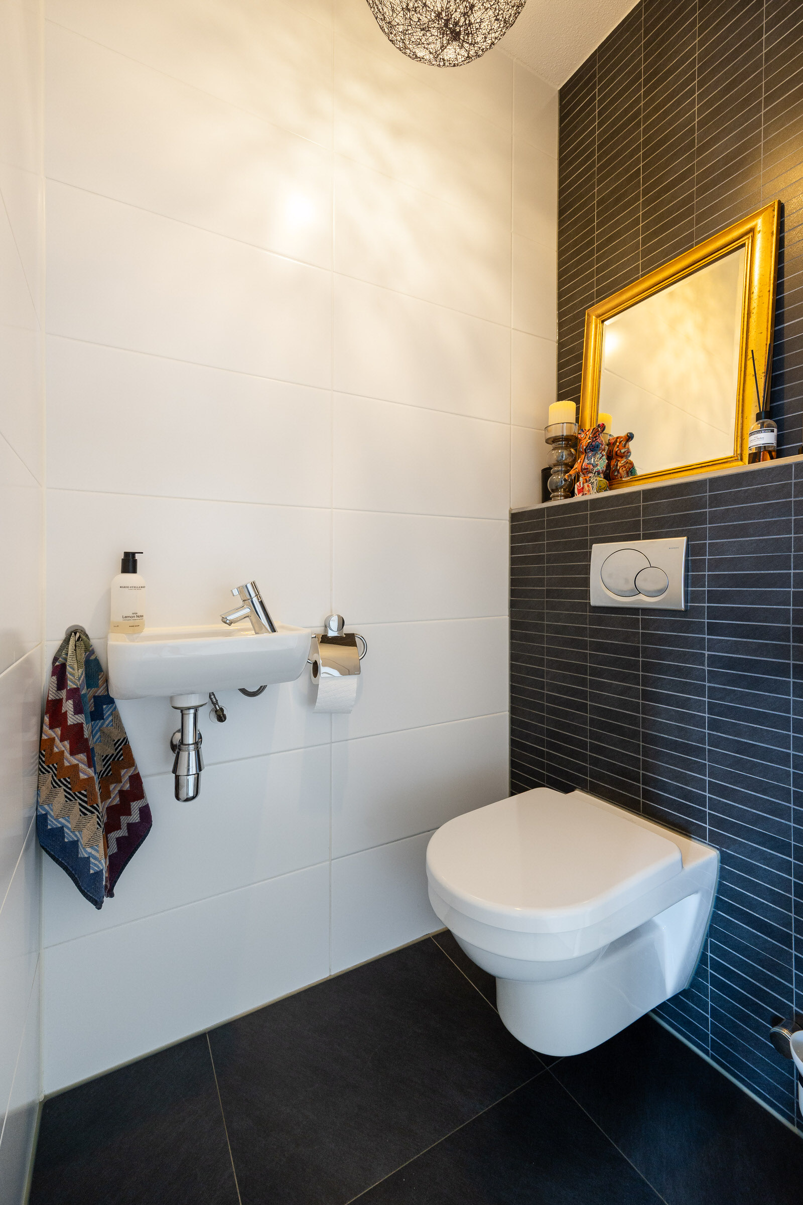De moderne toiletruimte is uitgevoerd in neutrale tinten en voorzien van een wandcloset en fontein.