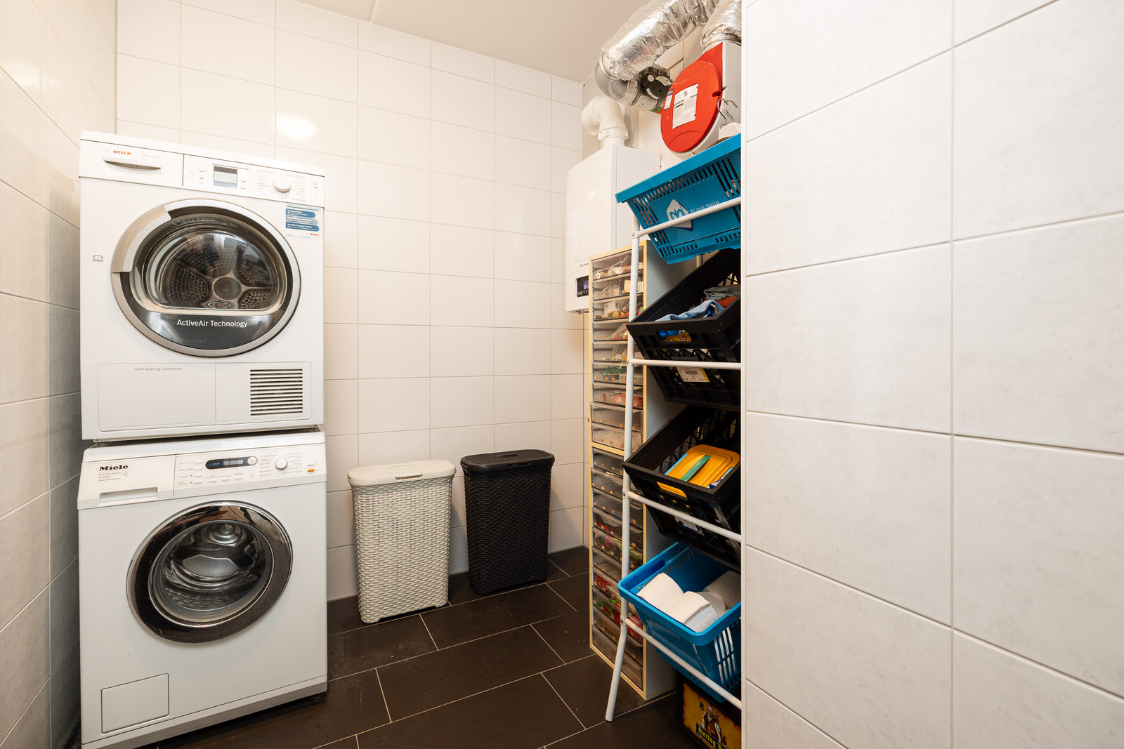 Aan het einde van de gang bevindt zich een praktische inpandige berging met de aansluitingen voor de wasmachine en droger, de opstelling van de cv-installatie (Remeha Tzerra Ace-Matic 28c, 2024) en de mechanische ventilatie met vernieuwde motor (2019).