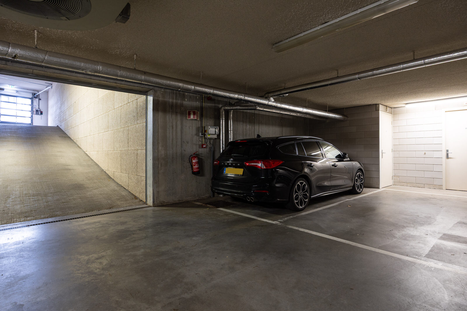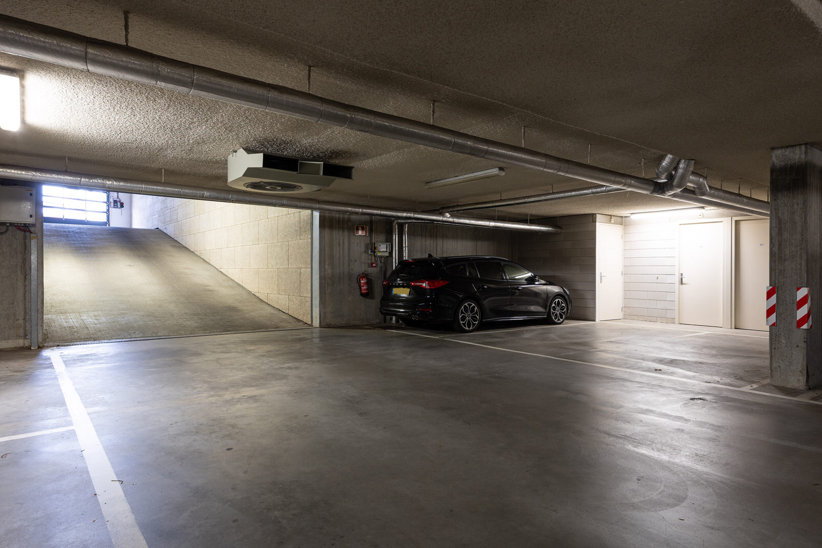 Bij het appartement horen een eigen berging (circa 2,30 x 3,61 meter) en een vaste parkeerplaats (circa 2,45 x 4,92 meter) in de afgesloten parkeergarage onder het gebouw. De garage is uitsluitend toegankelijk voor bewoners en wordt elektrisch bediend. Extra prettig: met de lift ben je rechtstreeks van de parkeergarage bij je appartement.