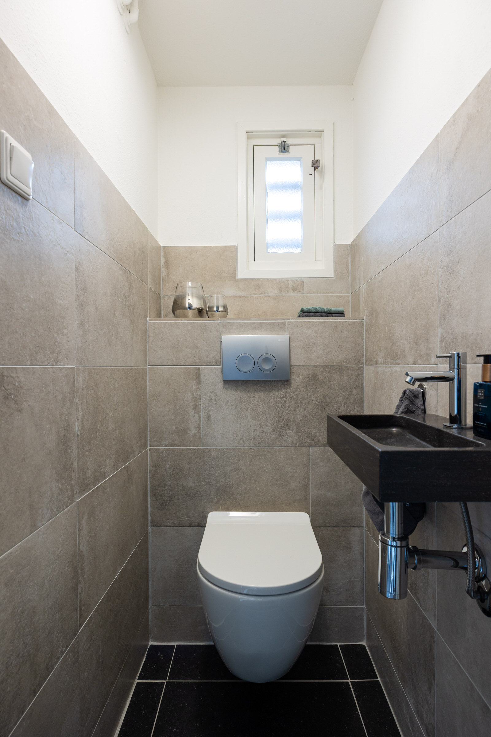 De moderne toiletruimte is voorzien van een zwevend closet en fonteintje.