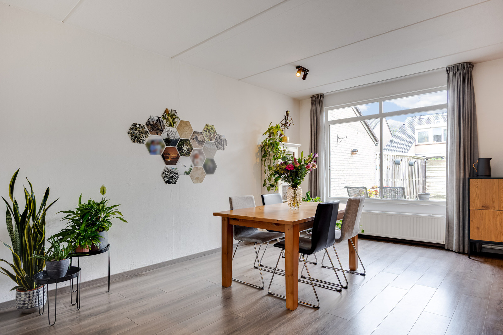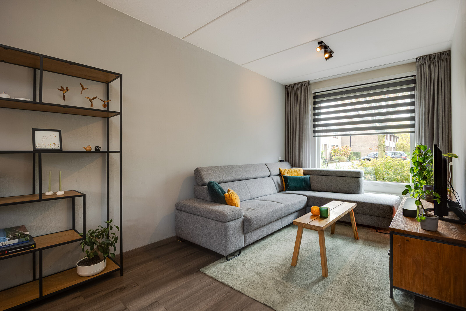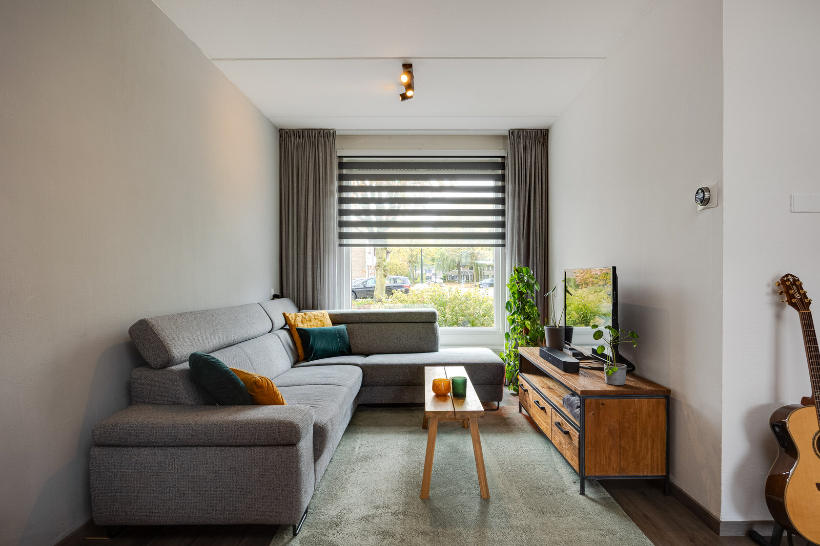 De woonkamer is licht en sfeervol dankzij de grote ramen aan zowel de voor- als achterzijde. De ruimte heeft een praktische rechthoekige indeling waardoor er gemakkelijk verschillende woonopstellingen mogelijk zijn. Aan de voorzijde bevindt zich de zithoek met vrij uitzicht op de straat; aan de tuinzijde is plaats voor een ruime eettafel. De nette laminaatvloer en de neutrale wandafwerking zorgen voor een warme en rustige basis, passend bij uiteenlopende interieurstijlen.