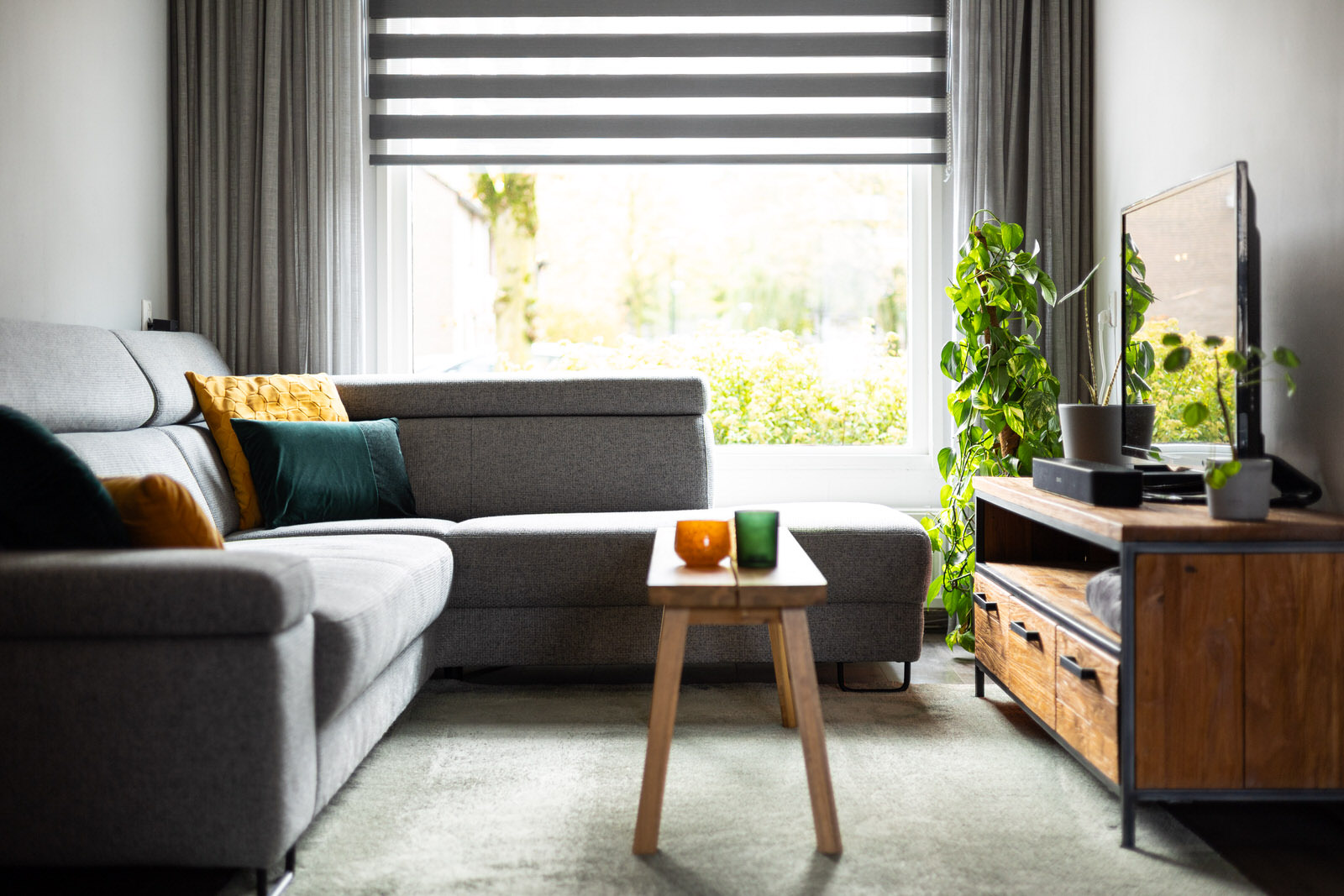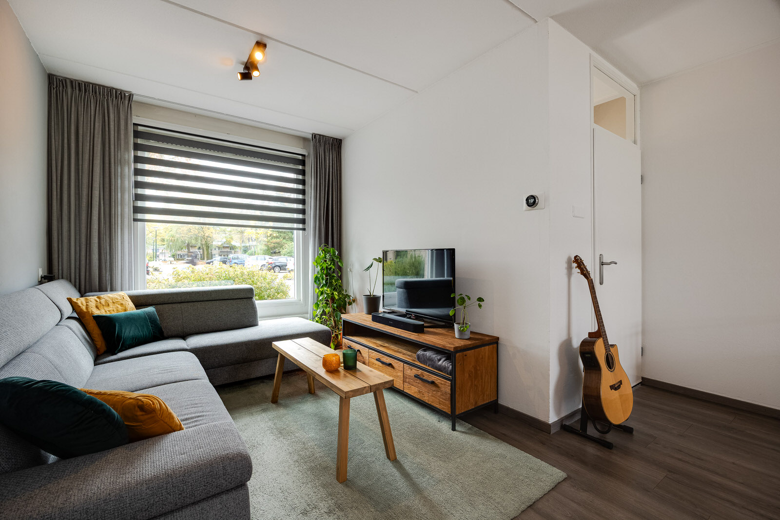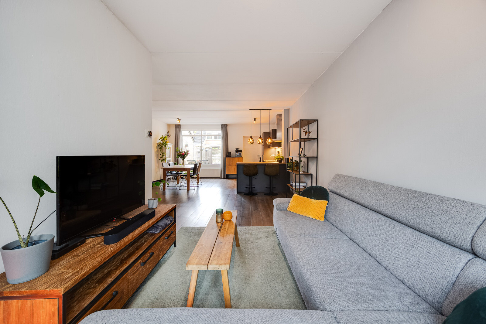 De woonkamer is licht en sfeervol dankzij de grote ramen aan zowel de voor- als achterzijde. De ruimte heeft een praktische rechthoekige indeling waardoor er gemakkelijk verschillende woonopstellingen mogelijk zijn. Aan de voorzijde bevindt zich de zithoek met vrij uitzicht op de straat; aan de tuinzijde is plaats voor een ruime eettafel. De nette laminaatvloer en de neutrale wandafwerking zorgen voor een warme en rustige basis, passend bij uiteenlopende interieurstijlen.