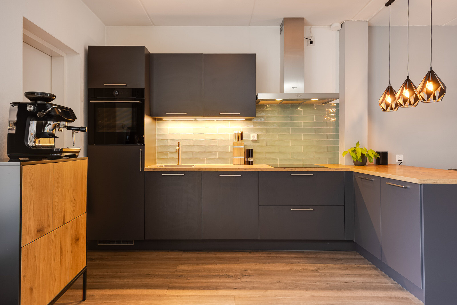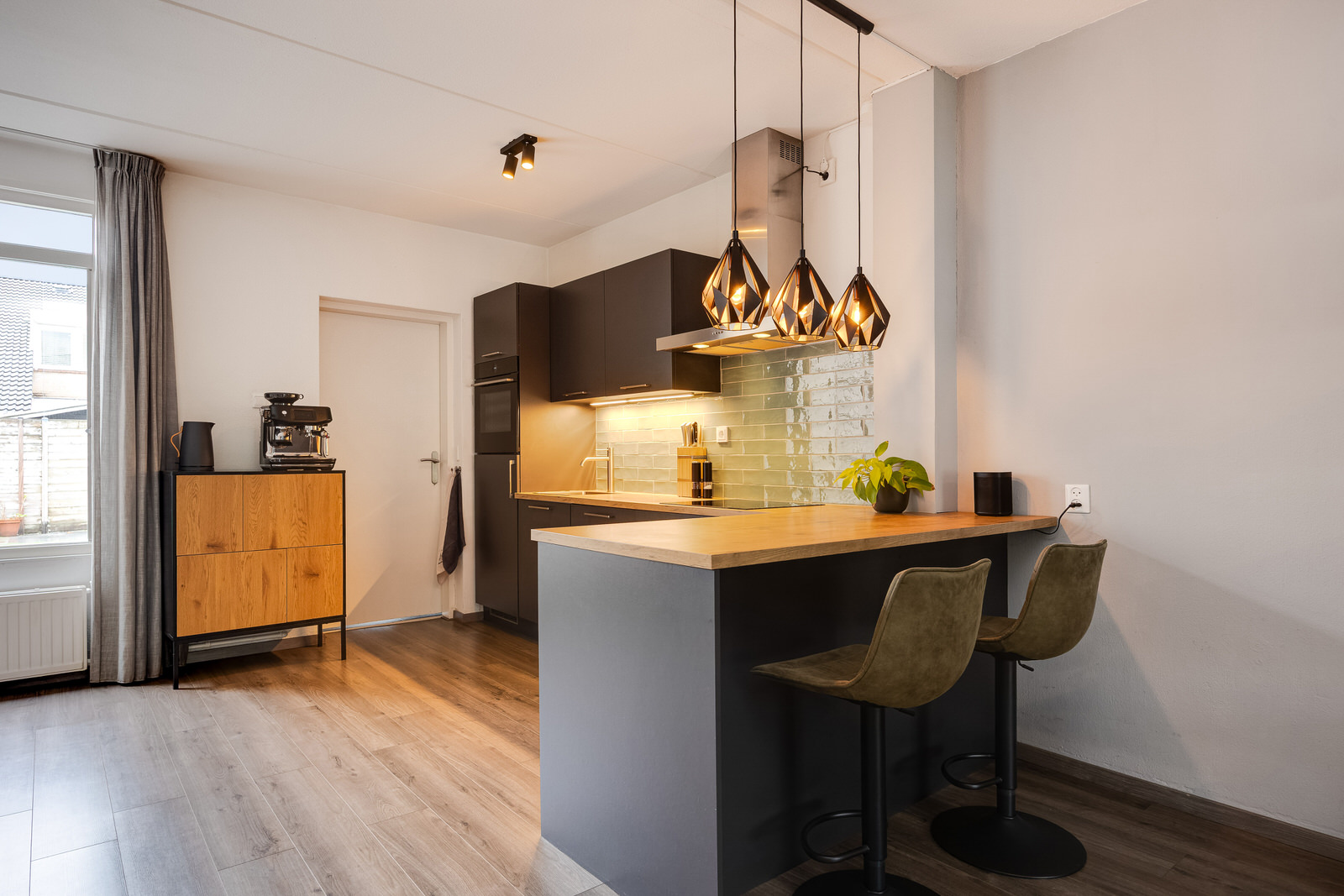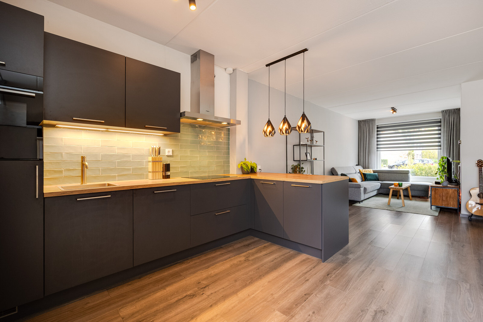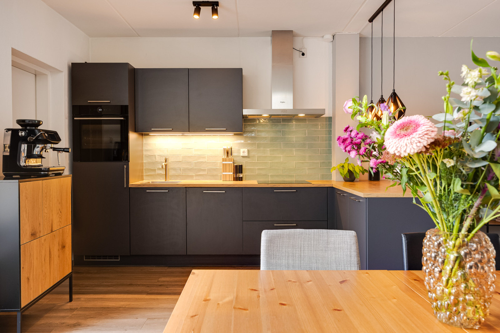 Aan de achterzijde bevindt zich de moderne keuken, geplaatst in 2019. De combinatie van houttinten en antracietkleurige fronten geeft de keuken een eigentijdse uitstraling. Er is gekozen voor een praktische opstelling met veel kastruimte en werkbladoppervlak. De keuken is voorzien van een inductiekookplaat, afzuigkap, oven, koelkast, vaatwasser en spoelbak. Dankzij de directe verbinding met de woonkamer is het een aangename en lichte plek om te koken en te tafelen.