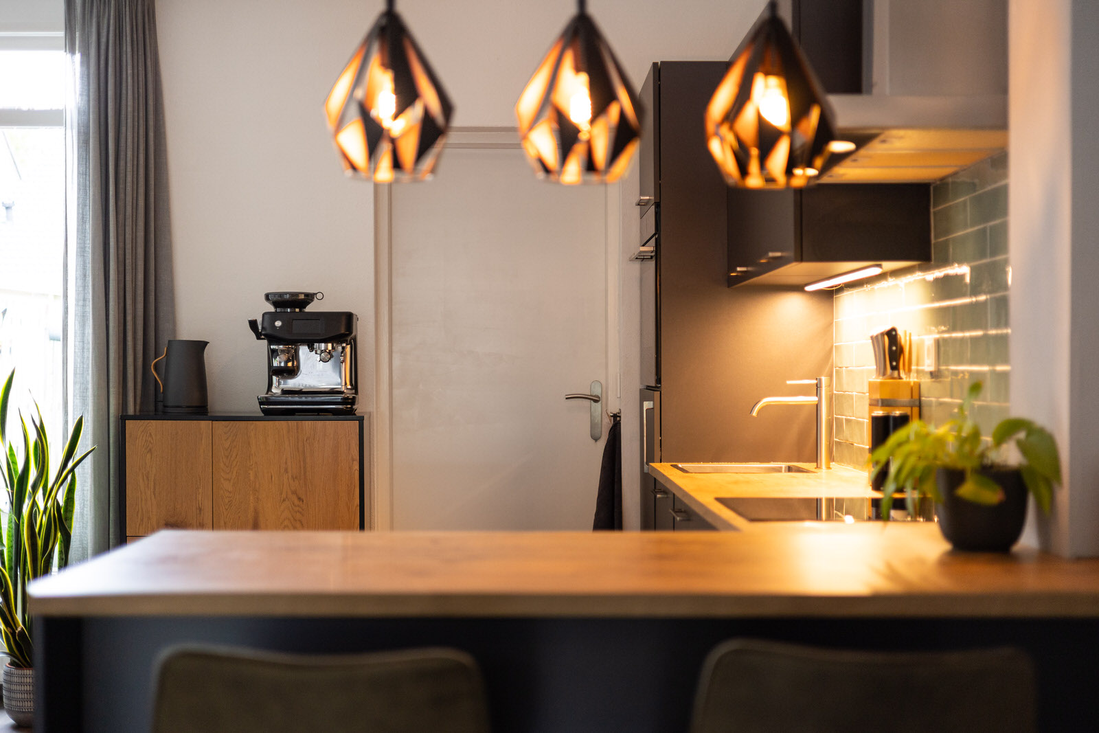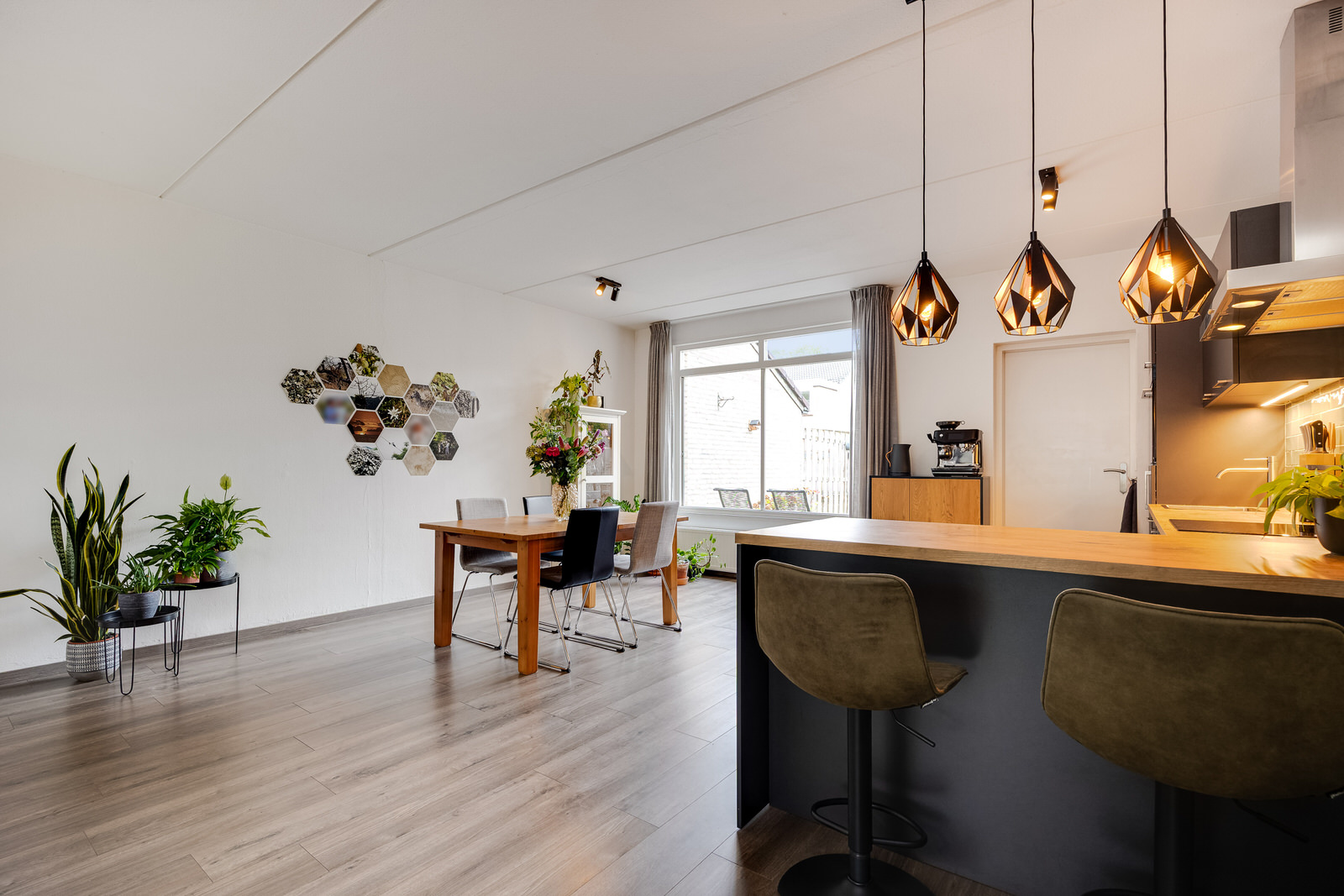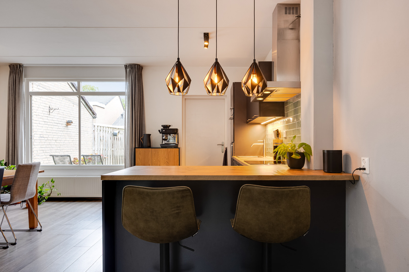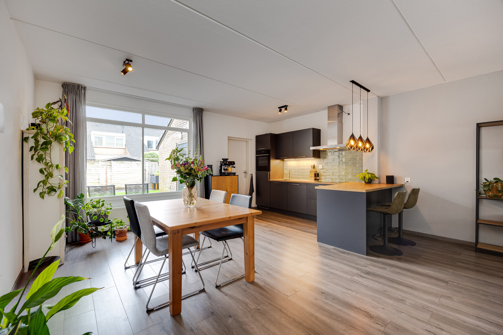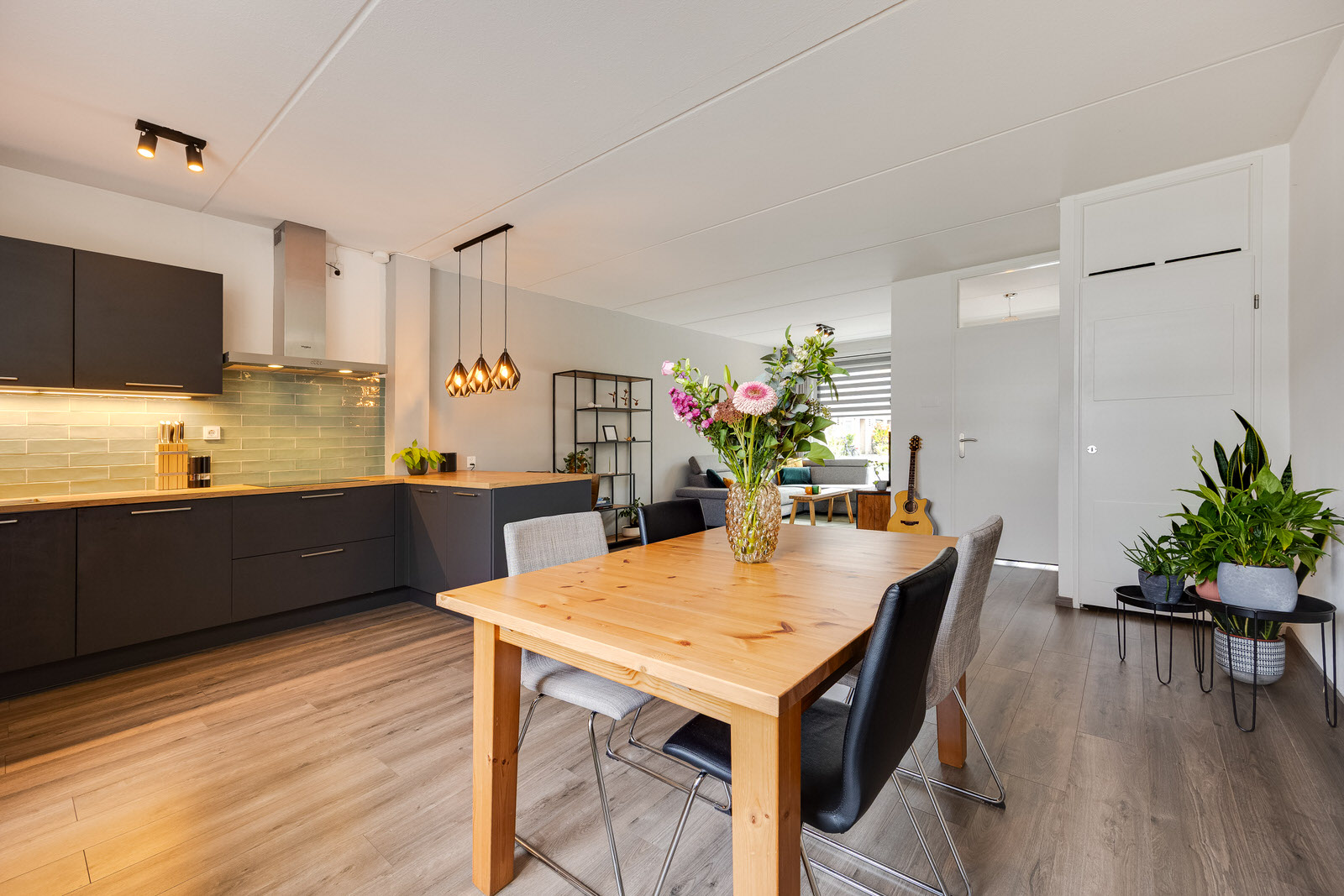 Aan de achterzijde bevindt zich de moderne keuken, geplaatst in 2019. De combinatie van houttinten en antracietkleurige fronten geeft de keuken een eigentijdse uitstraling. Er is gekozen voor een praktische opstelling met veel kastruimte en werkbladoppervlak. De keuken is voorzien van een inductiekookplaat, afzuigkap, oven, koelkast, vaatwasser en spoelbak. Dankzij de directe verbinding met de woonkamer is het een aangename en lichte plek om te koken en te tafelen.