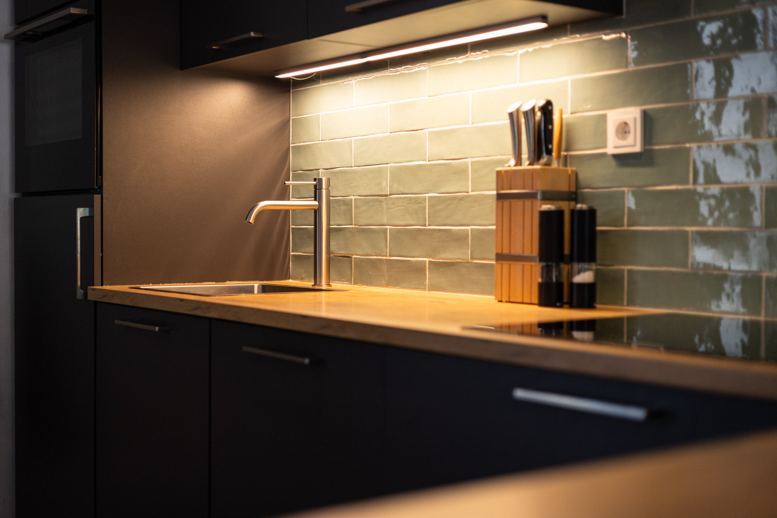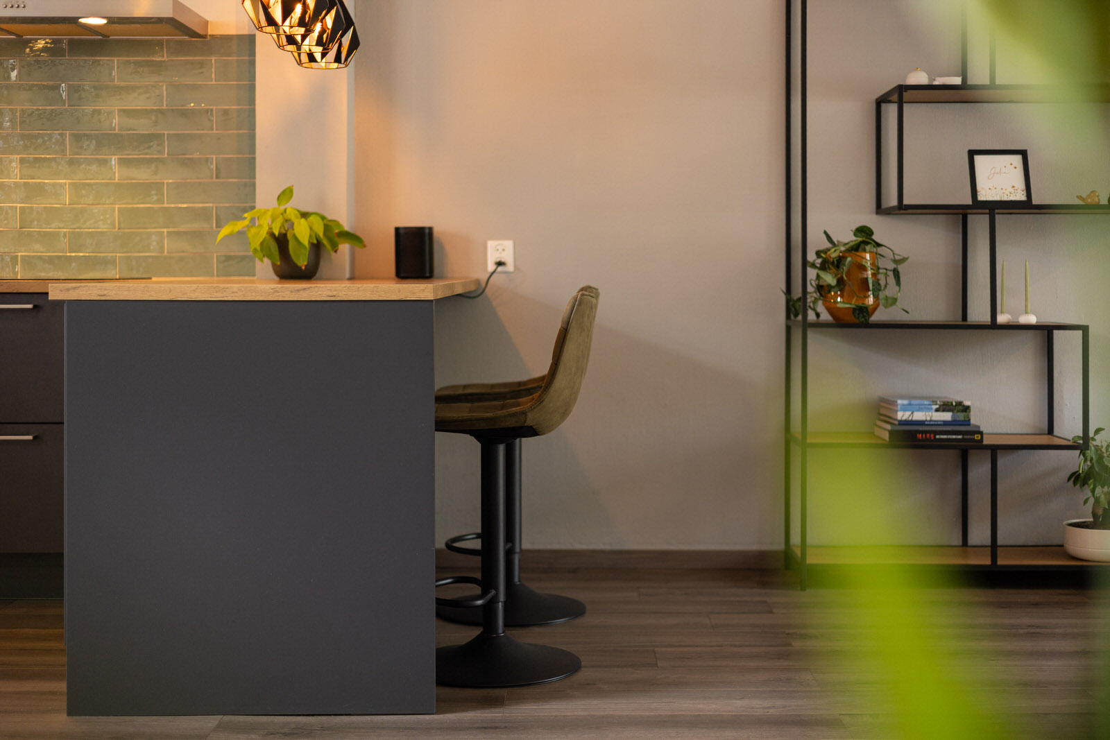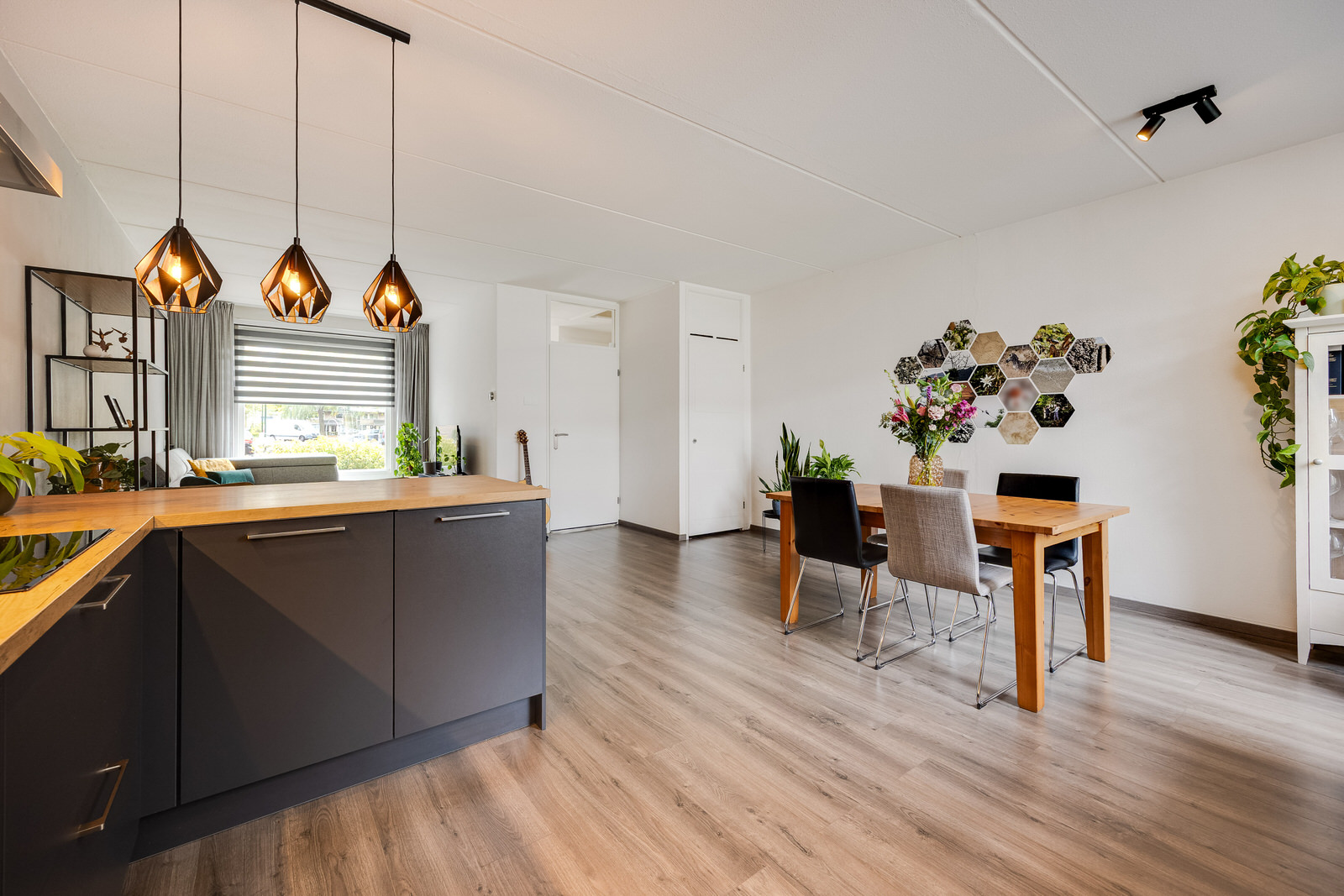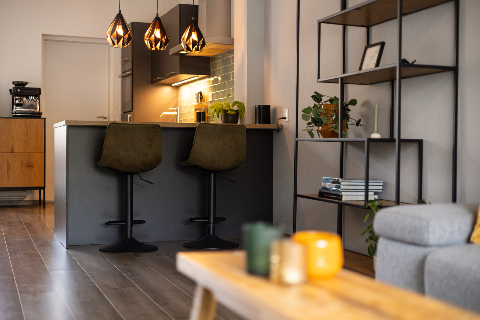 Aan de achterzijde bevindt zich de moderne keuken, geplaatst in 2019. De combinatie van houttinten en antracietkleurige fronten geeft de keuken een eigentijdse uitstraling. Er is gekozen voor een praktische opstelling met veel kastruimte en werkbladoppervlak. De keuken is voorzien van een inductiekookplaat, afzuigkap, oven, koelkast, vaatwasser en spoelbak. Dankzij de directe verbinding met de woonkamer is het een aangename en lichte plek om te koken en te tafelen.