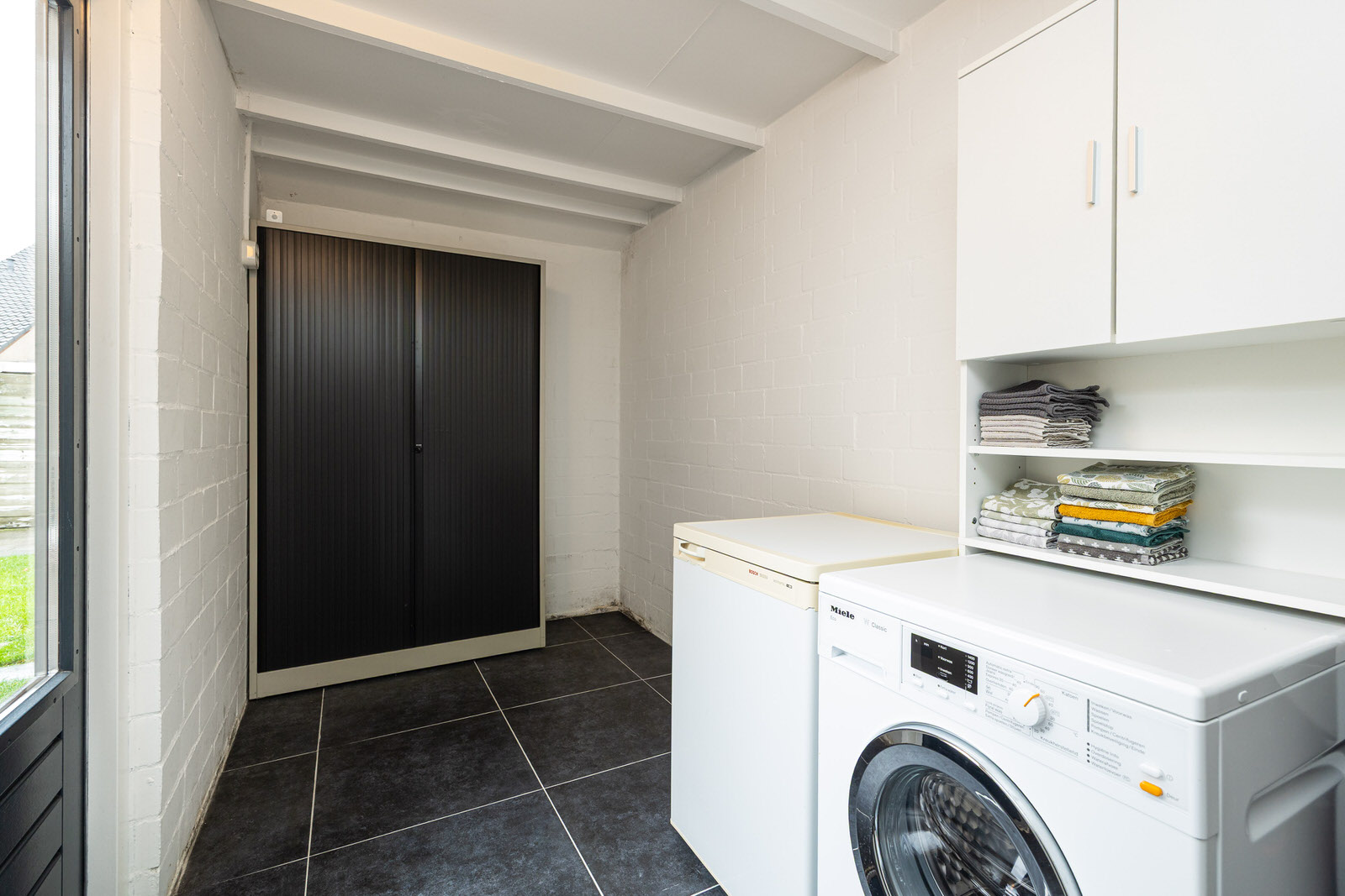 Aansluitend aan de keuken ligt de bijkeuken met witgoedaansluitingen, extra bergruimte en toegang tot de achtertuin. Deze ruimte is praktisch voor het plaatsen van wasapparatuur, vriezer of voorraadkasten en vormt een handige buffer tussen huis en tuin. Bovendien is er nog een luik dat toegang geeft tot een vliering.