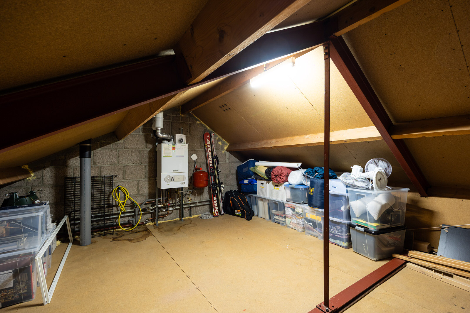 Via een vaste trap is de zolder bereikbaar. De ruime open verdieping is verrassend groot en biedt volop opbergruimte voor zaken die niet dagelijks nodig zijn. De cv-installatie (Vaillant HR Pro CW4, 2009) is hier opgesteld.