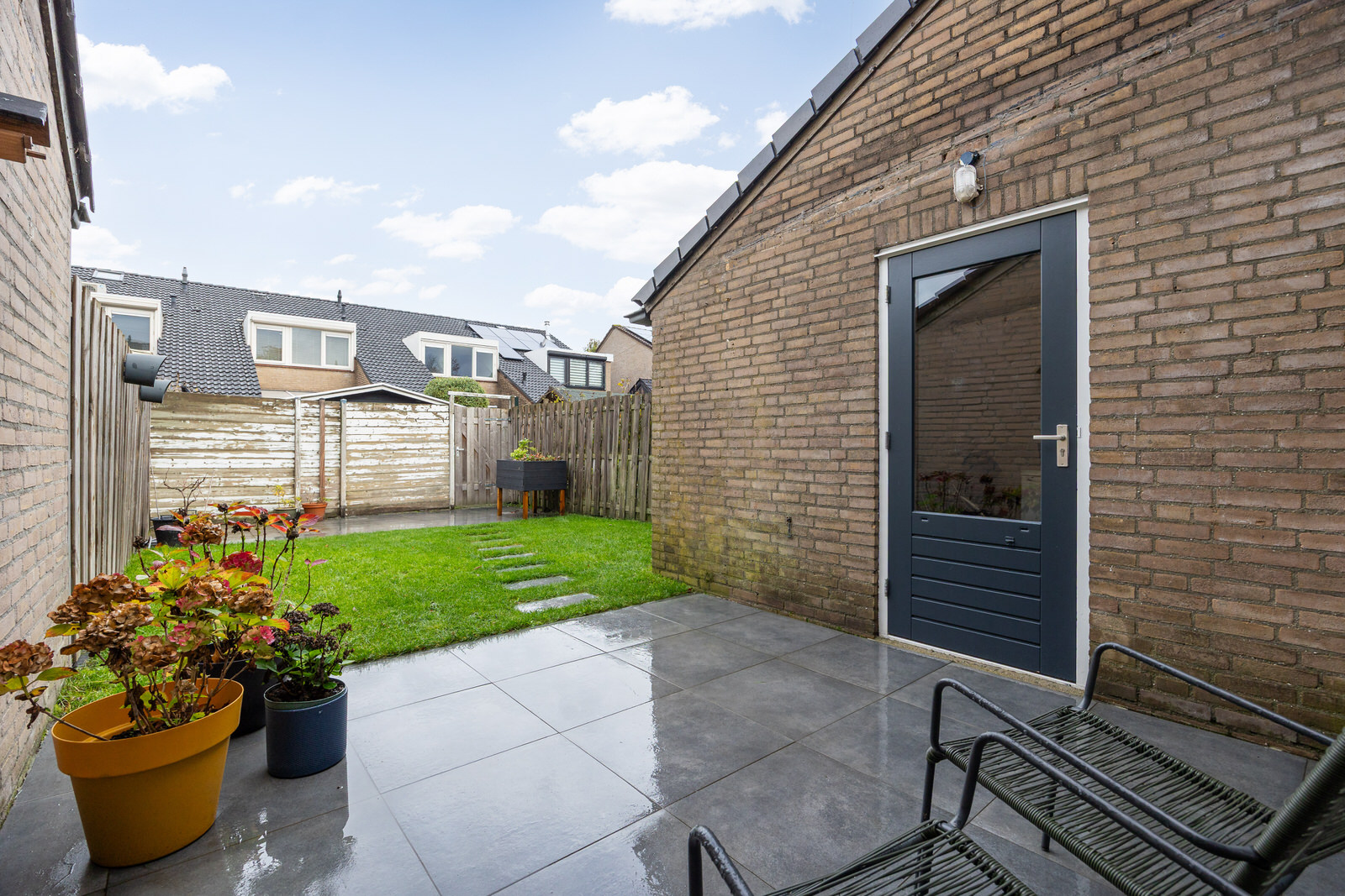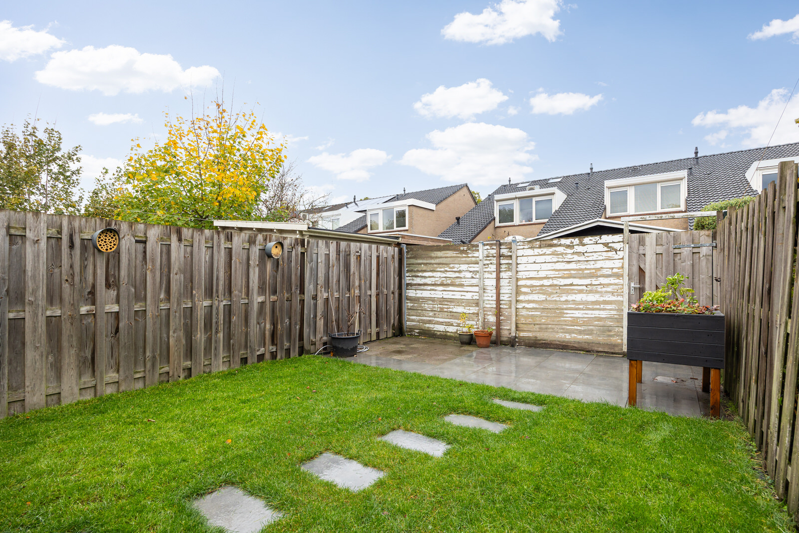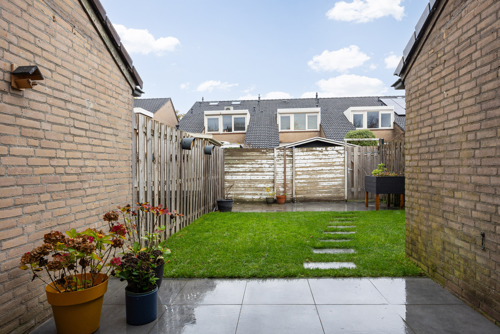 De achtertuin is verzorgd aangelegd en is voldoende diep, waardoor er tijdens zonnige dagen een plek in de zon of schaduw is. Direct achter de woning ligt een ruim terras, ideaal voor een loungeset of buitentafel met stoelen. Verder bestaat de tuin uit bestrating en een gazon. Via de achterom is de tuin goed bereikbaar. Ook de voortuin is netjes aangelegd en draagt bij aan het verzorgde straatbeeld.