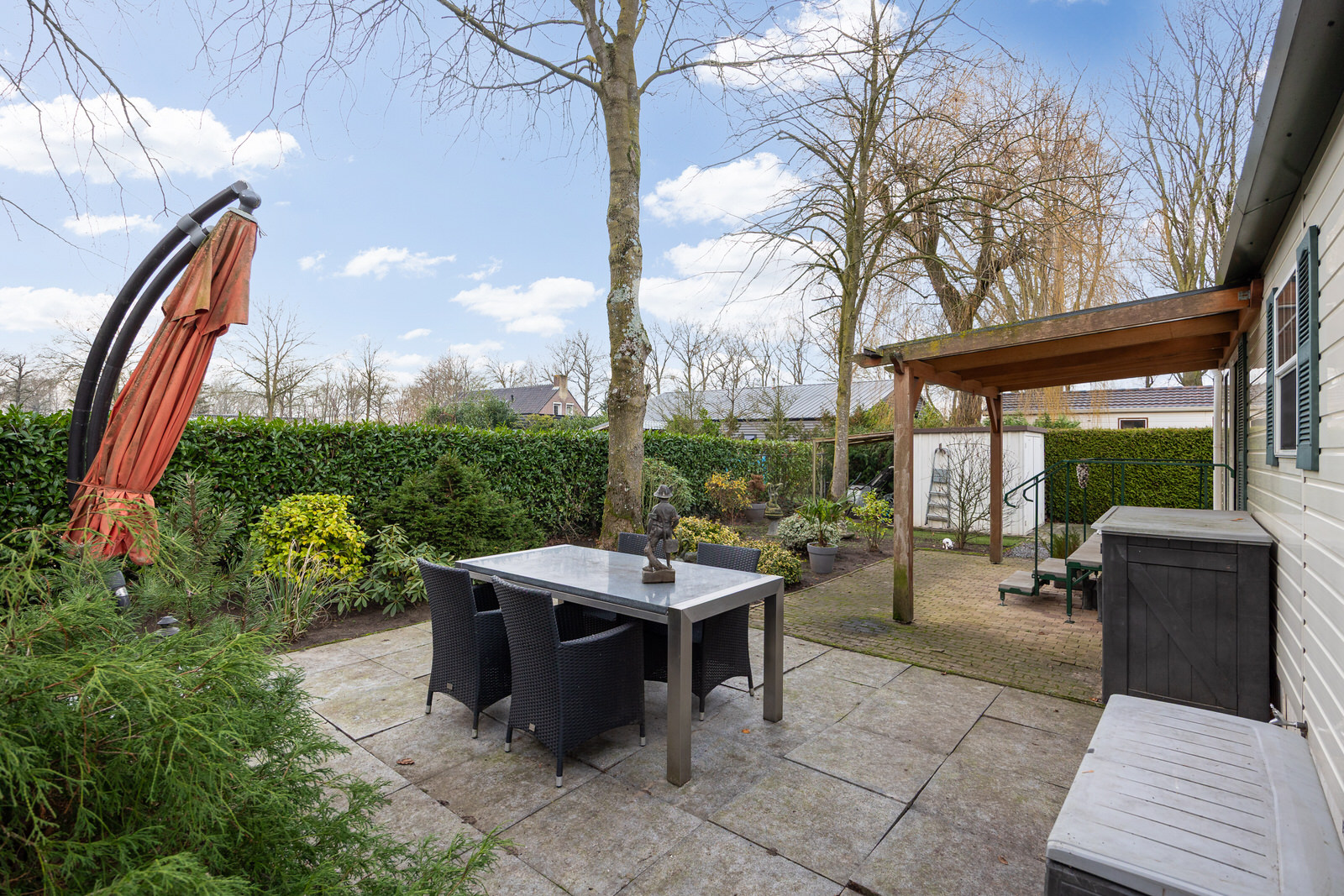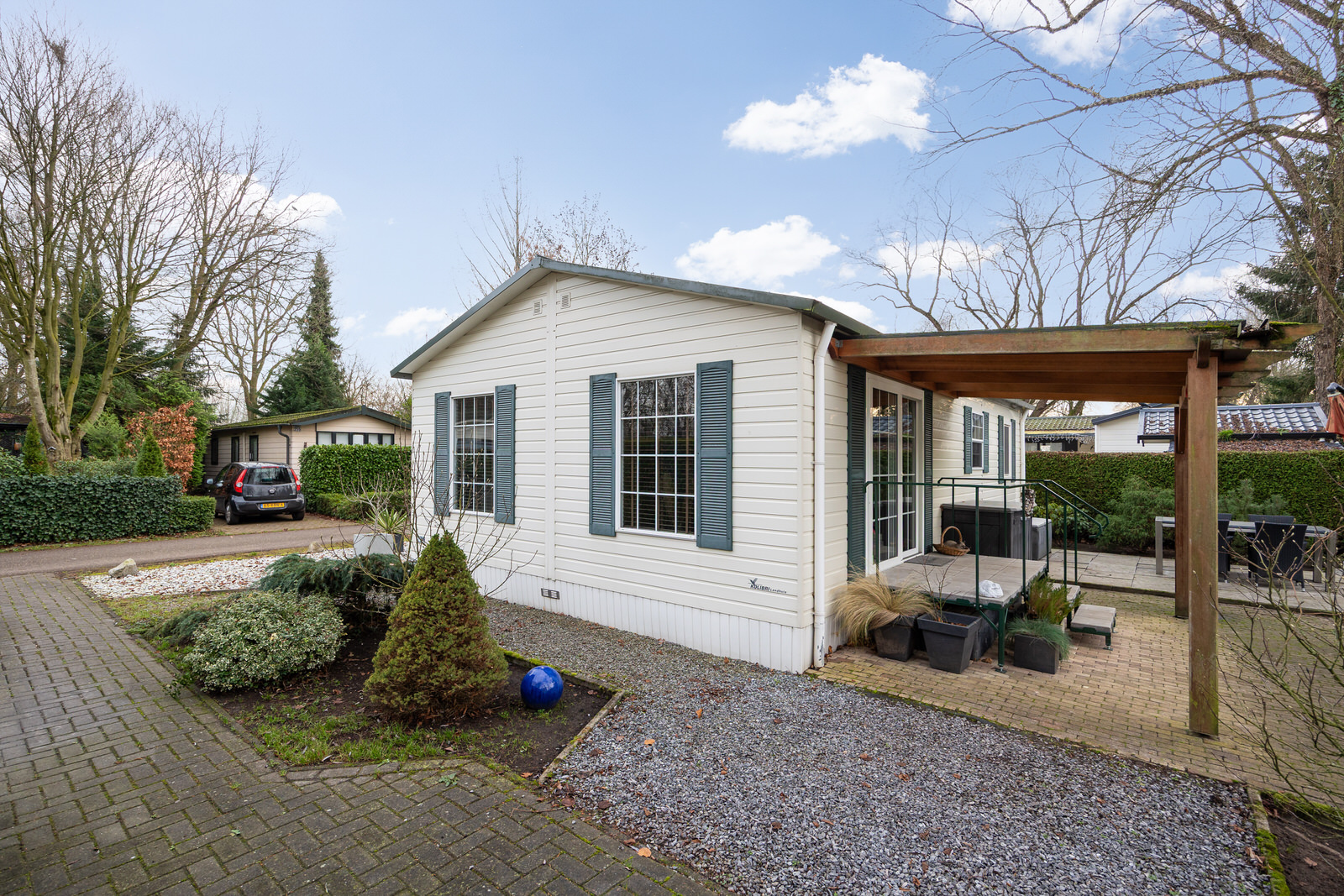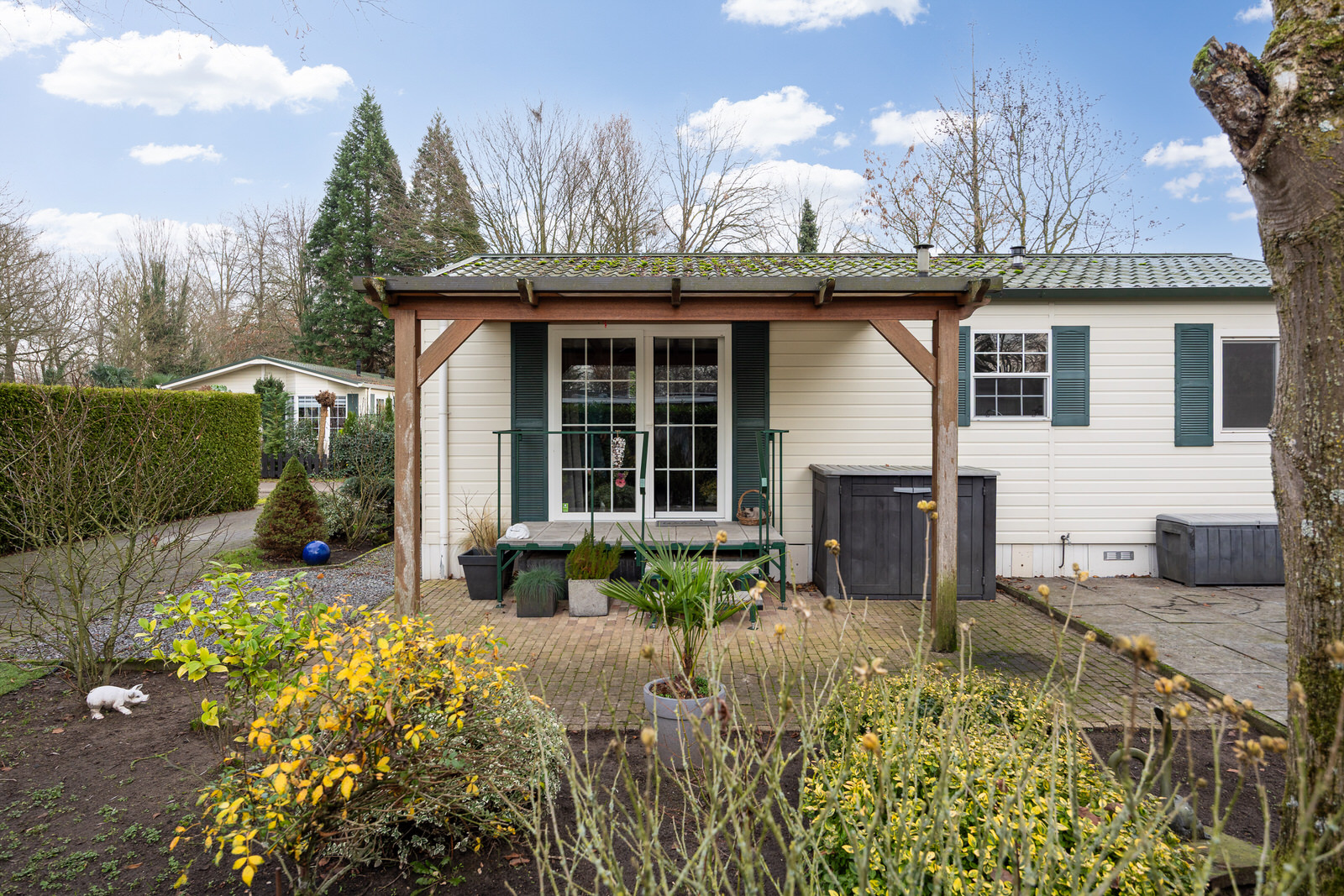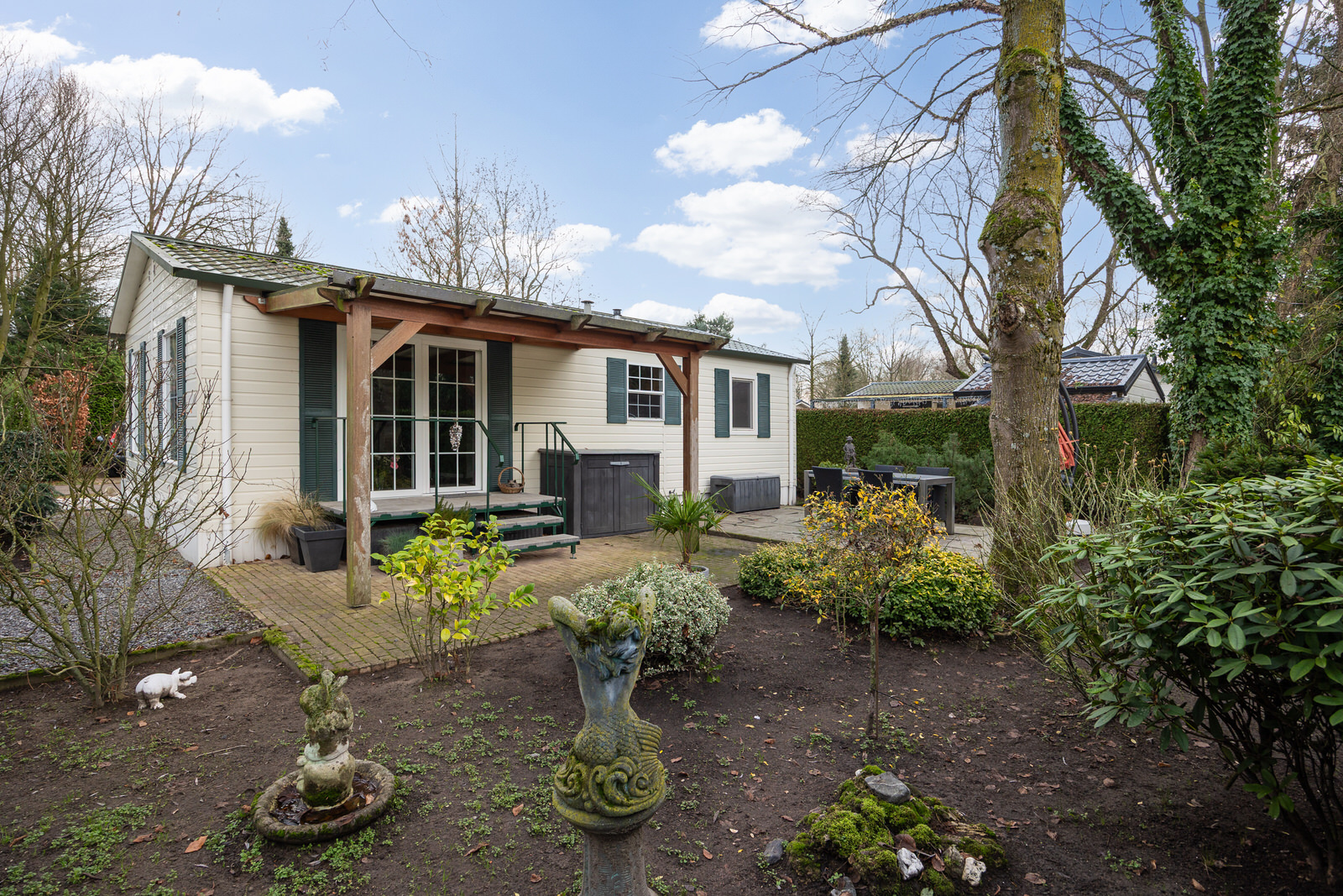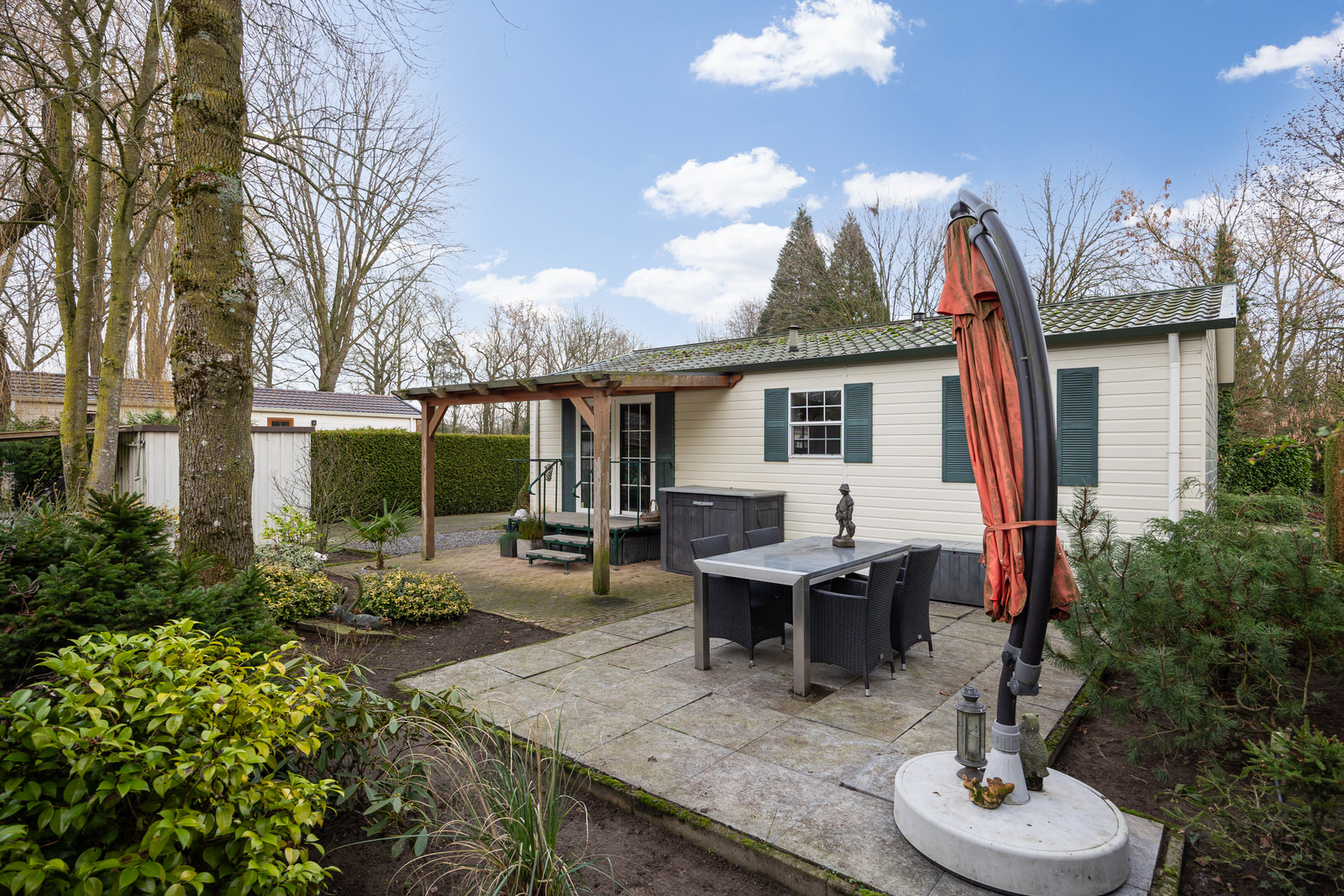 De tuin is verzorgd en onderhoudsvriendelijk aangelegd en biedt een prettige mate van privacy dankzij de groene erfafscheidingen. Rondom het chalet zijn meerdere terrasmogelijkheden aanwezig, waardoor er altijd een plek in zon of schaduw te vinden is. De overkapping bij de entree zorgt voor beschutting bij binnenkomst en draagt bij aan het comfortabele gebruik van het chalet in alle seizoenen.