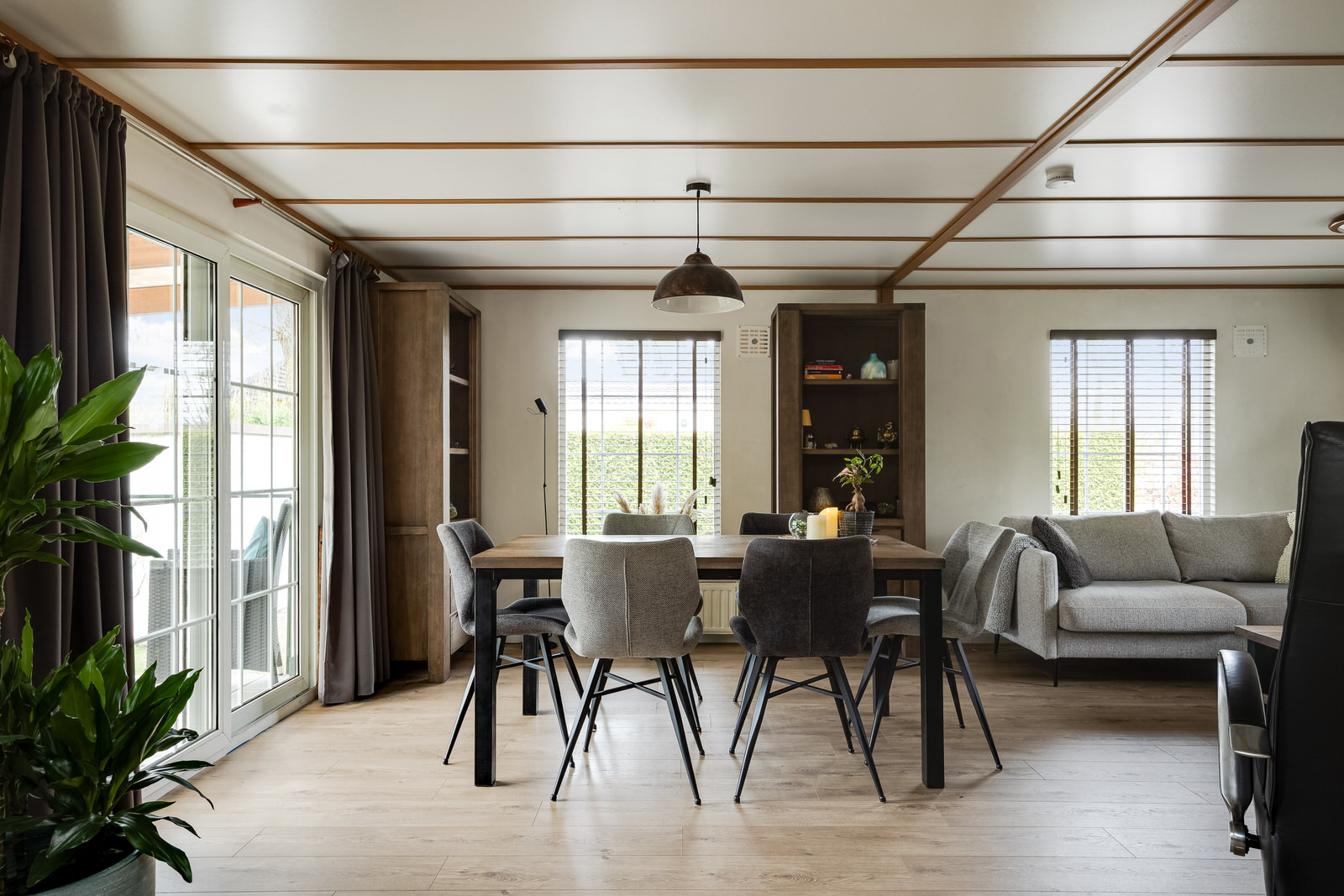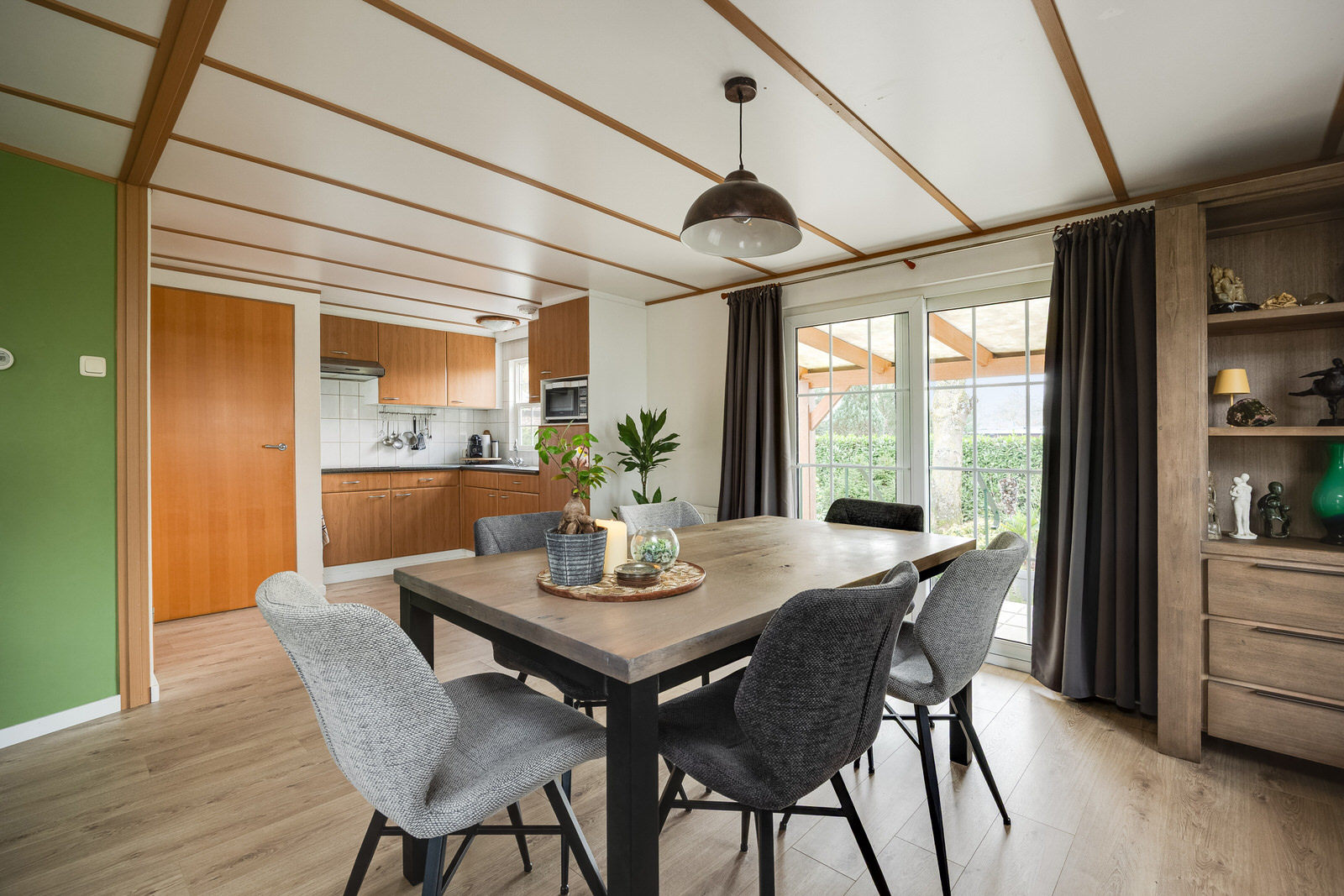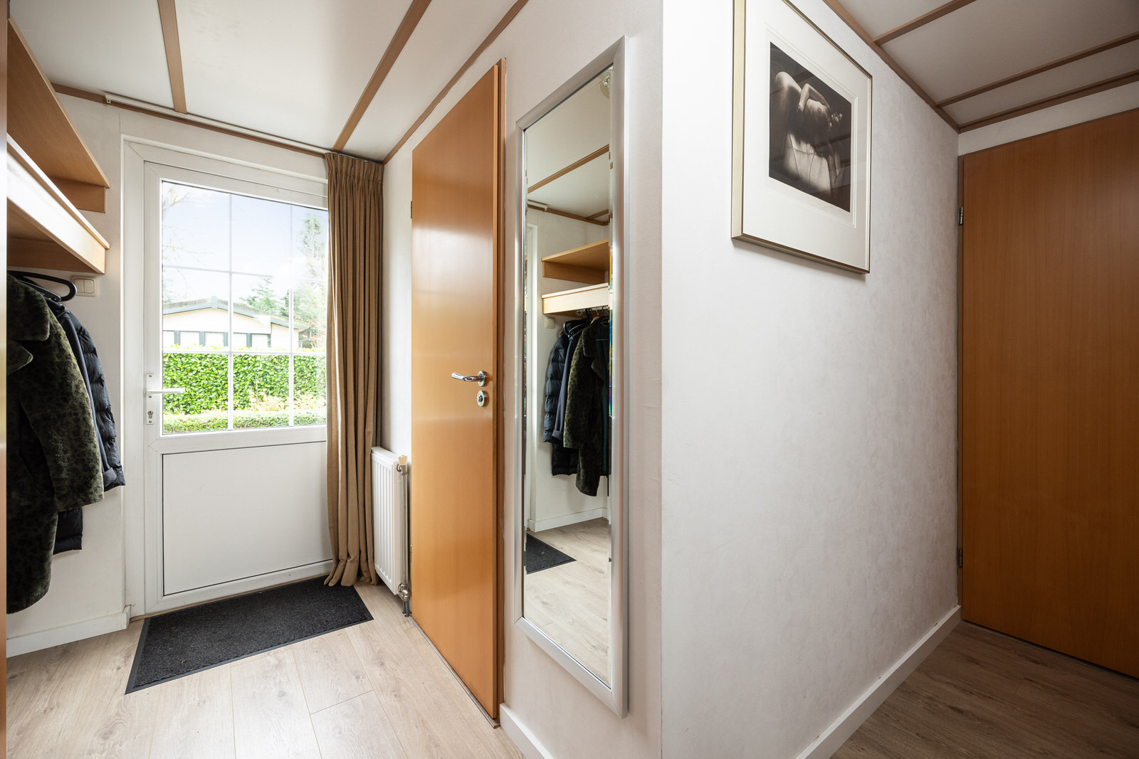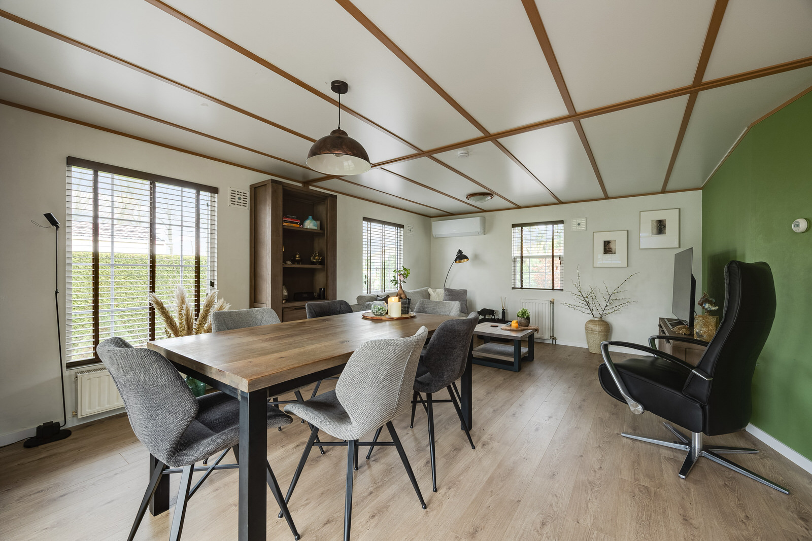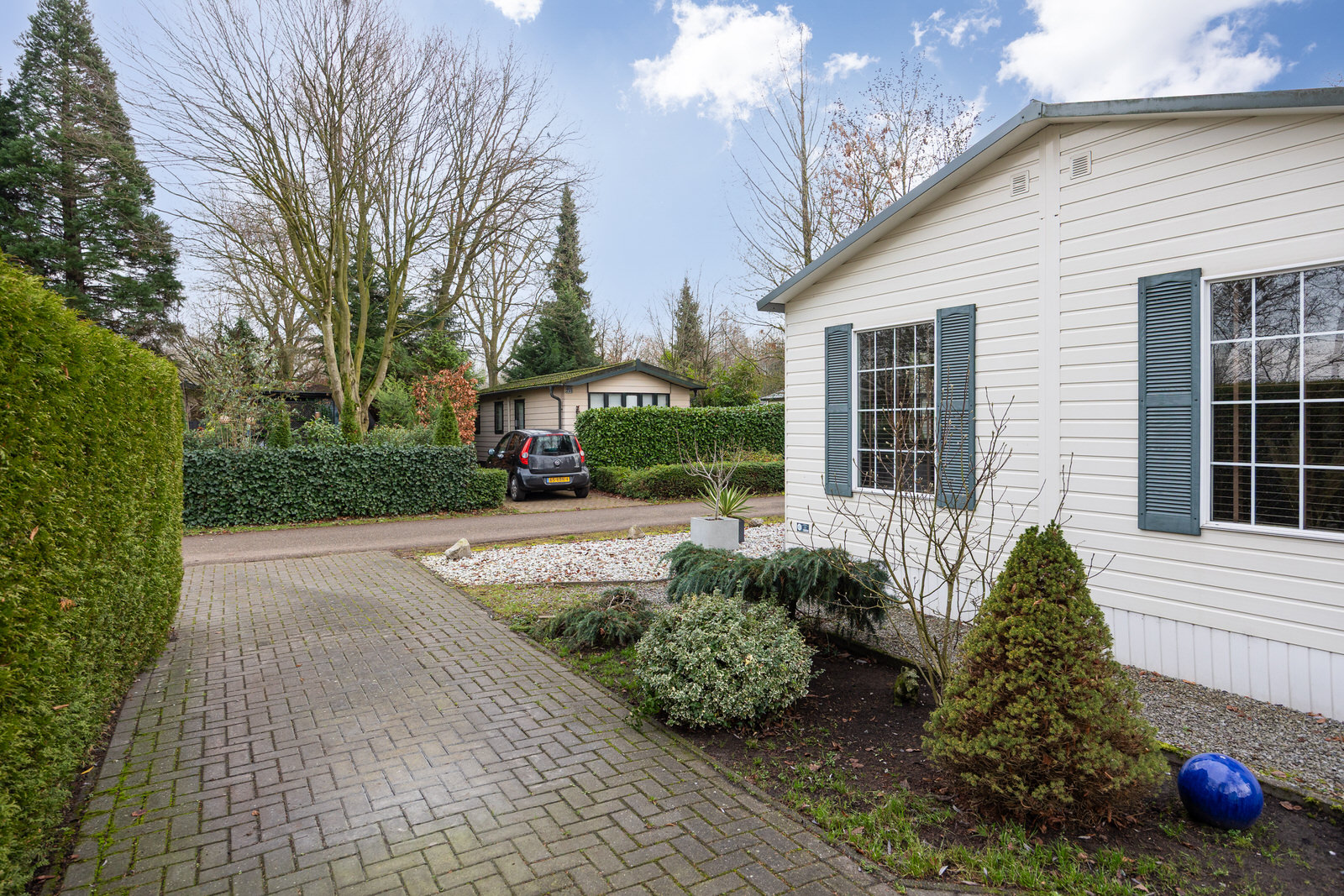 De tuin is verzorgd en onderhoudsvriendelijk aangelegd en biedt een prettige mate van privacy dankzij de groene erfafscheidingen. Rondom het chalet zijn meerdere terrasmogelijkheden aanwezig, waardoor er altijd een plek in zon of schaduw te vinden is. De overkapping bij de entree zorgt voor beschutting bij binnenkomst en draagt bij aan het comfortabele gebruik van het chalet in alle seizoenen.