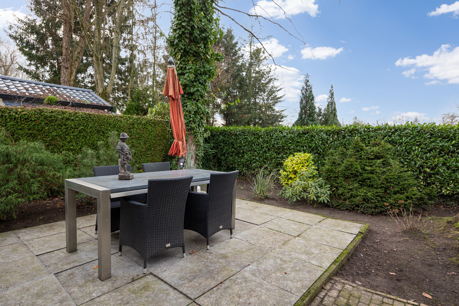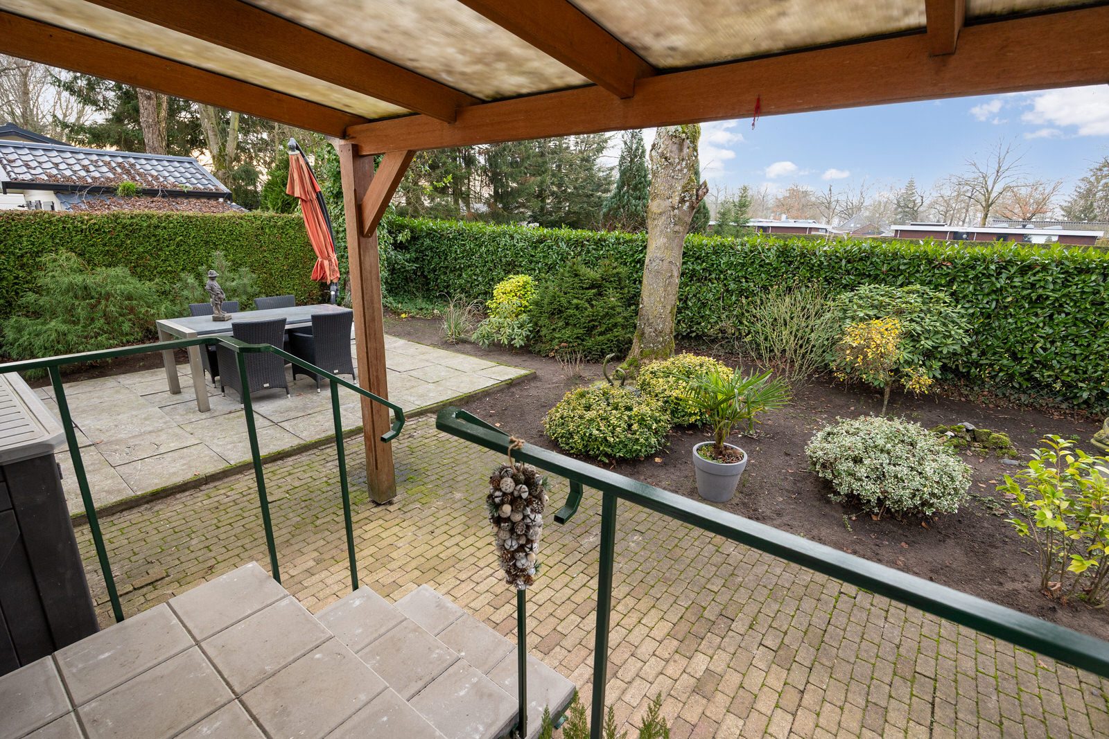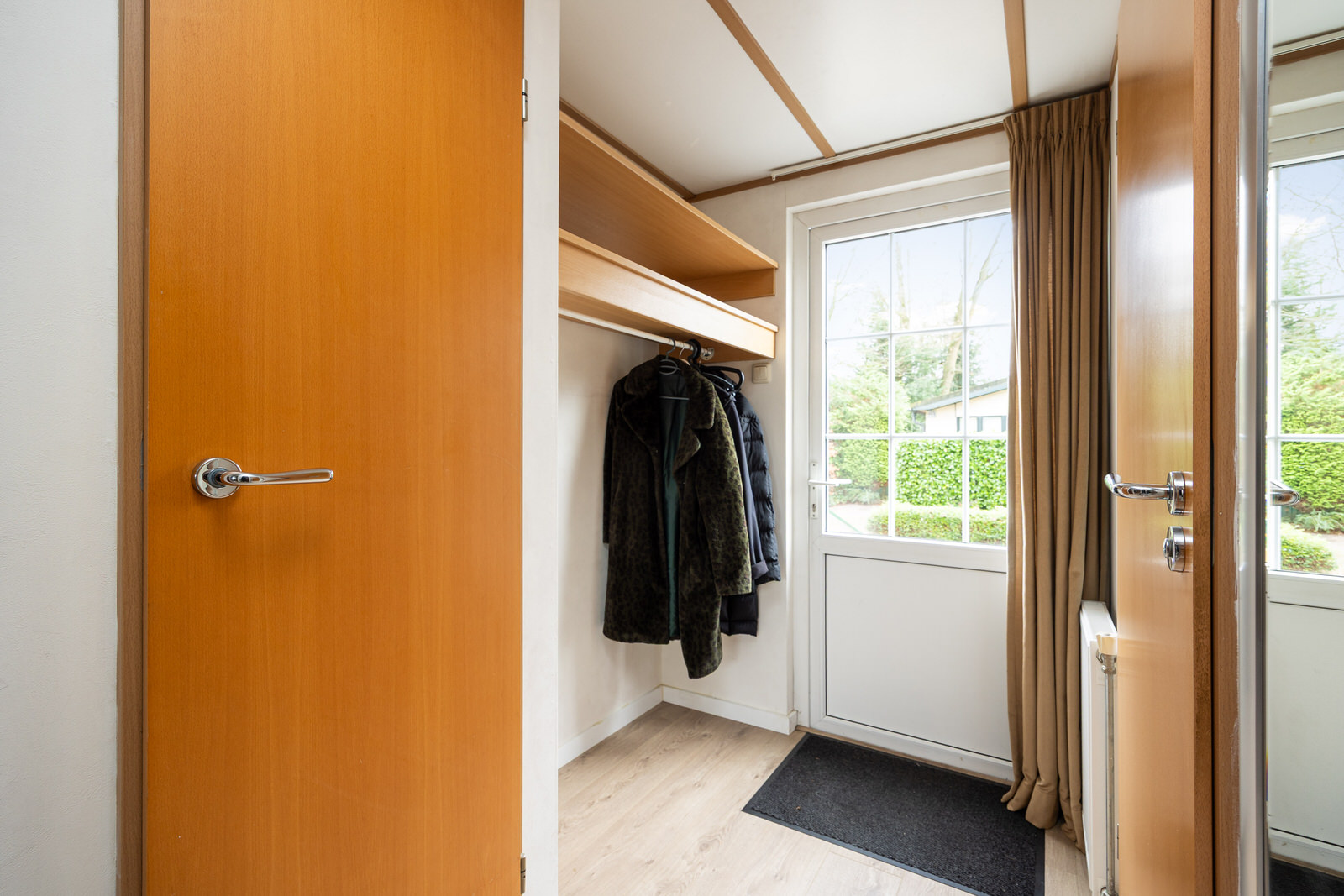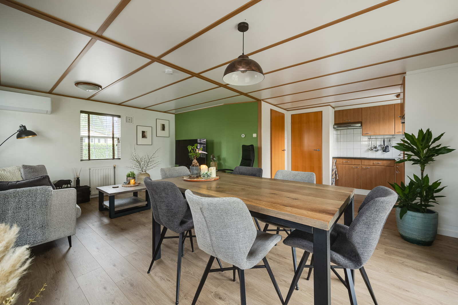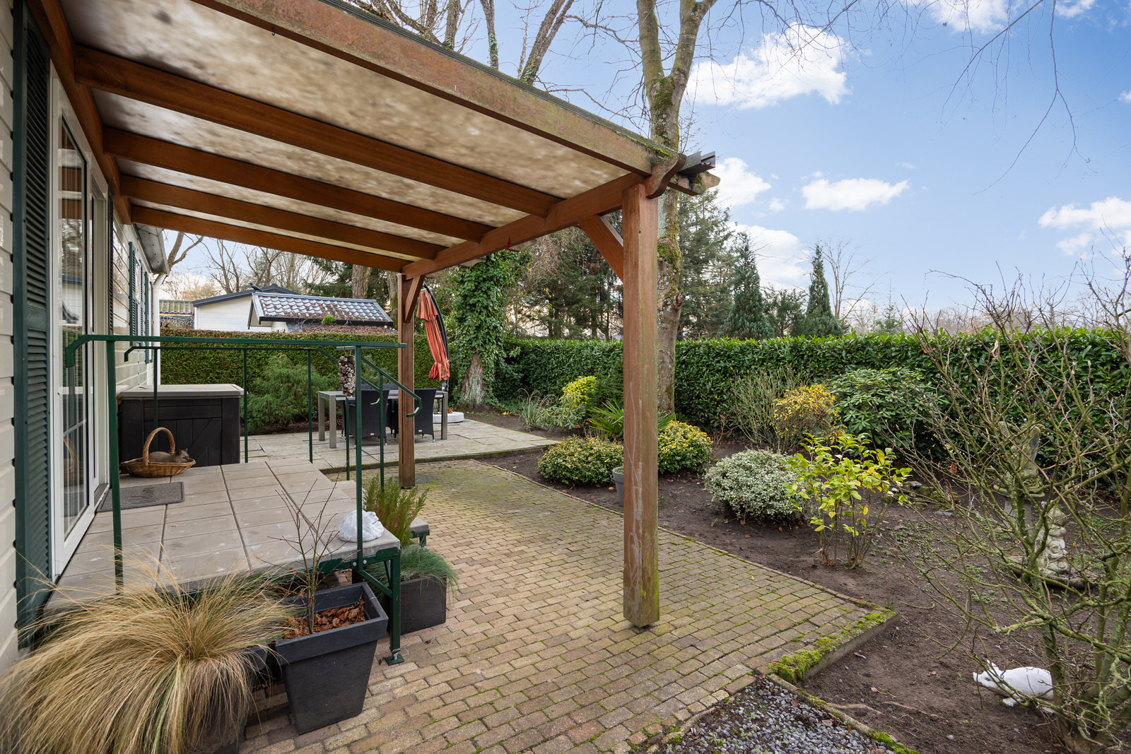 De tuin is verzorgd en onderhoudsvriendelijk aangelegd en biedt een prettige mate van privacy dankzij de groene erfafscheidingen. Rondom het chalet zijn meerdere terrasmogelijkheden aanwezig, waardoor er altijd een plek in zon of schaduw te vinden is. De overkapping bij de entree zorgt voor beschutting bij binnenkomst en draagt bij aan het comfortabele gebruik van het chalet in alle seizoenen.