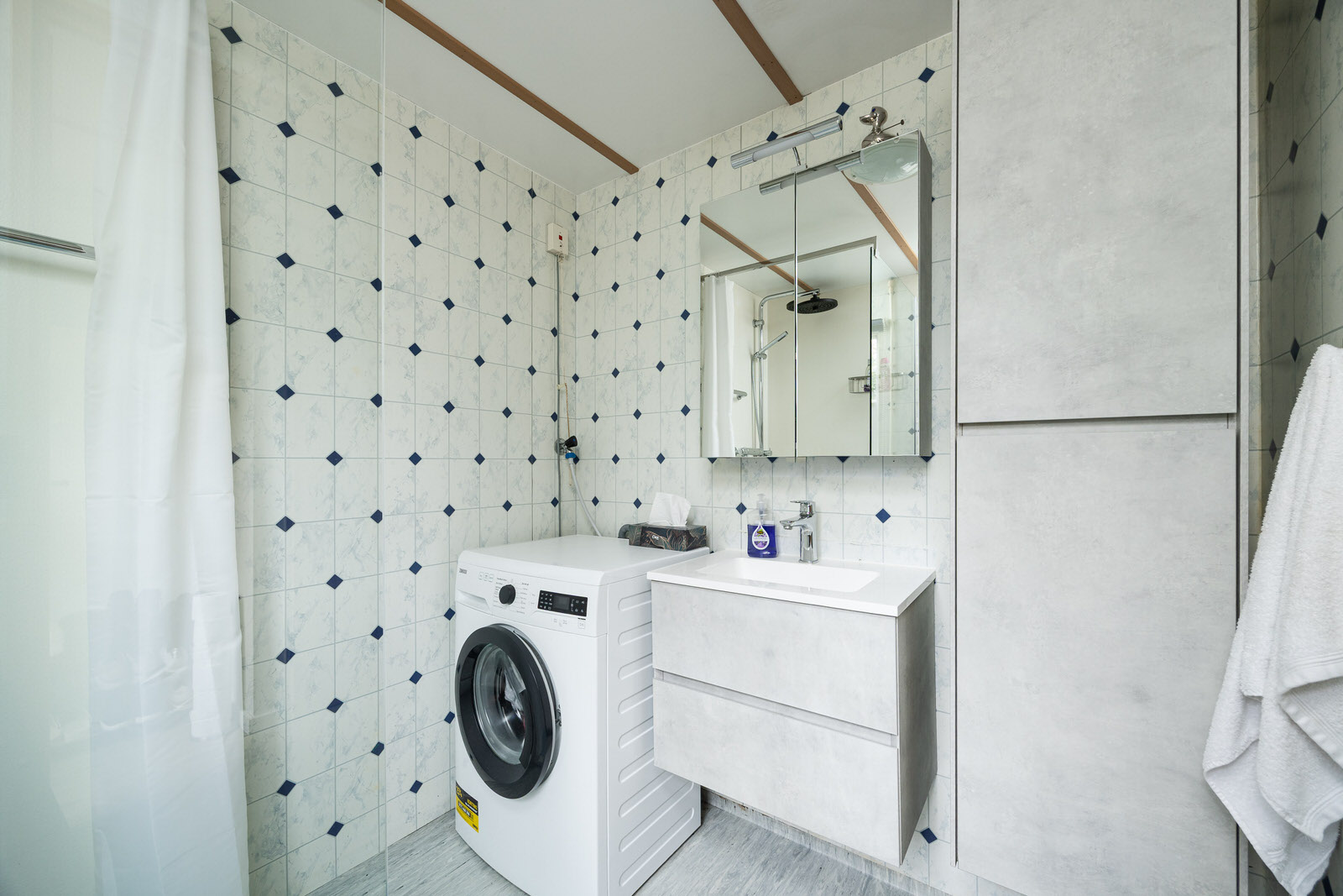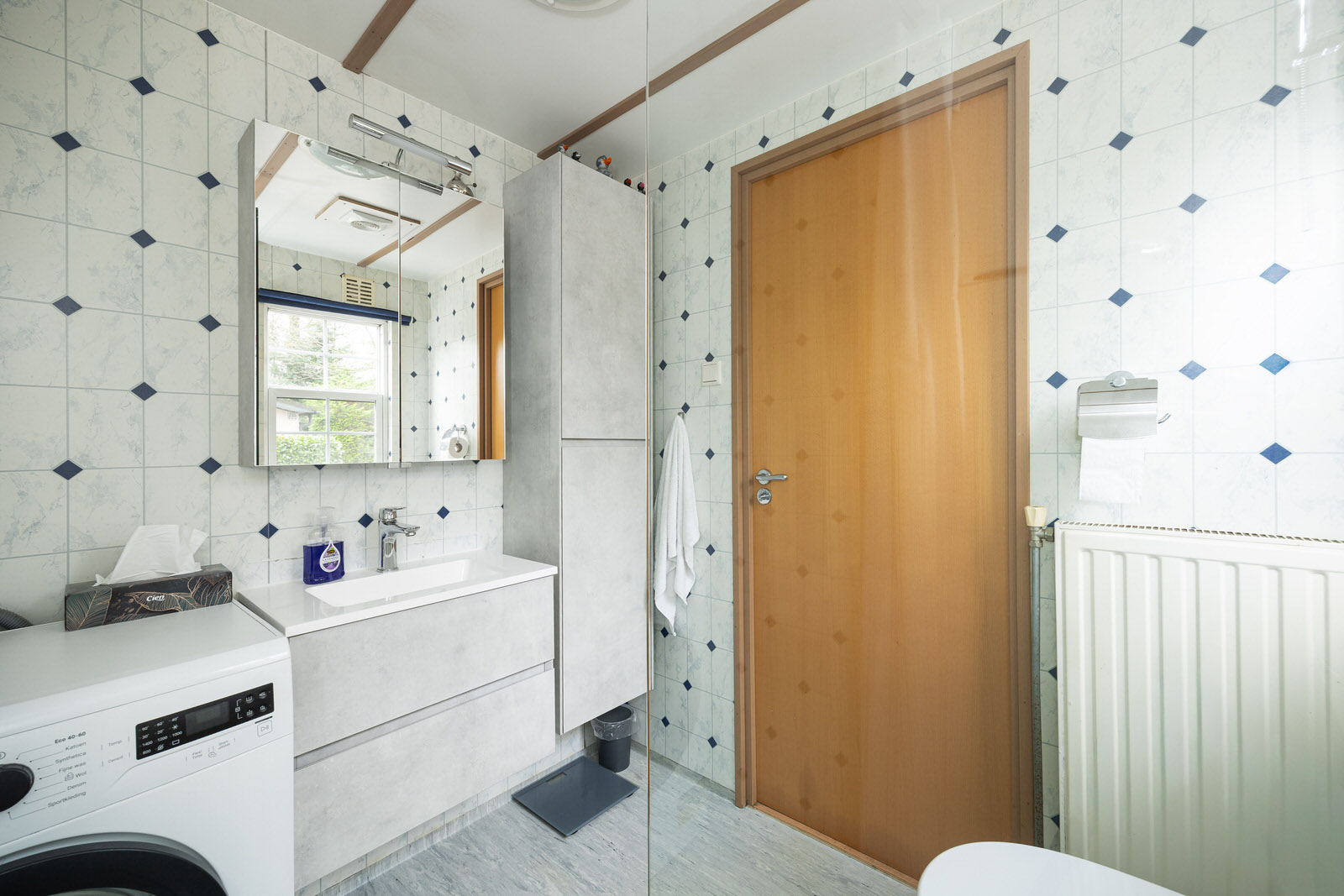 De badkamer is compleet uitgevoerd met een douchecabine, wastafelmeubel, toilet en aansluiting voor de wasmachine. De ruimte is functioneel ingericht en netjes onderhouden.