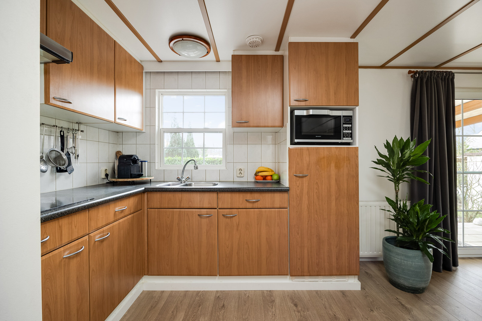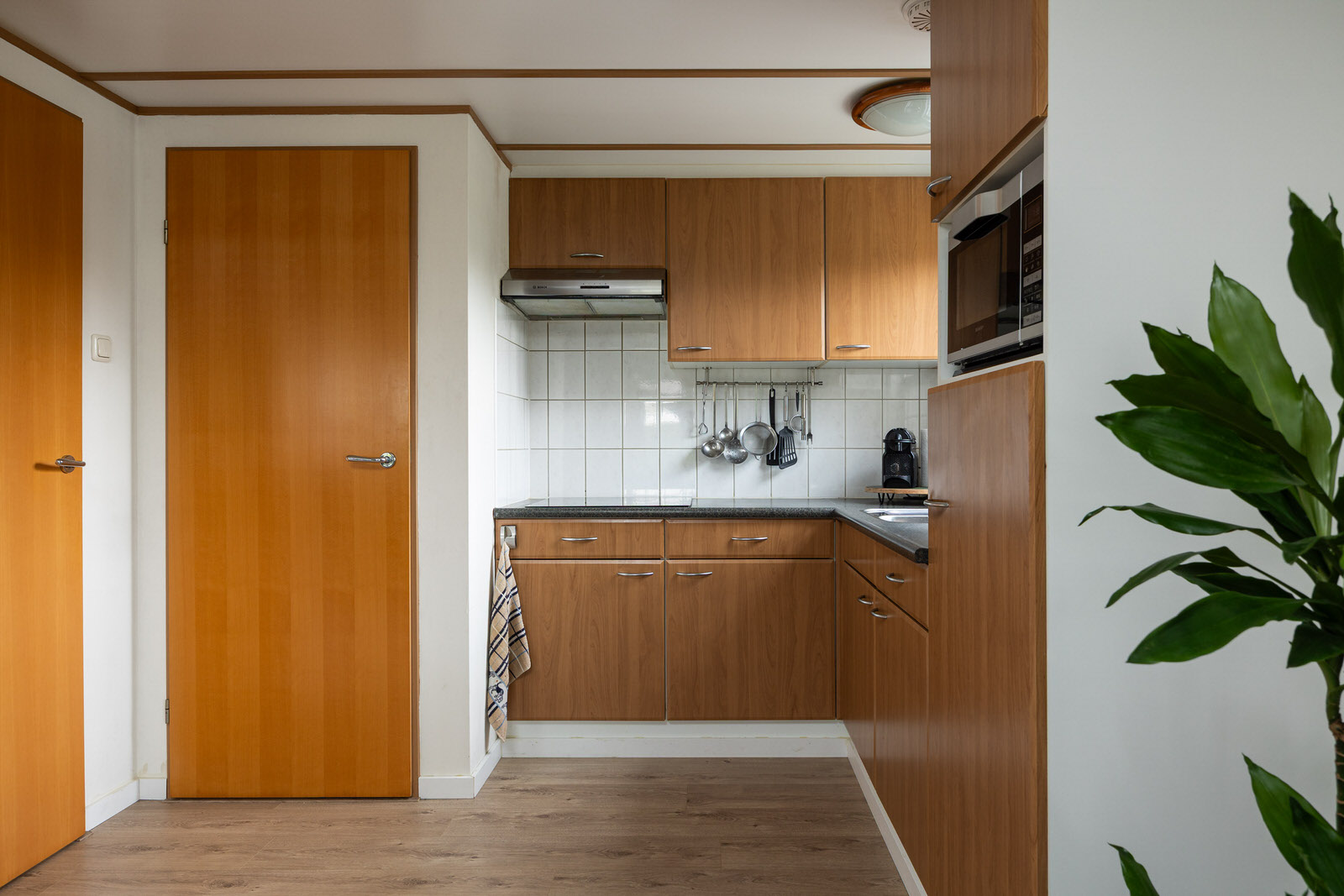 De open keuken sluit direct aan op de woonkamer en is praktisch ingericht. De keuken beschikt over een 1½ spoelbak, een inductiekookplaat, een afzuigkap en een koelkast. Daarnaast is er voldoende kastruimte. De opstelling is overzichtelijk en functioneel, met voldoende werkruimte voor dagelijks gebruik.