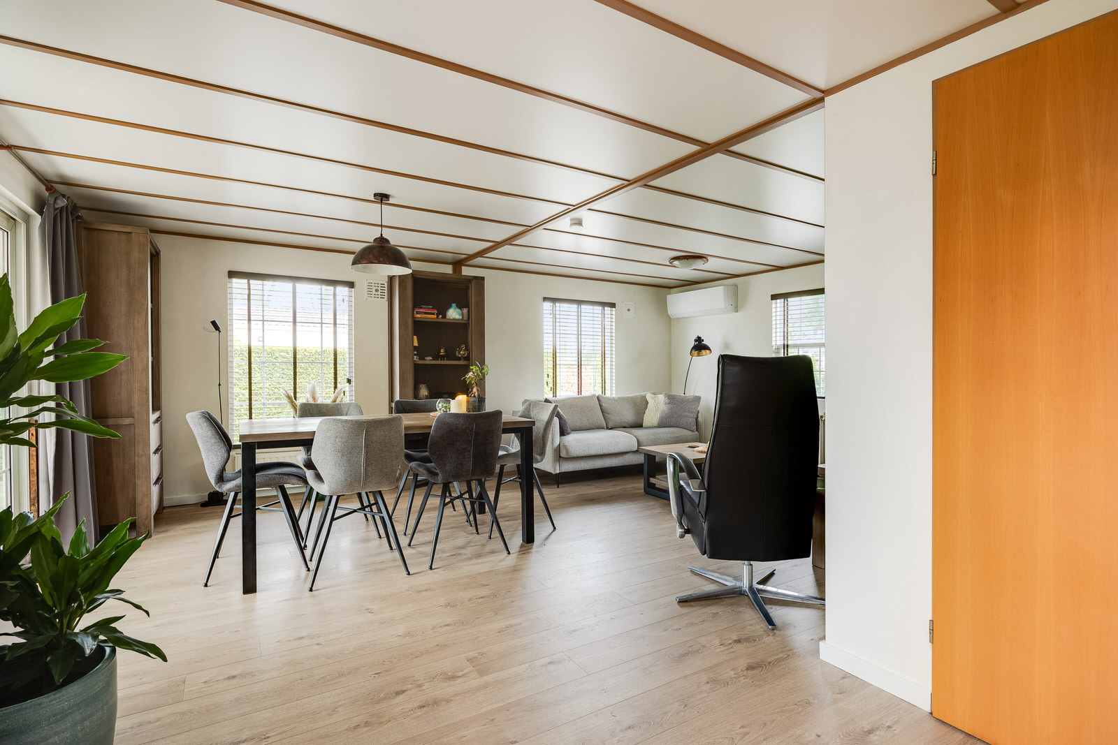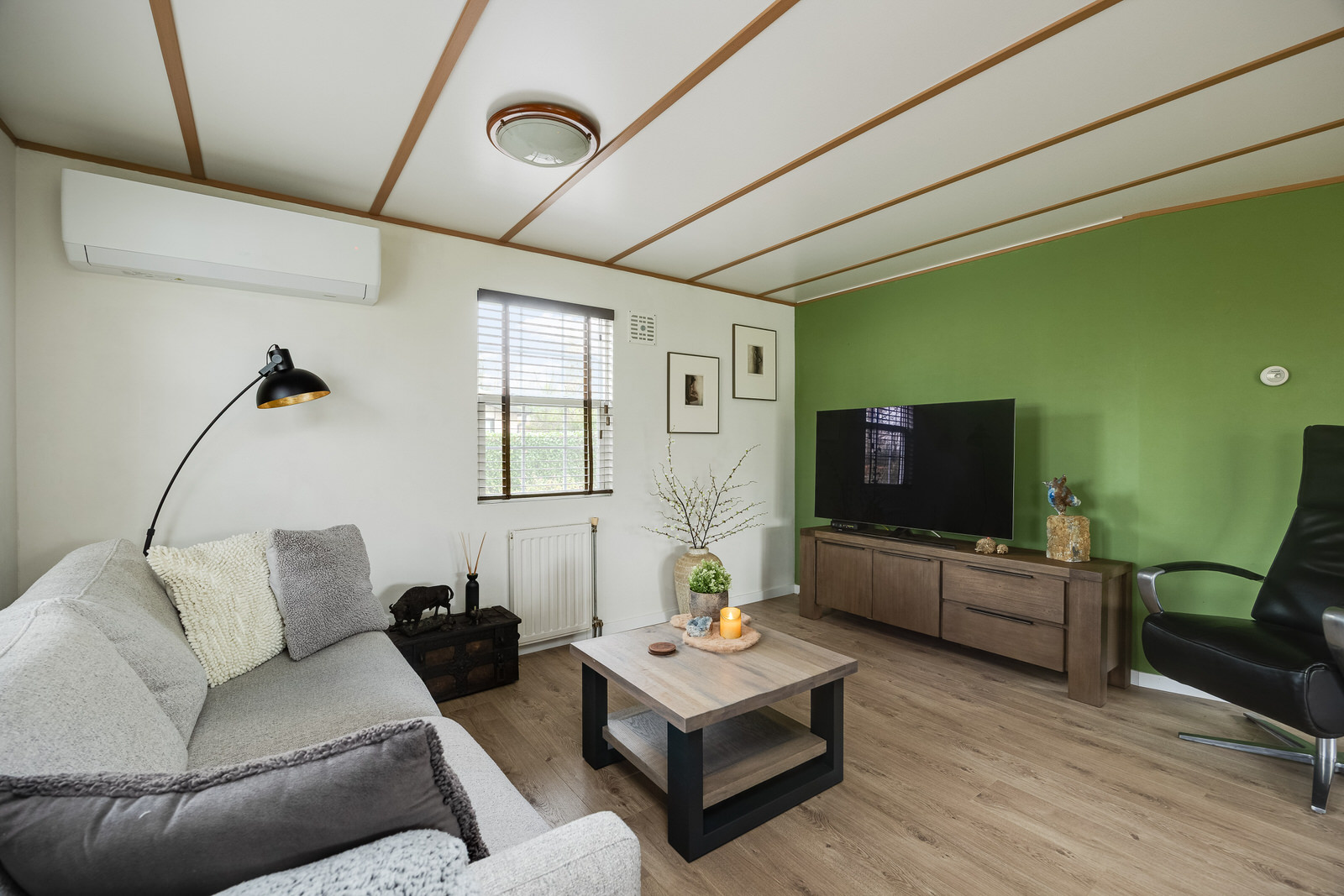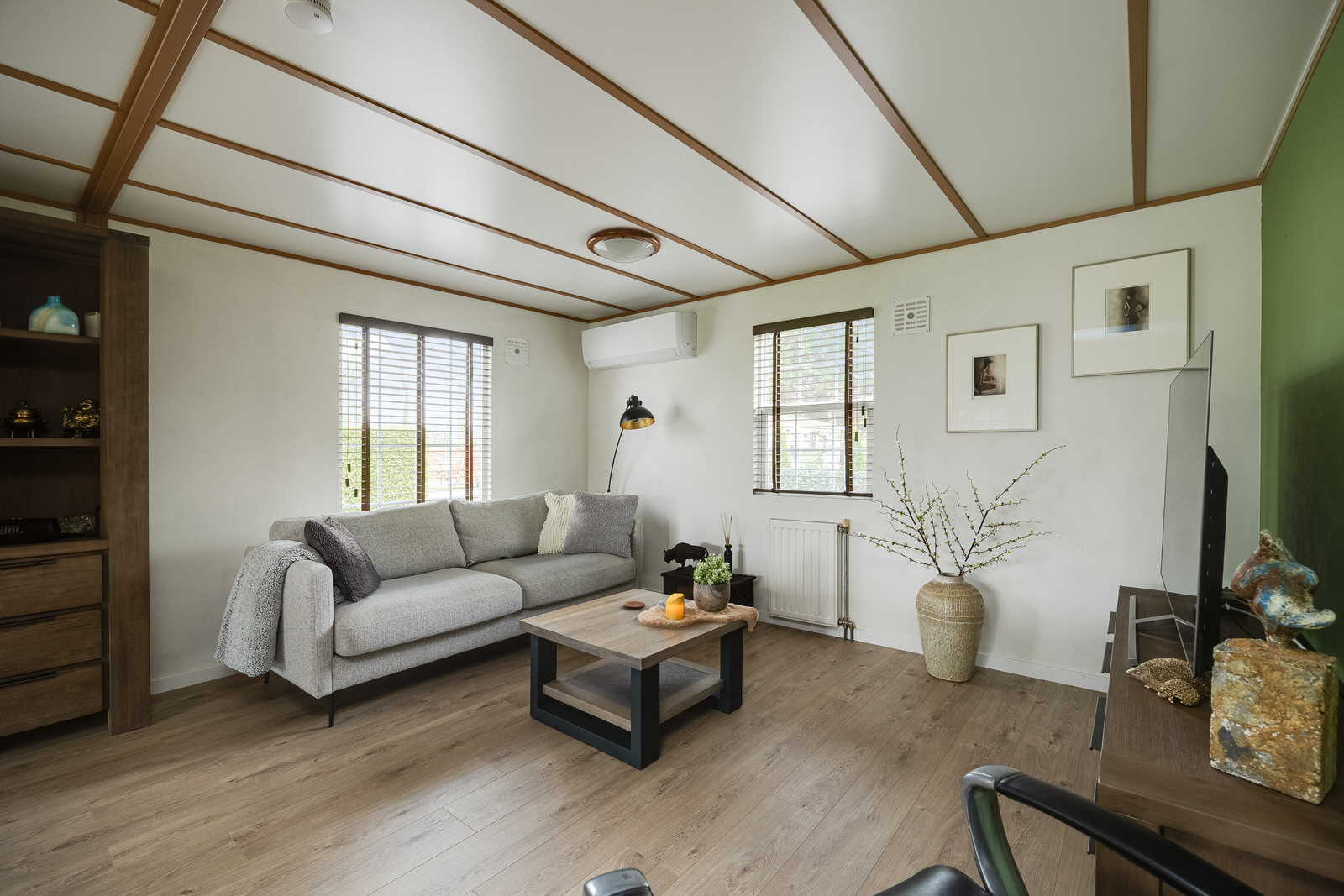 De woonkamer is licht en prettig van formaat en afgewerkt met een laminaatvloer. Grote raampartijen zorgen voor een aangename lichtinval. Vanuit de woonkamer is er direct toegang tot buiten, met een overkapping bij de entree die zorgt voor beschutting bij binnenkomst. Verwarming vindt plaats via radiatoren; daarnaast is airconditioning aanwezig voor extra comfort.