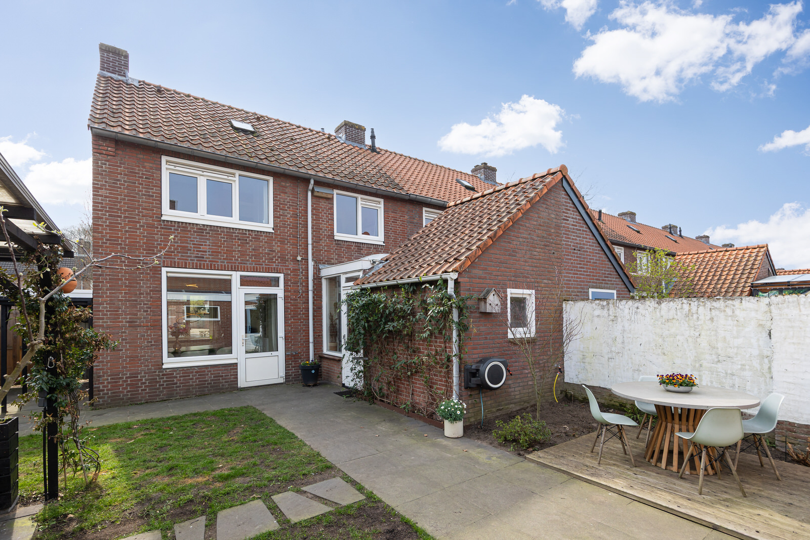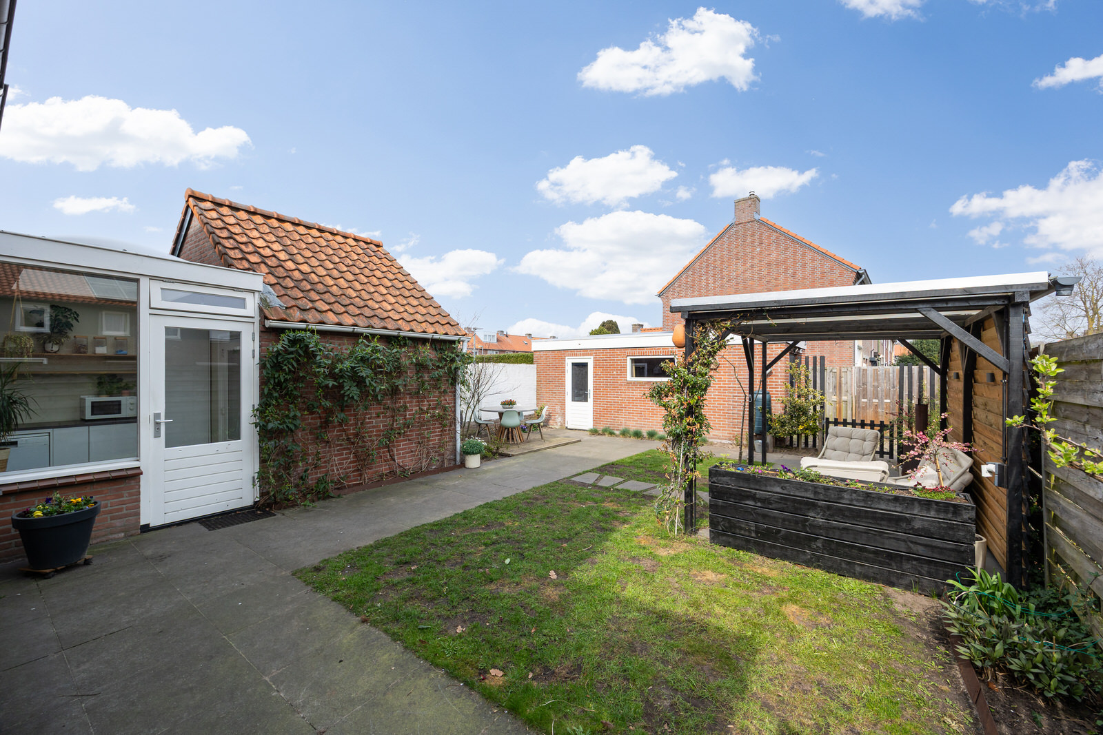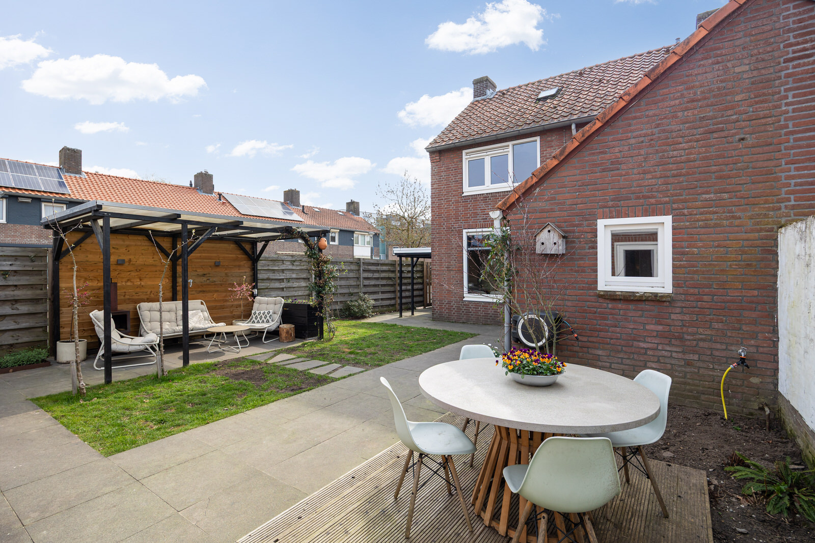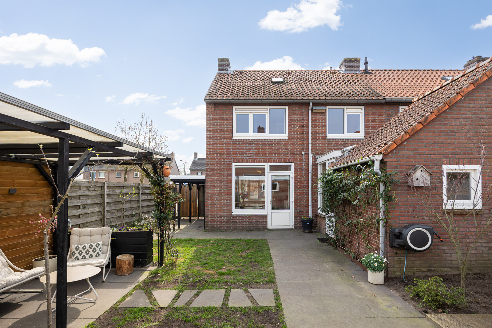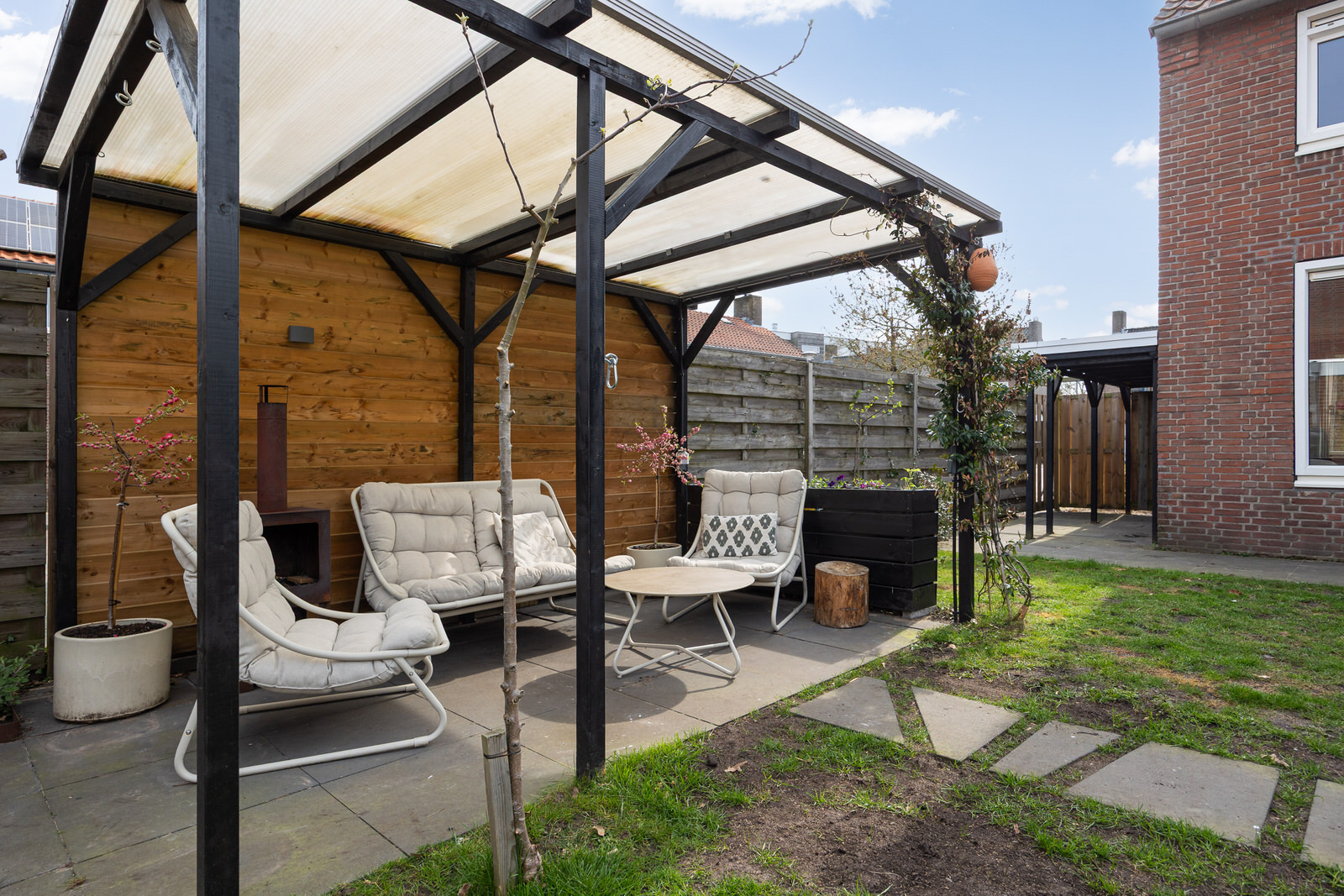 De achtertuin is verzorgd aangelegd en beschikt over een fijne overkapping, waardoor je hier ook buiten het zomerseizoen prettig kunt zitten. Er is een mooie combinatie van bestrating, groen en praktische buitenruimte. Ook een buitenkraan is aanwezig. Achter in de tuin staat een vrijstaande garage, die uitstekend geschikt is voor opslag, hobby of het stallen van fietsen en spullen. Daarnaast maakt de hoekligging dat het perceel ruim en prettig aanvoelt.