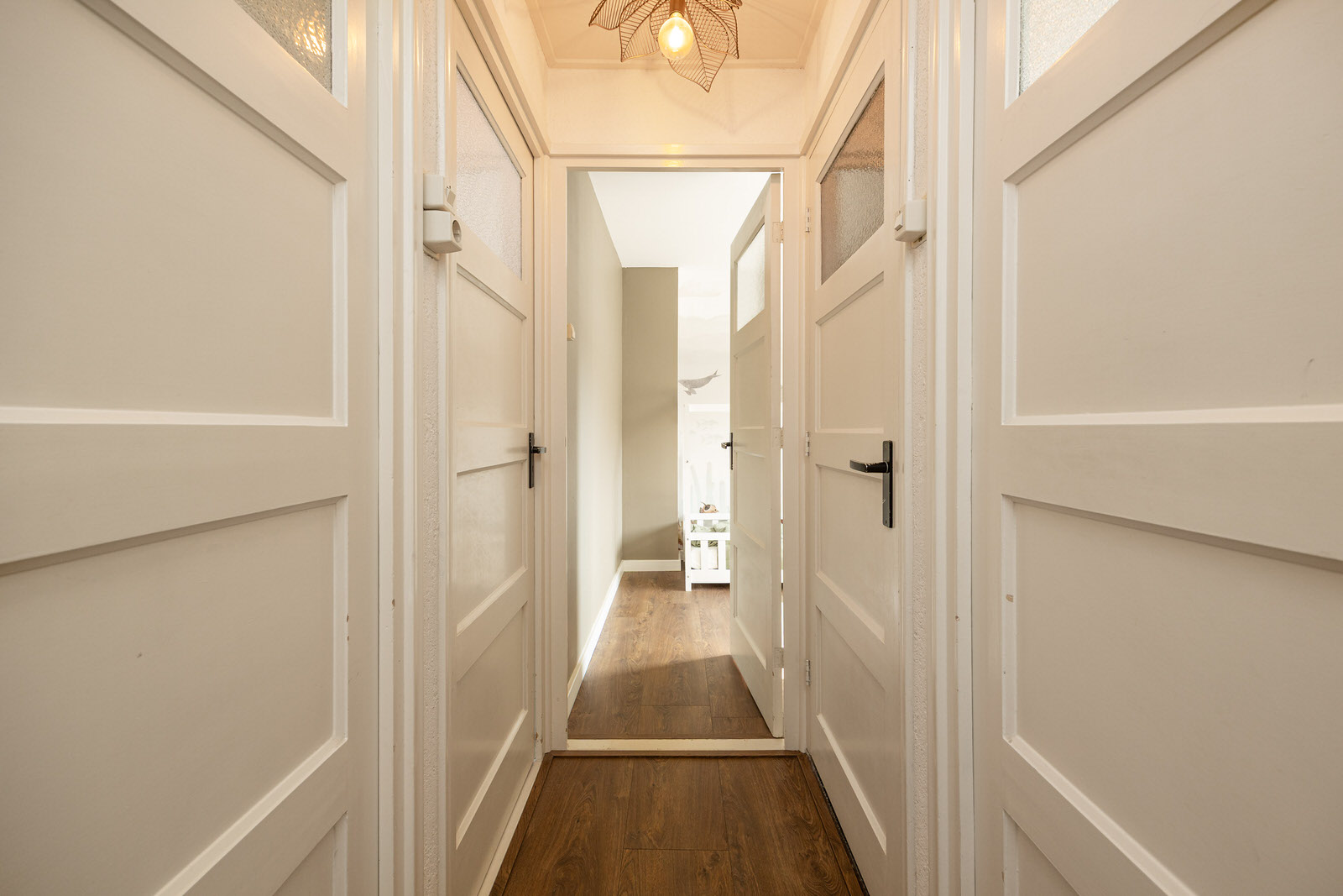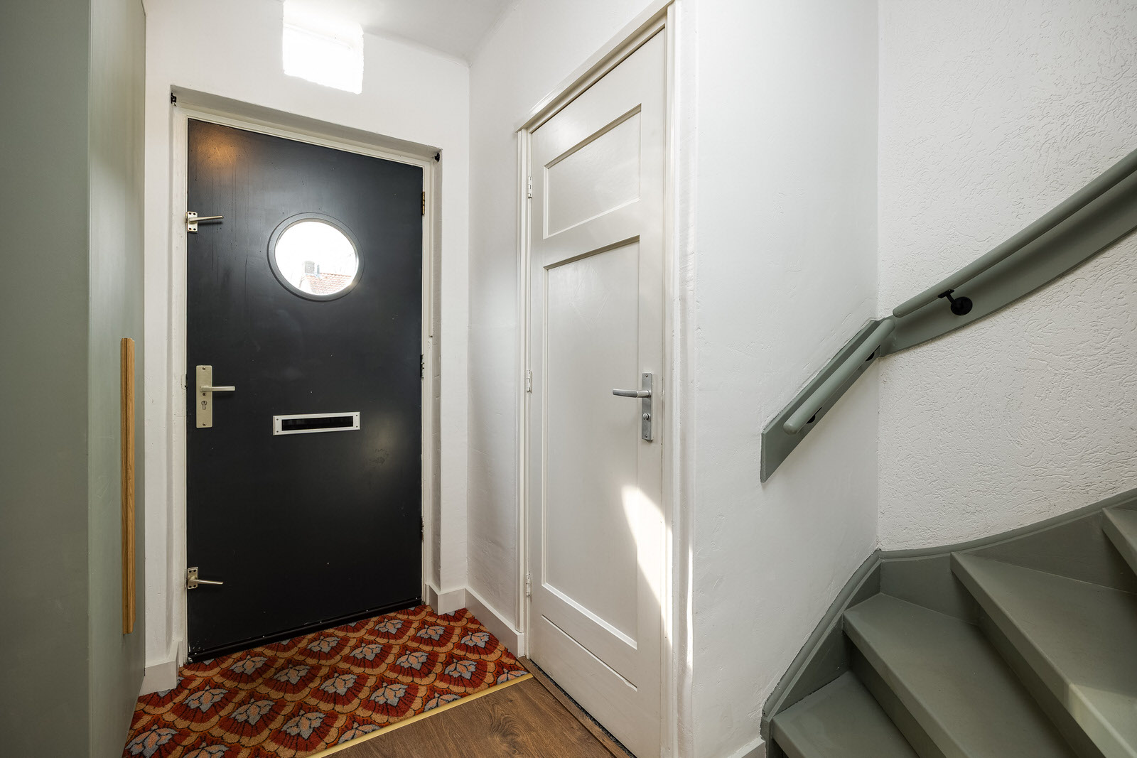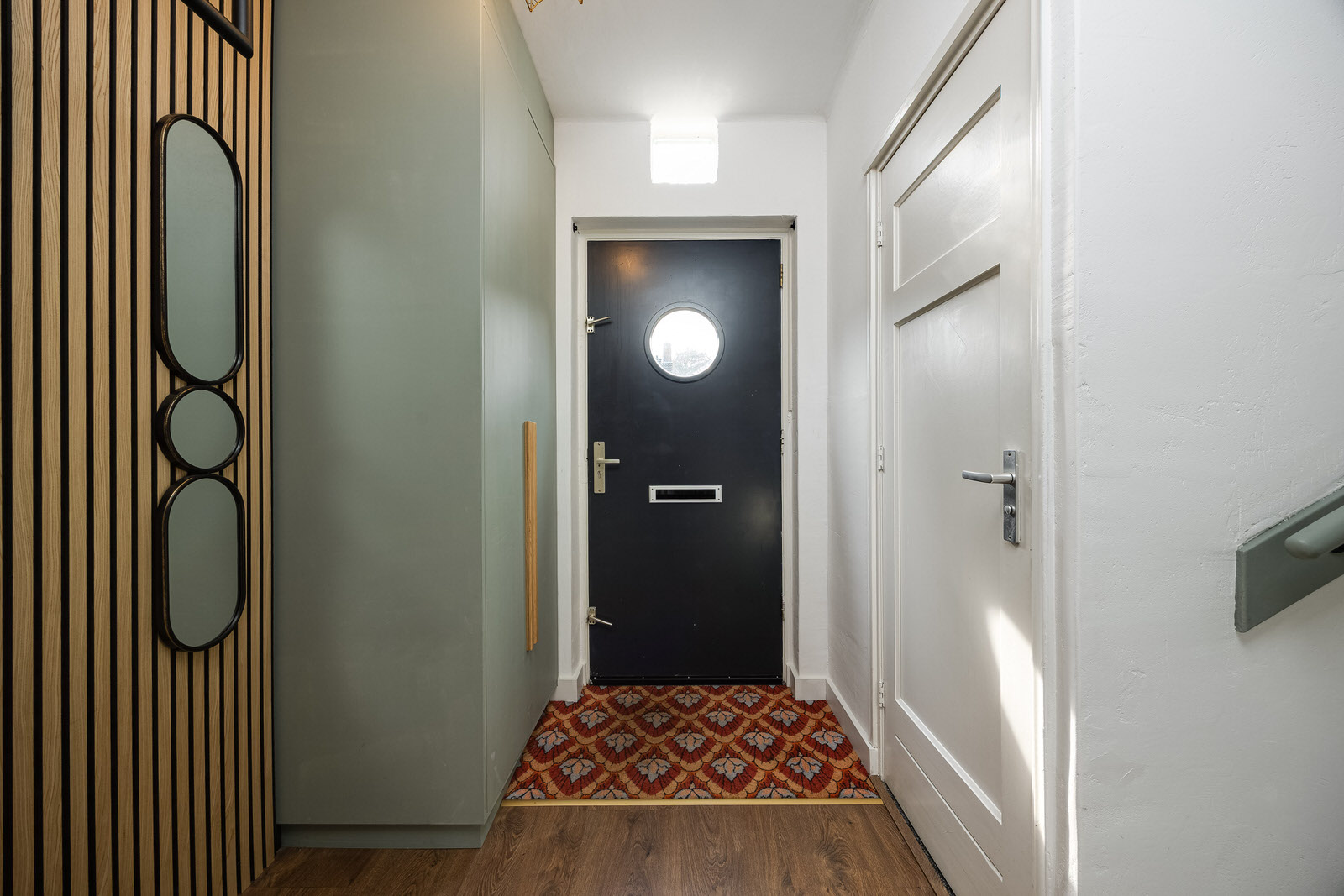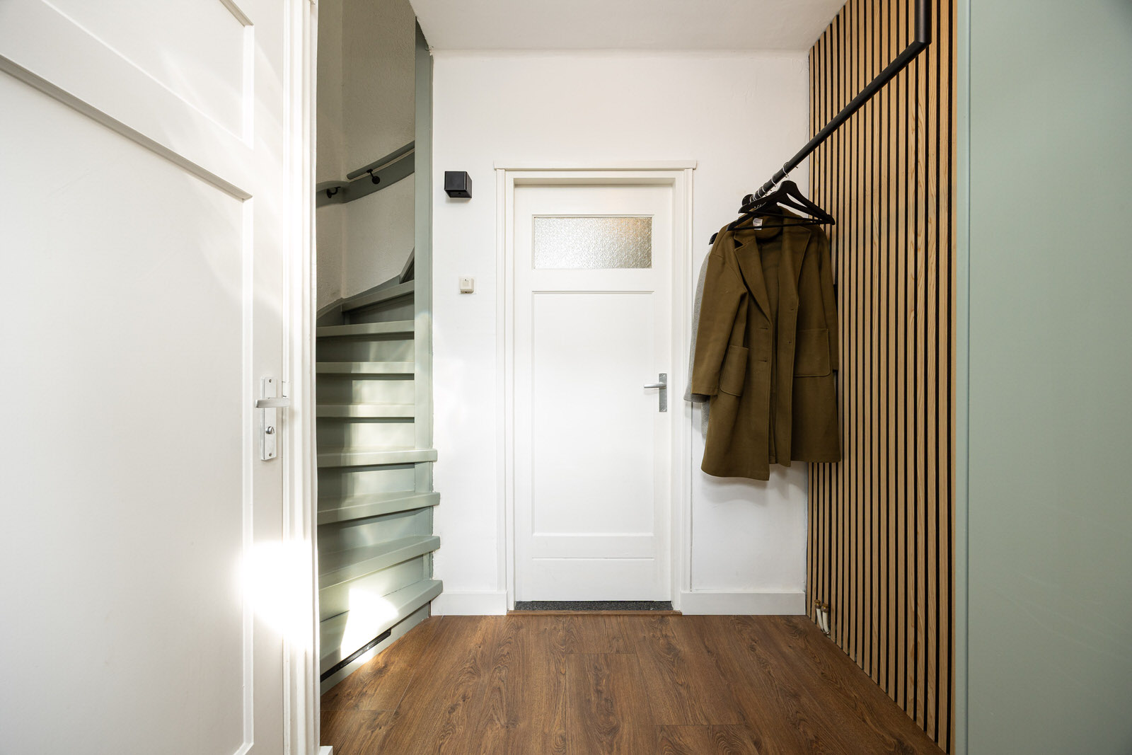 Je komt binnen in een nette hal die direct een verzorgde eerste indruk geeft. Vanuit hier zijn de toiletruimte, de trapopgang en de doorgang naar de woonkamer en keuken bereikbaar. De hal oogt strak en licht en vormt een rustig begin van de woning. Daarnaast is er een moderne garderobekast aanwezig, wat zorgt voor een opgeruimd en praktisch geheel.