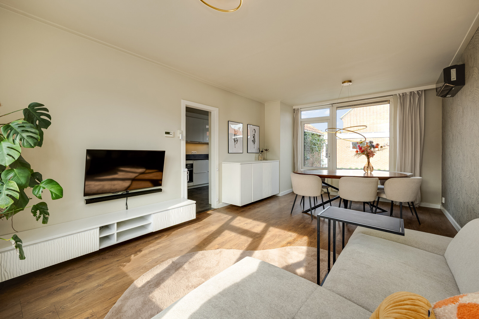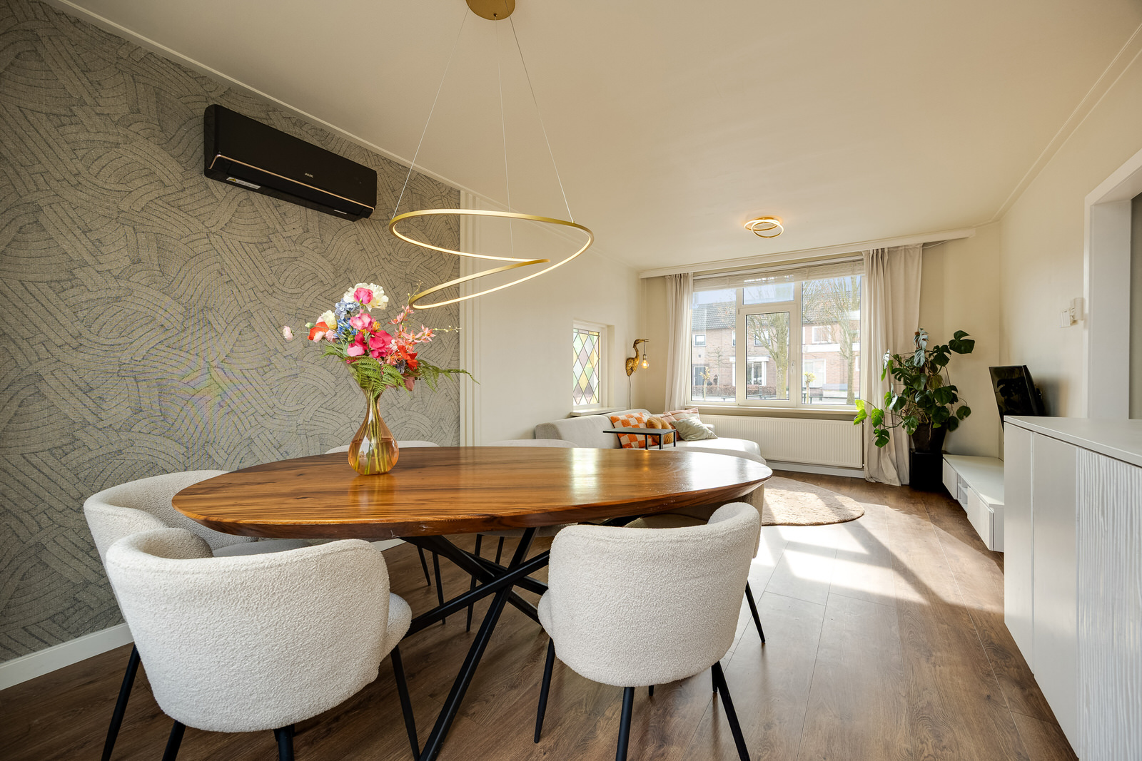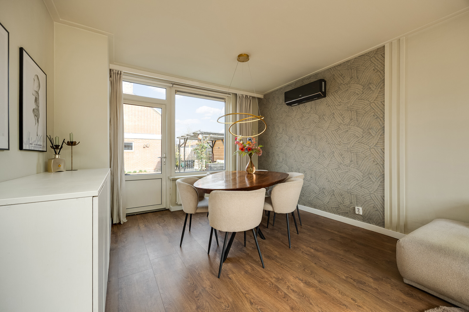De woonkamer is heerlijk licht dankzij de grote raampartijen aan voor- en achterzijde. De ruimte biedt voldoende plaats voor zowel een comfortabele zithoek als een royale eethoek. De afwerking is verzorgd en eigentijds, met onder meer een laminaatvloer en strak afgewerkte wanden. De airconditioning uit 2023 is hier een prettig extra pluspunt: comfortabel in warme periodes en aangenaam voor het binnenklimaat. De woonkamer sluit mooi aan op de keuken, waardoor het leefgedeelte open en uitnodigend aanvoelt. Via een loopdeur is er direct toegang tot de achtertuin.