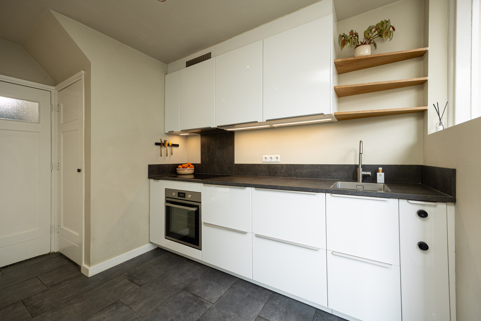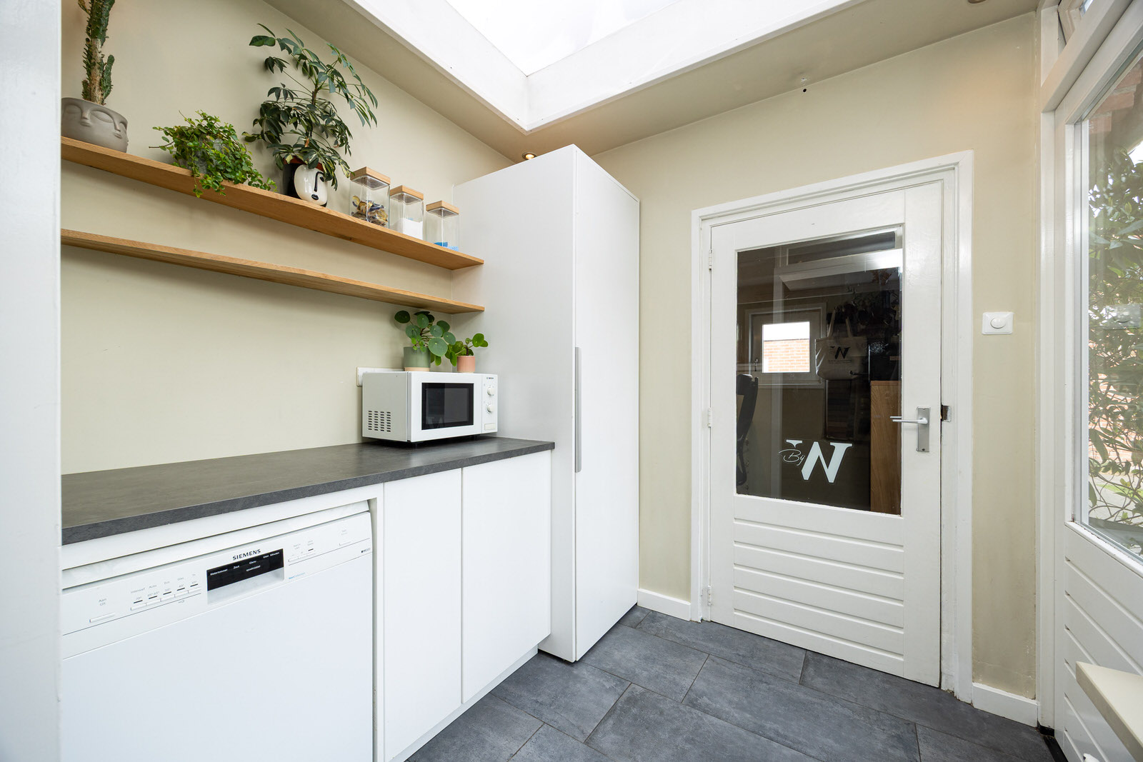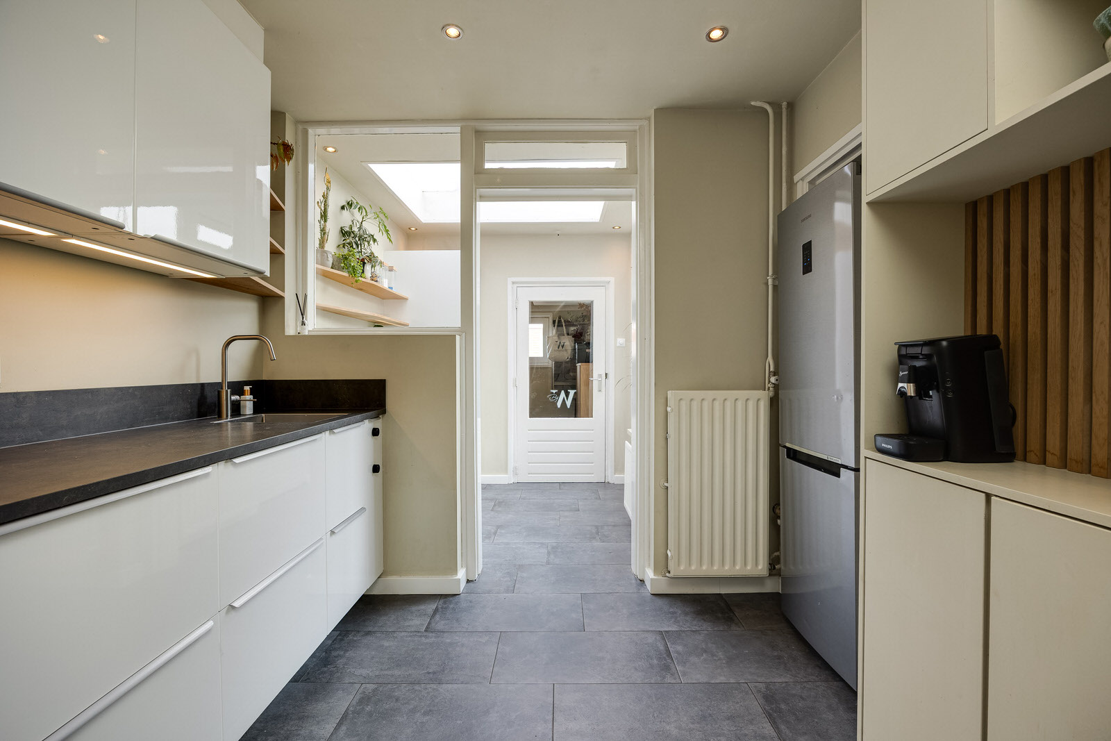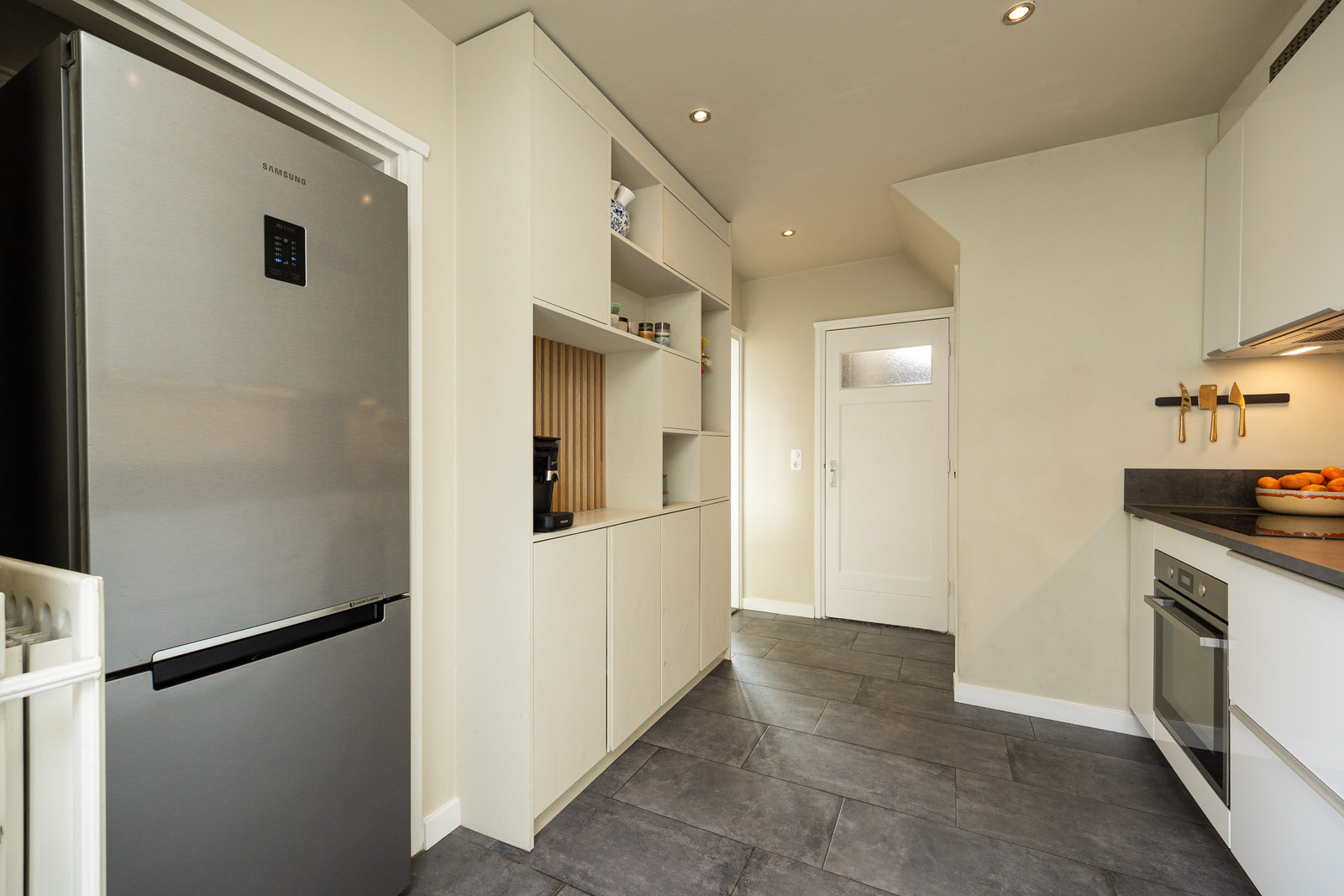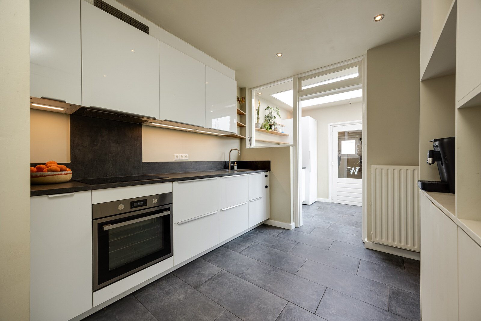 De keuken staat in halfopen verbinding met de woonkamer. De opstelling is modern en praktisch, met veel kastruimte, een strak werkblad en diverse inbouwapparatuur. Aanwezig zijn onder meer een inductiekookplaat, afzuigkap, oven, vaatwasser en koelkast. Ook de verdiepte kelderkast is een praktisch pluspunt, ideaal voor provisie en extra bergruimte.
