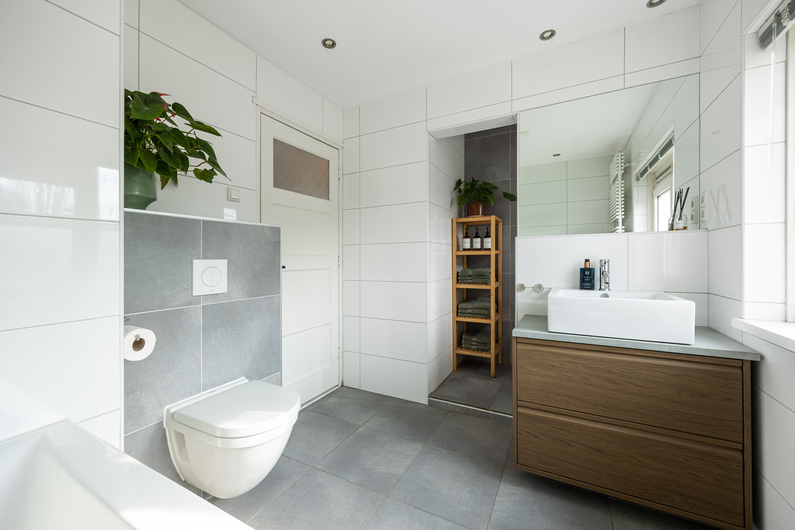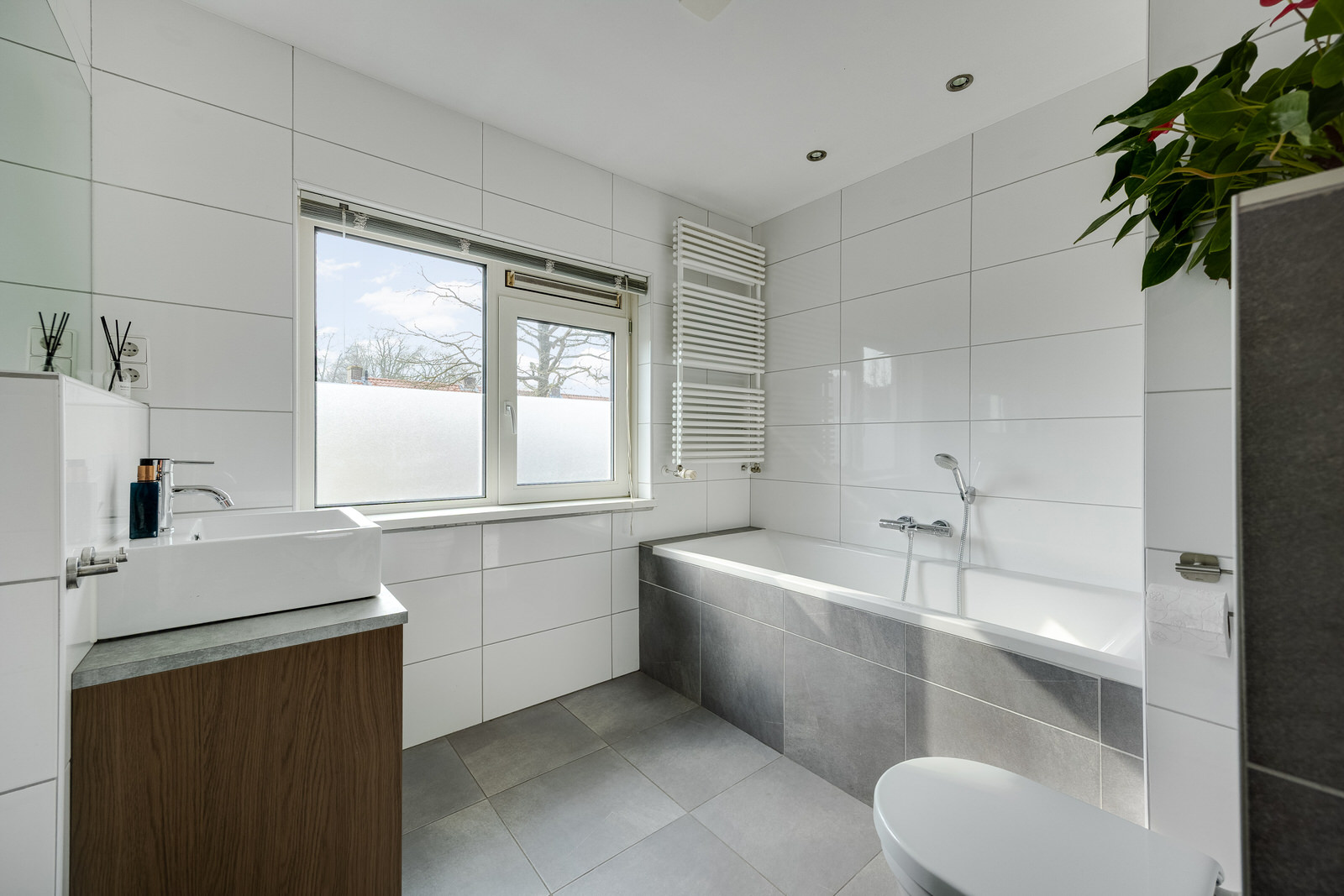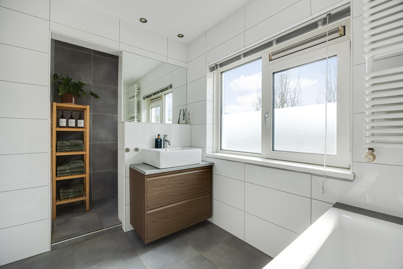 De badkamer is modern uitgevoerd en compleet ingericht. Hier beschik je over een ligbad, een separate inloopdouche, een wastafelmeubel, een zwevend closet en een designradiator. De ruimte oogt fris, licht en verzorgd, en is daarmee helemaal in lijn met de rest van de woning.