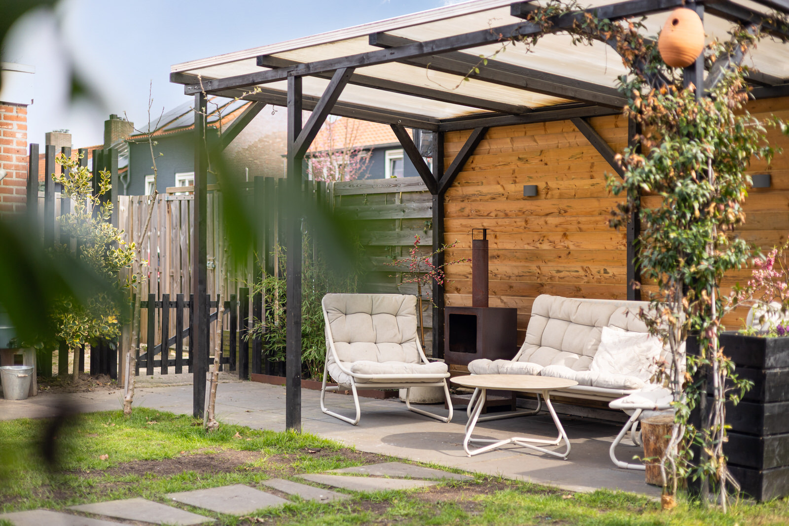 - De achtertuin met overkapping en vrijstaande garage biedt volop ruimte om te ontspannen, op te bergen en praktisch te wonen.