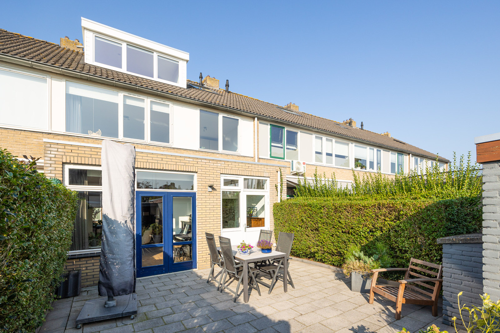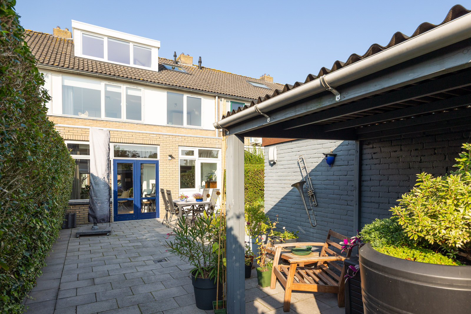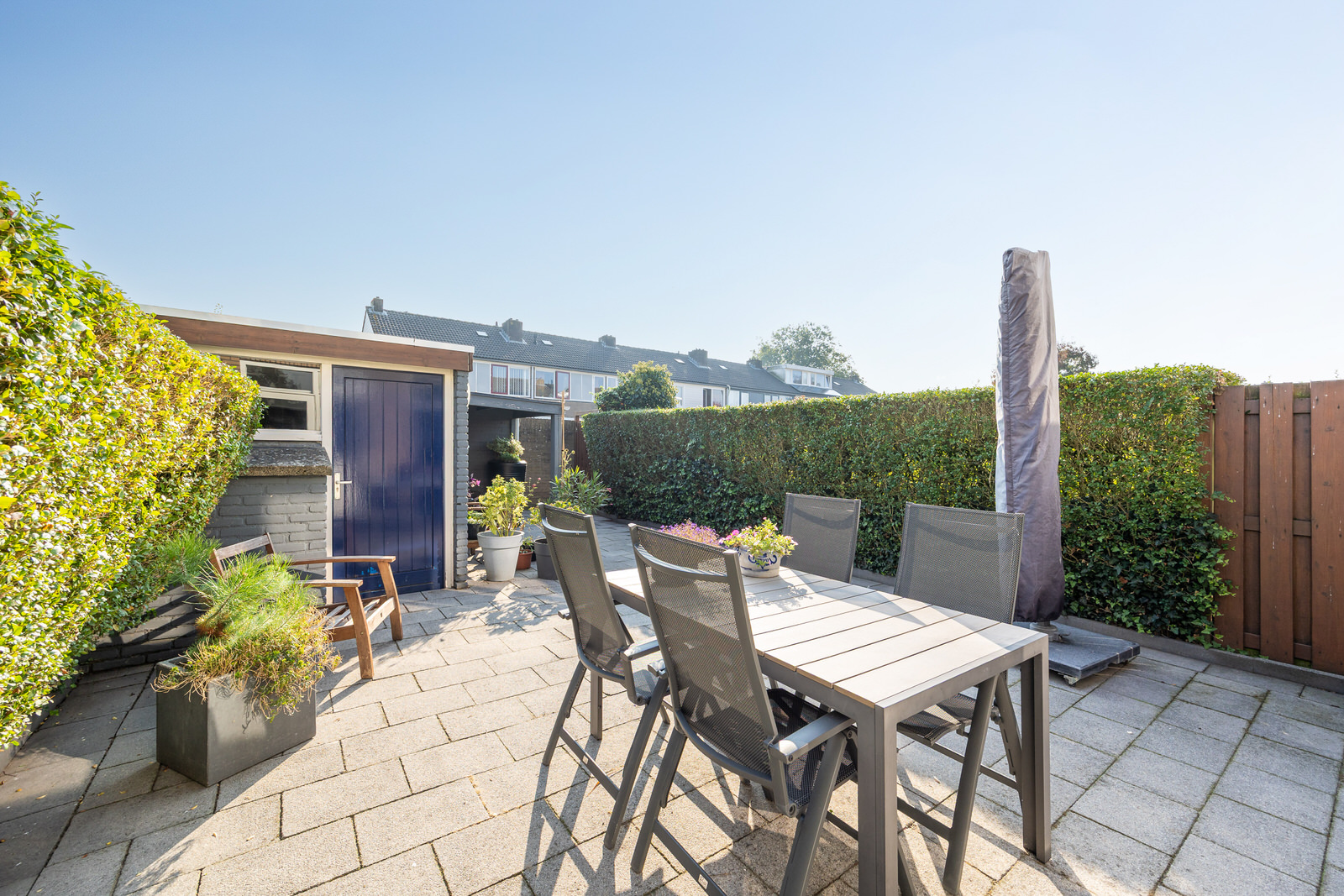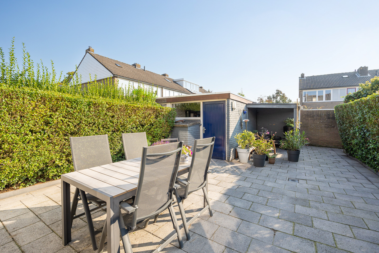 De achtertuin is diep, verzorgd aangelegd en gunstig gelegen op het oosten. Dankzij de combinatie van sierbestrating, groene hagen en voldoende ruimte voor een eettafel of loungeset is het een prettige plek om buiten te zijn. Door de diepte van de tuin is er altijd een beschutte plek in de zon of schaduw te vinden. Via de achterom is de tuin gemakkelijk bereikbaar.