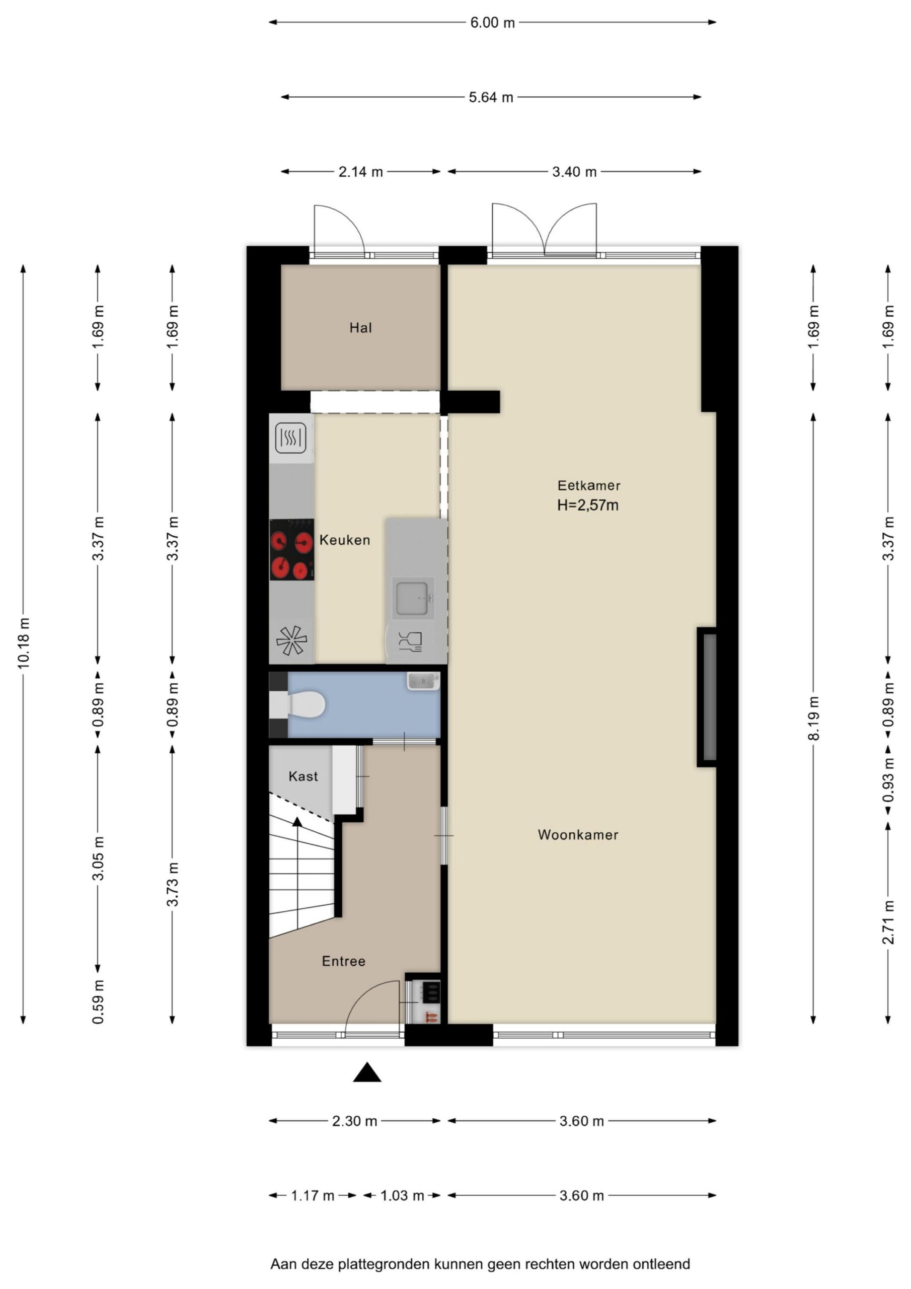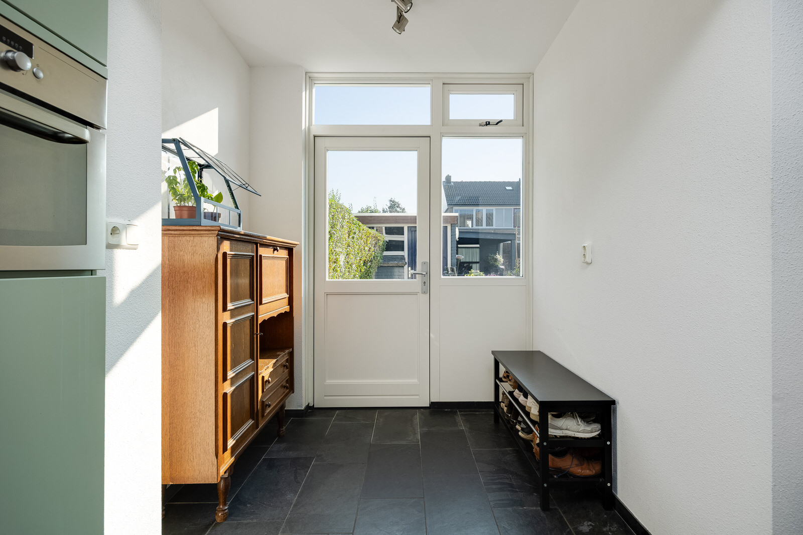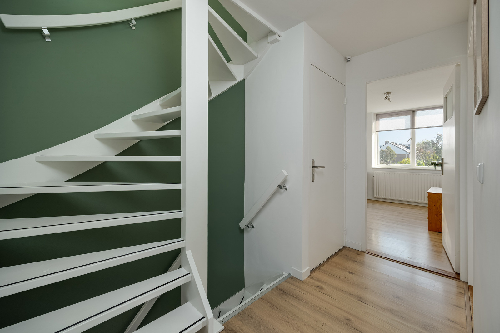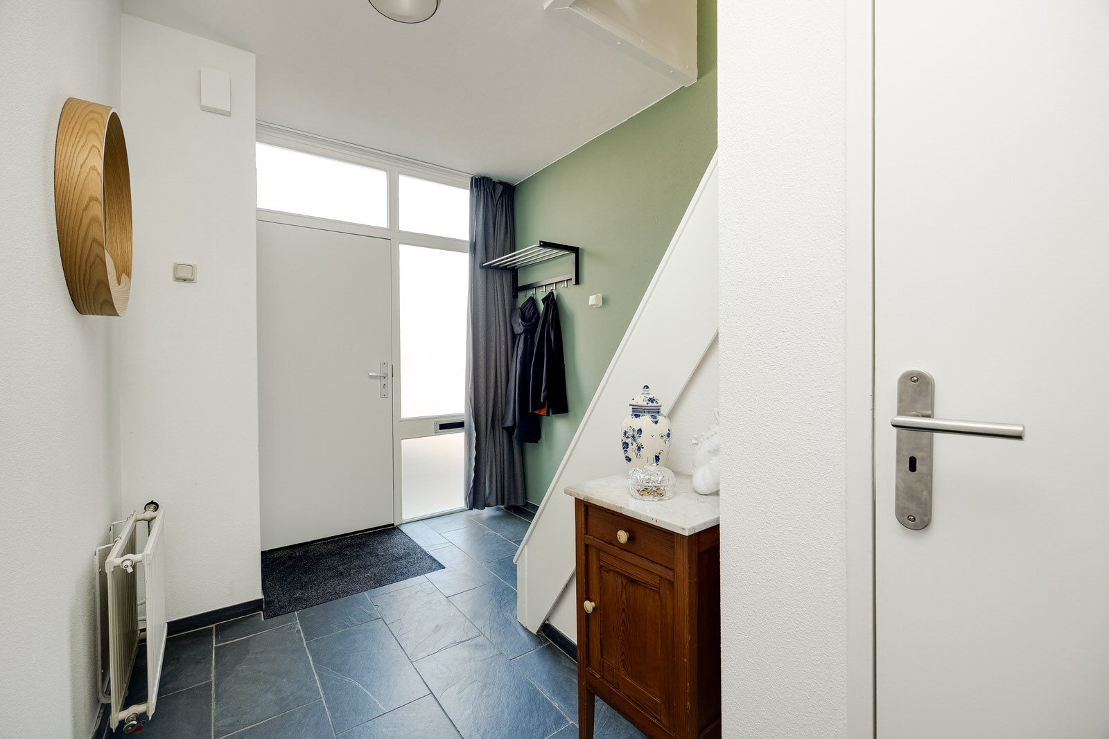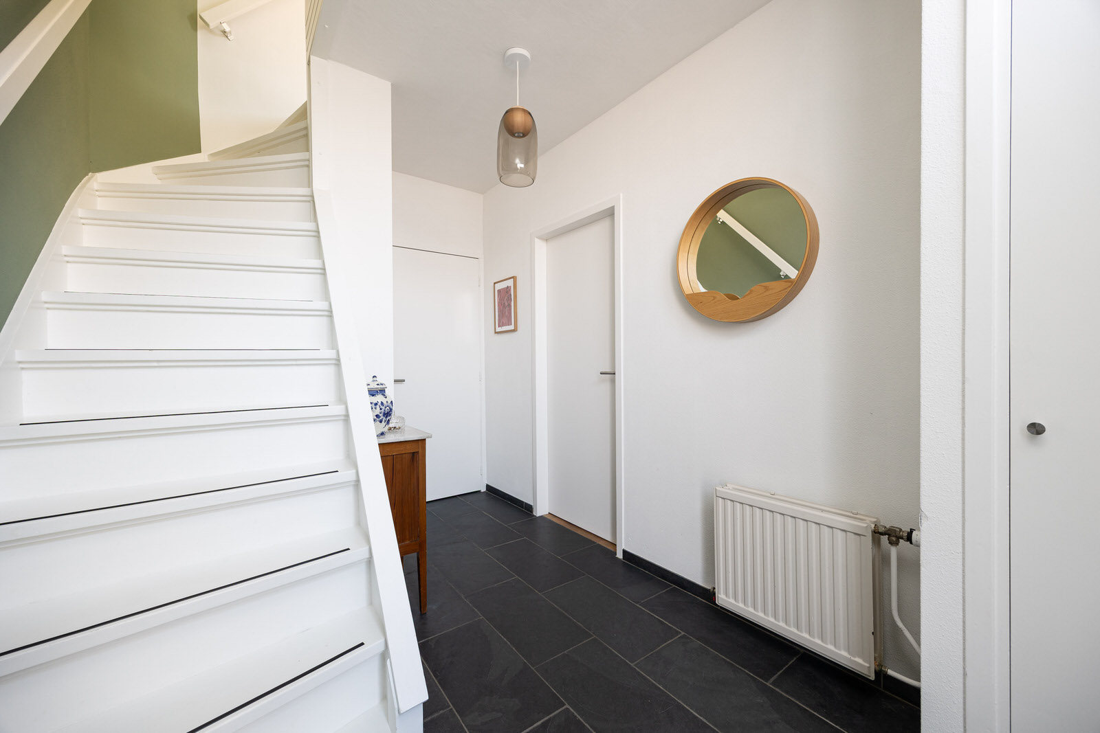 De overdekte entree geeft toegang tot de hal met meterkast (10 groepen en 3 aardlekschakelaars), toiletruimte, trapopgang en de doorgang naar de woonkamer. De hal is netjes afgewerkt en voorzien van een trapkast die praktische bergruimte biedt.