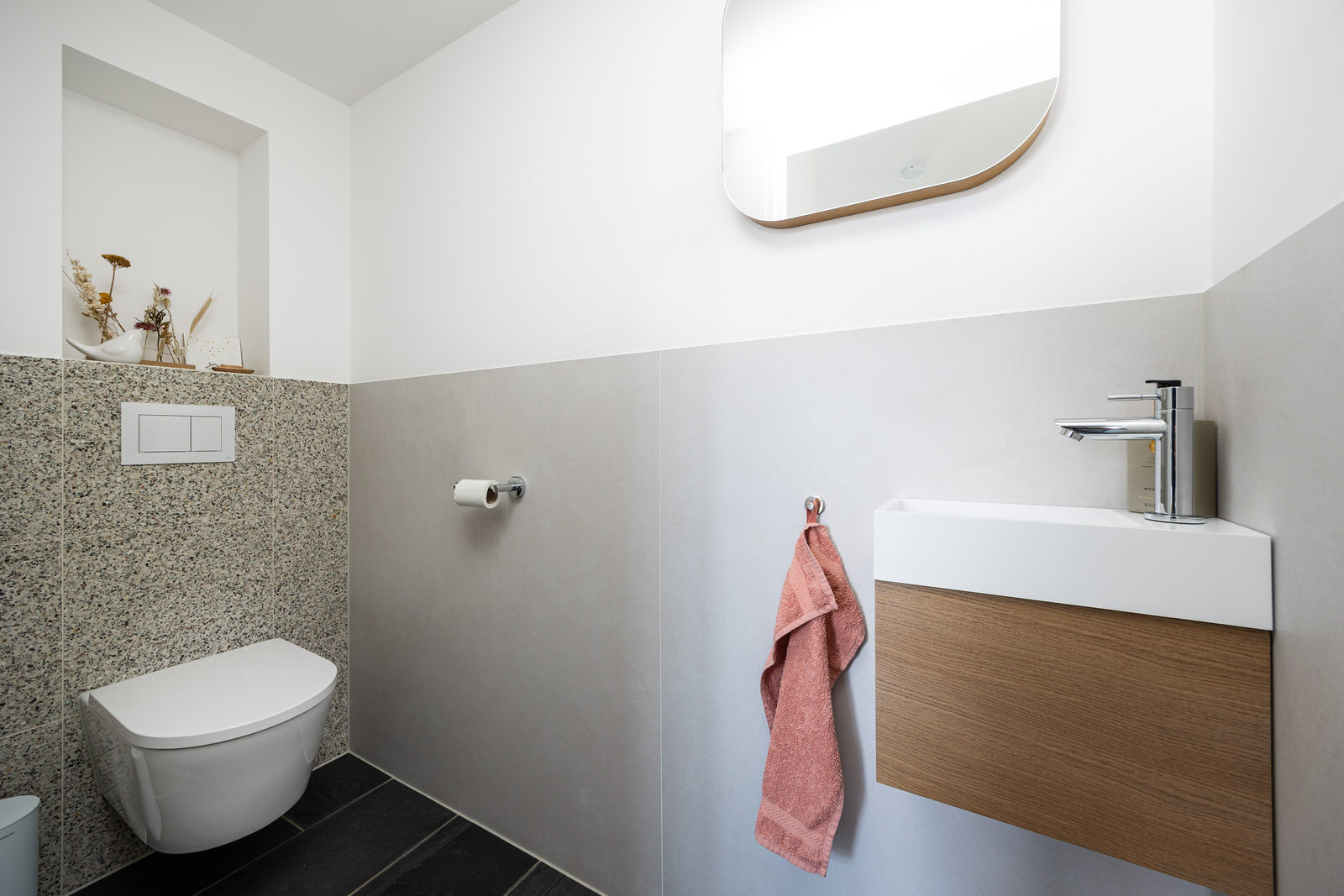 De toiletruimte is modern uitgevoerd met een wandcloset, een fonteintje en inbouwspots.