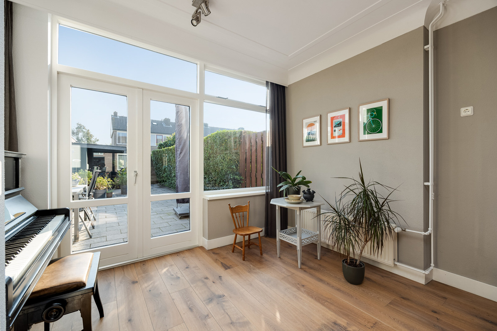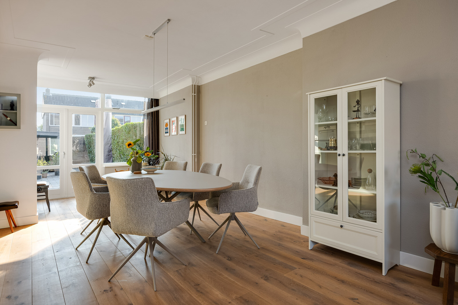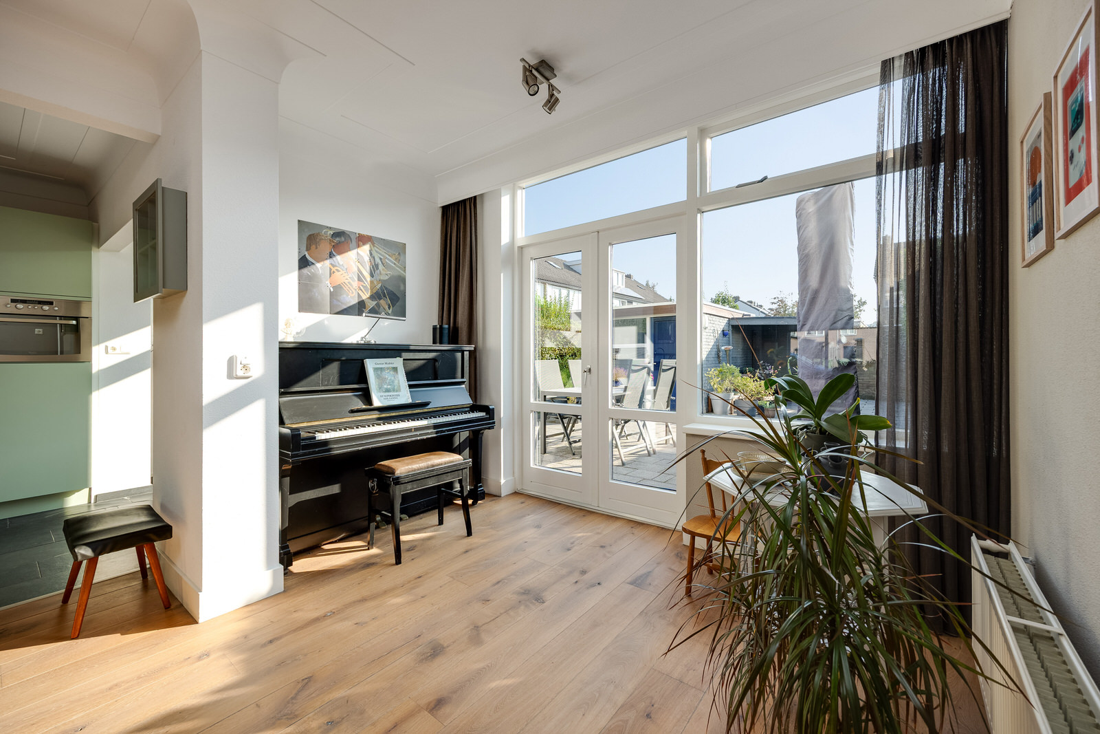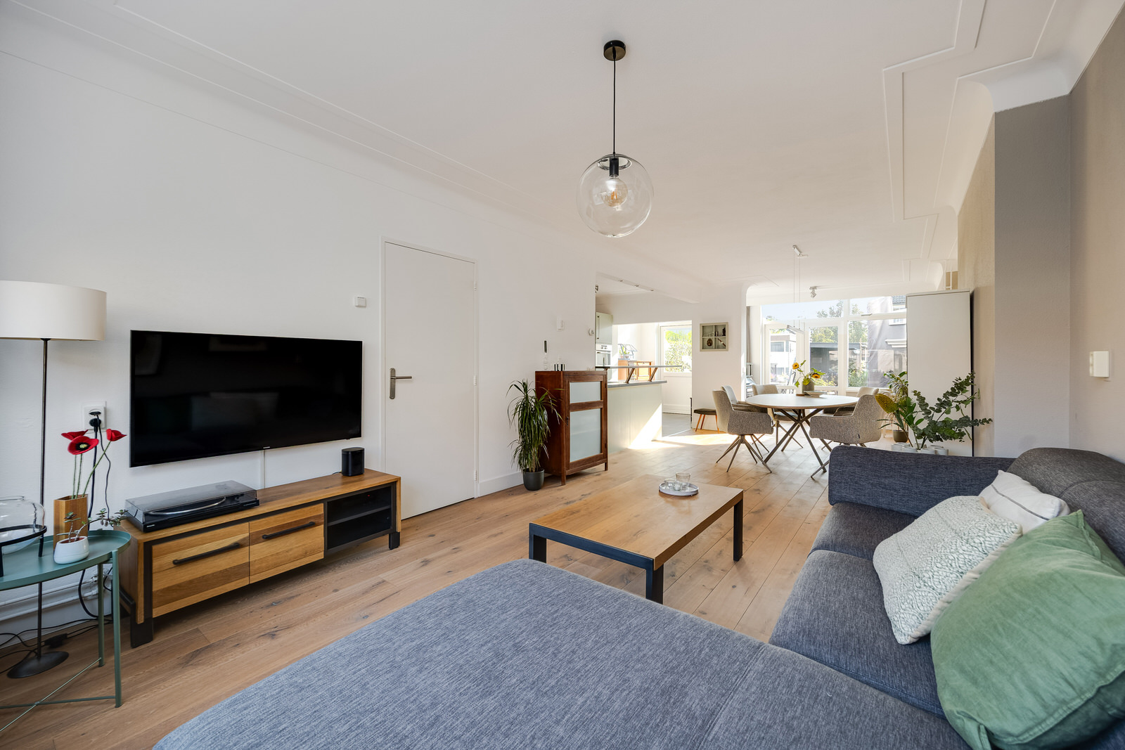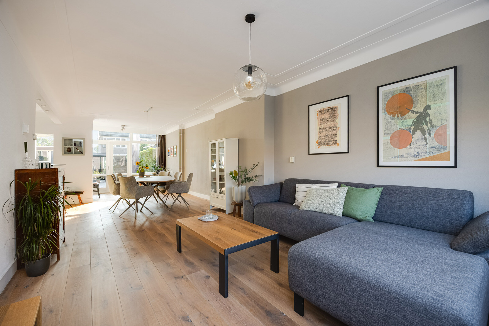 De uitgebouwde woonkamer is licht, ruim en sfeervol. Grote ramen aan zowel de voor- als achterzijde zorgen voor een prettige lichtinval. De houten vloer en de strakke wandafwerking geven de ruimte een warme, eigentijdse uitstraling. Er is voldoende plek voor een royale zithoek en een eethoek bij de openslaande tuindeuren. De dubbele deuren zorgen voor een mooie verbinding met de tuin en stap je direct het terras op.