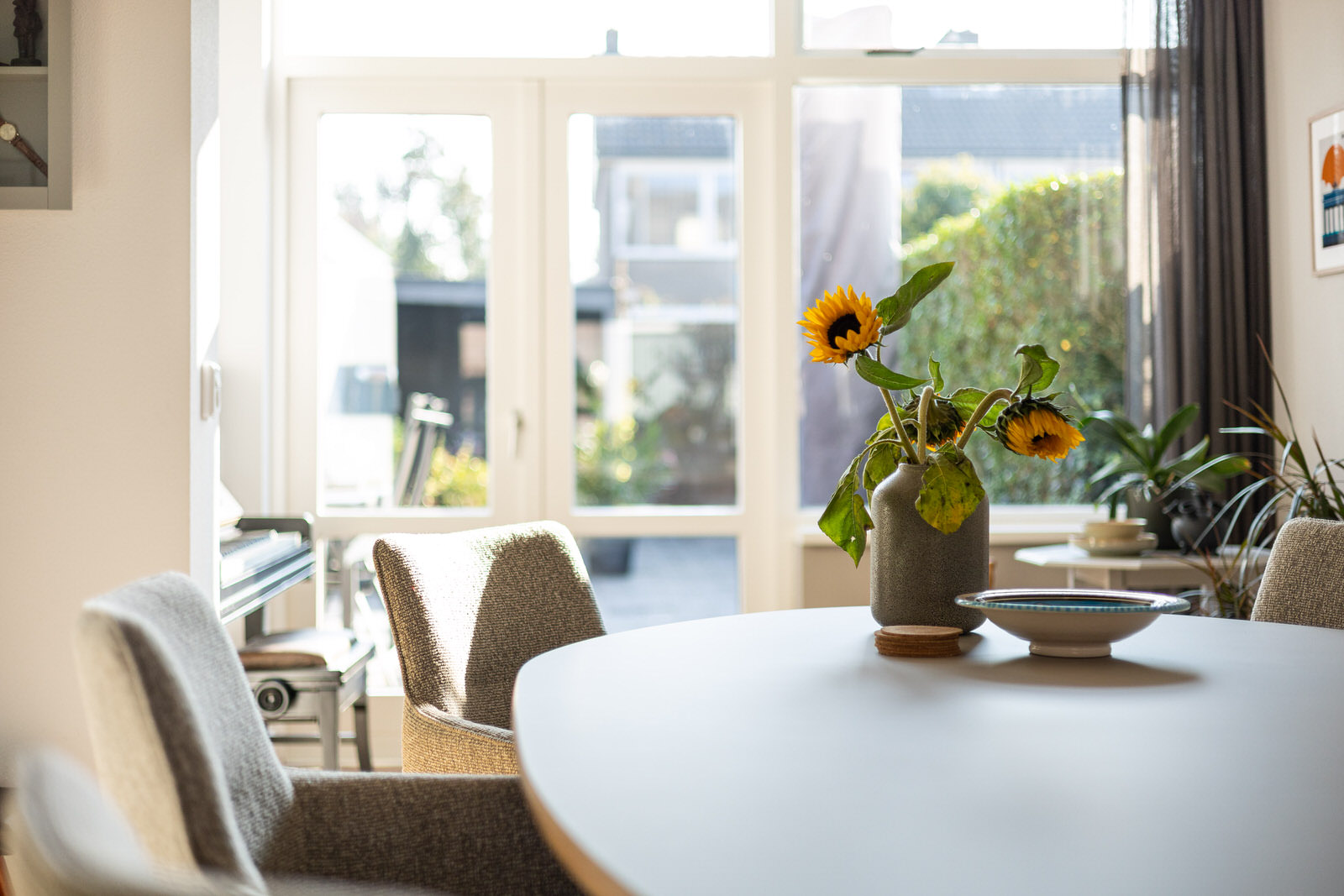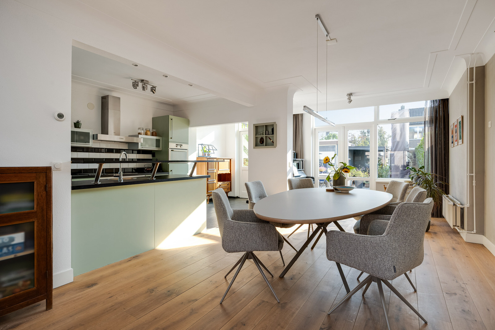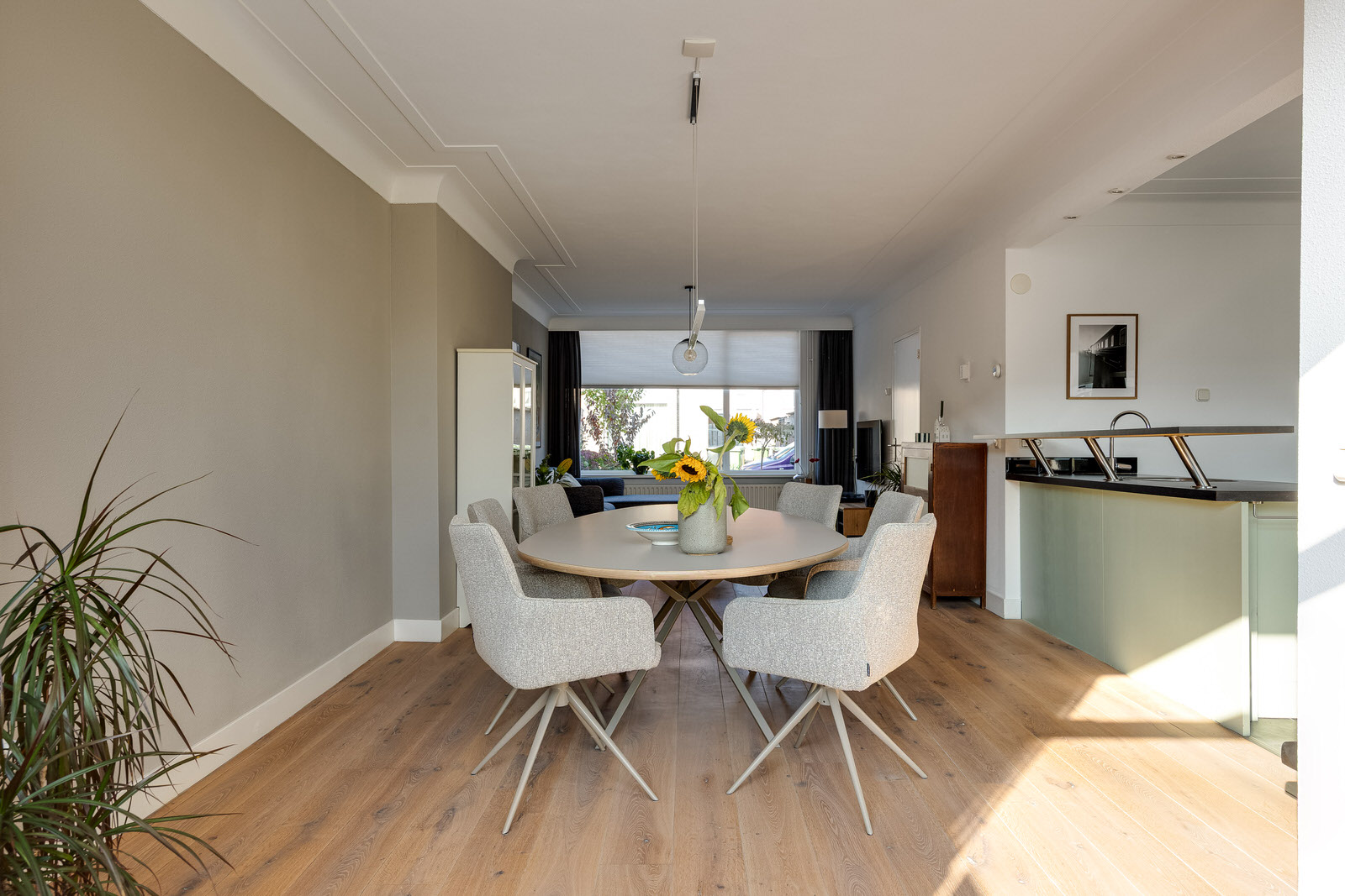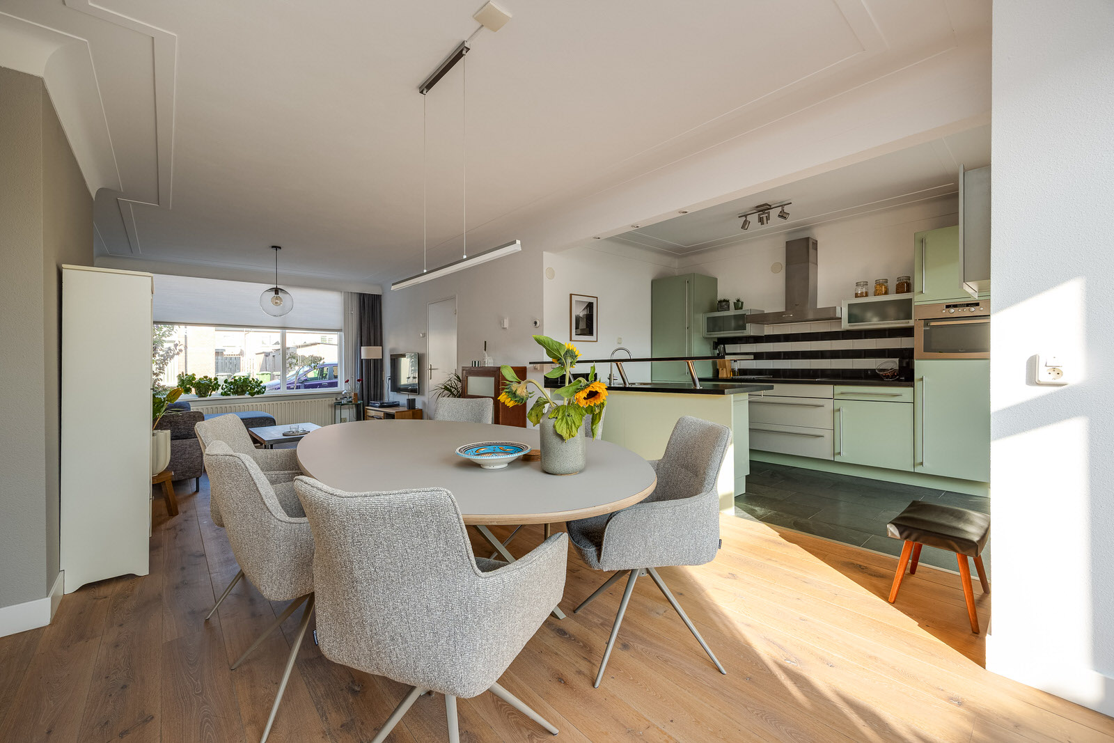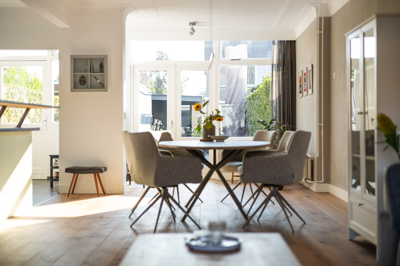 De uitgebouwde woonkamer is licht, ruim en sfeervol. Grote ramen aan zowel de voor- als achterzijde zorgen voor een prettige lichtinval. De houten vloer en de strakke wandafwerking geven de ruimte een warme, eigentijdse uitstraling. Er is voldoende plek voor een royale zithoek en een eethoek bij de openslaande tuindeuren. De dubbele deuren zorgen voor een mooie verbinding met de tuin en stap je direct het terras op.