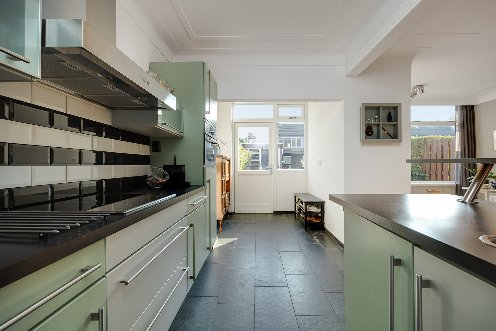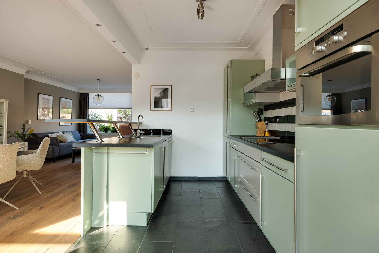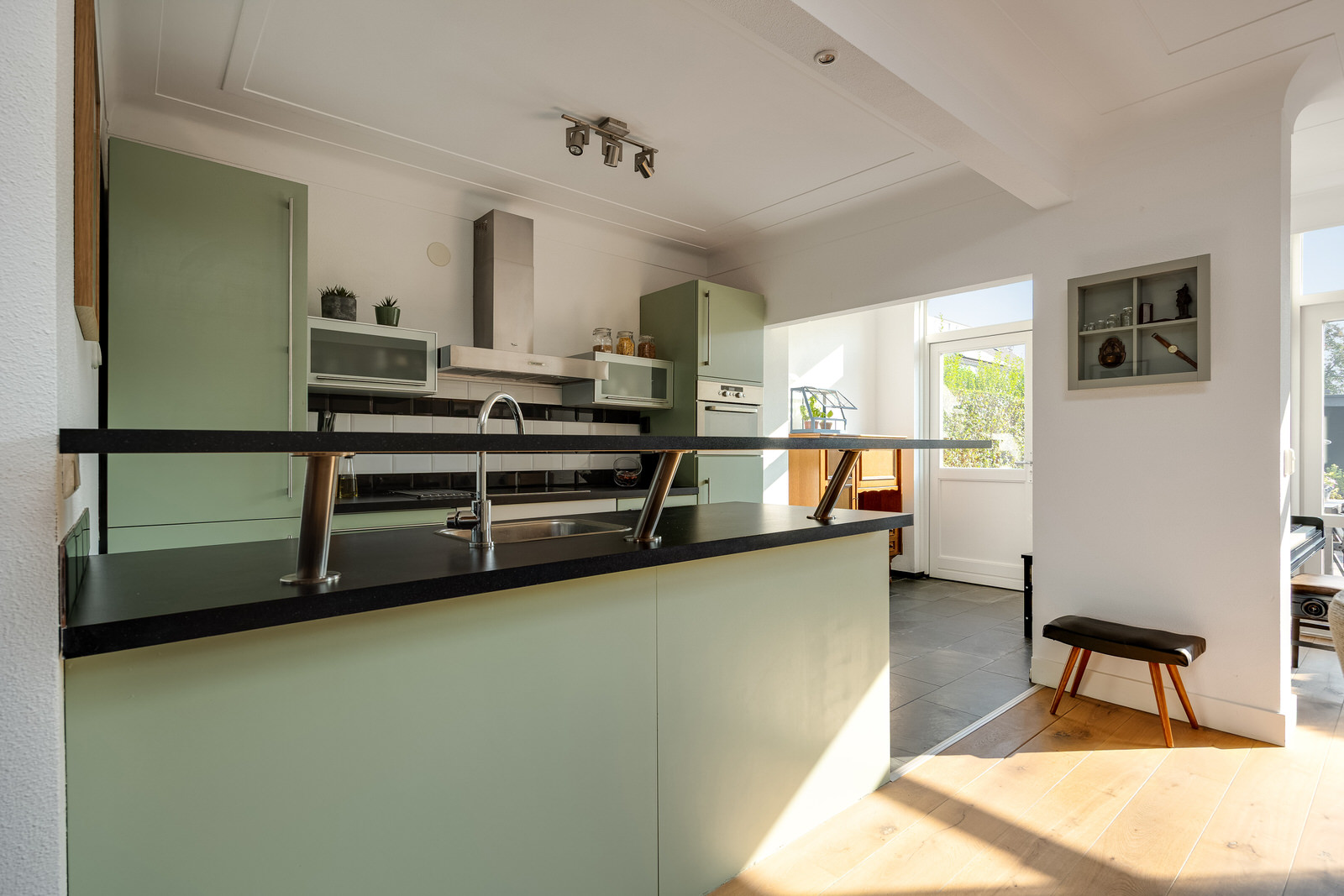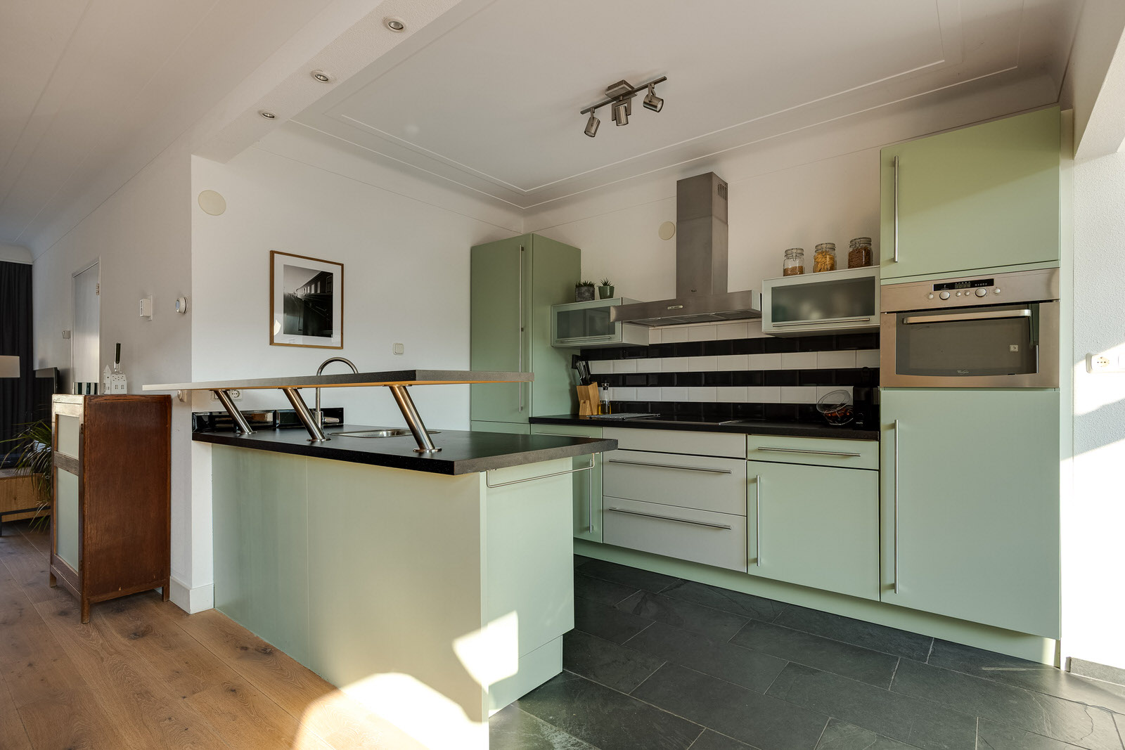 De open keuken met bar ligt aan de achterzijde van de woning en is uitgevoerd in een neutrale kleurstelling. De keuken is voorzien van een keramische kookplaat, afzuigkap, combi-oven, koelkast, vriezer en een vaatwasser die in 2023 is vernieuwd. Dankzij de praktische opstelling is er volop werk- en kastruimte.