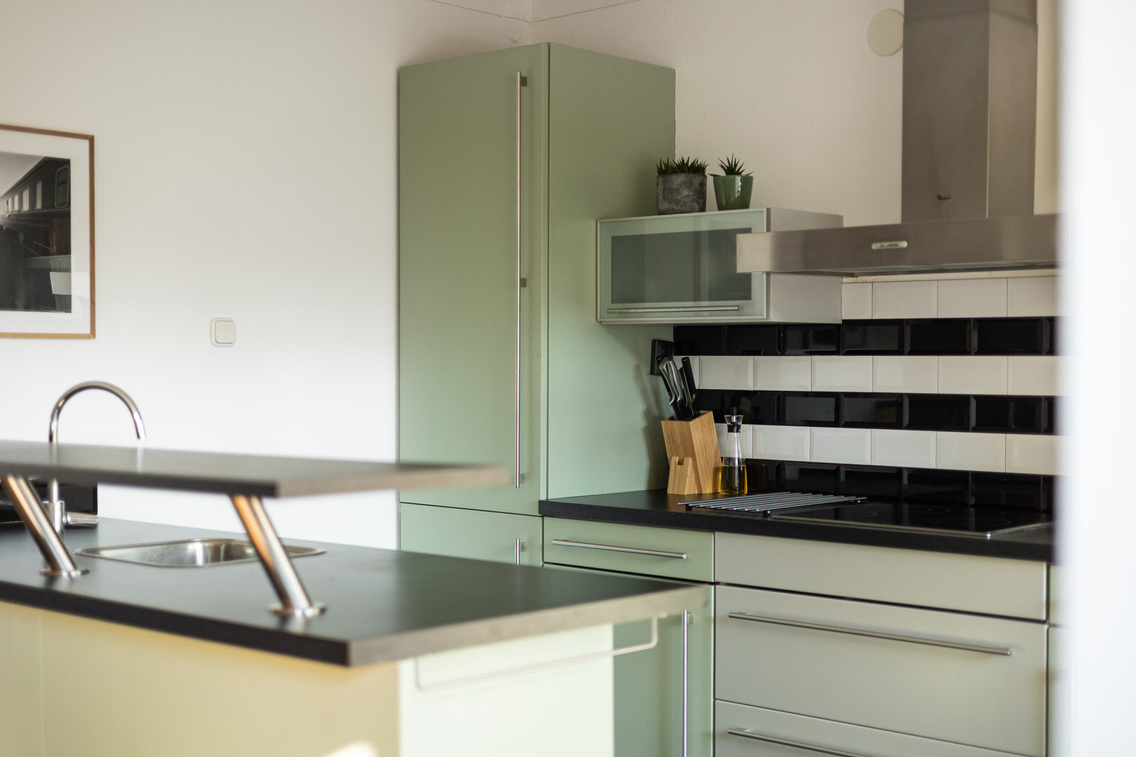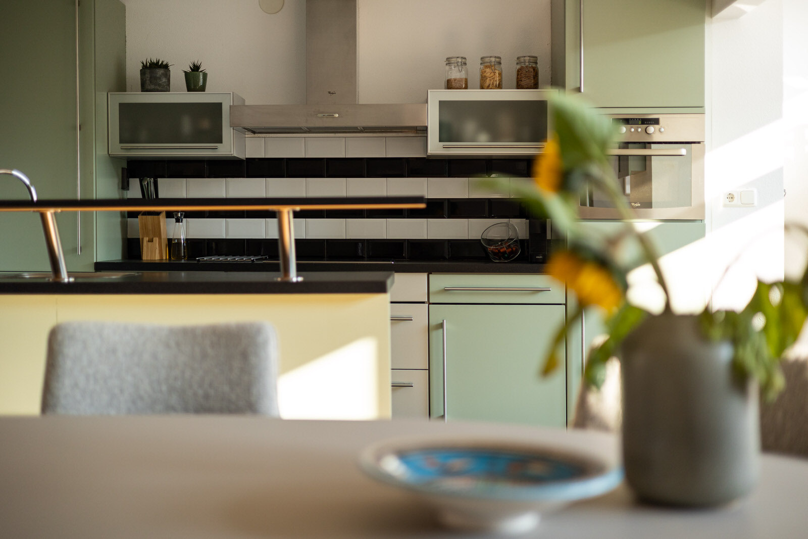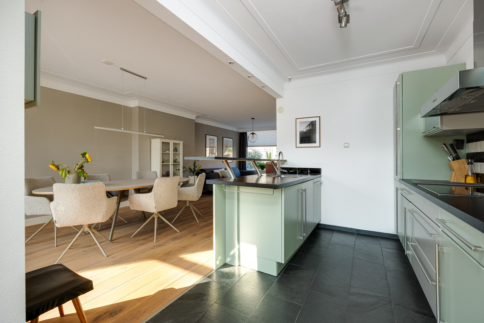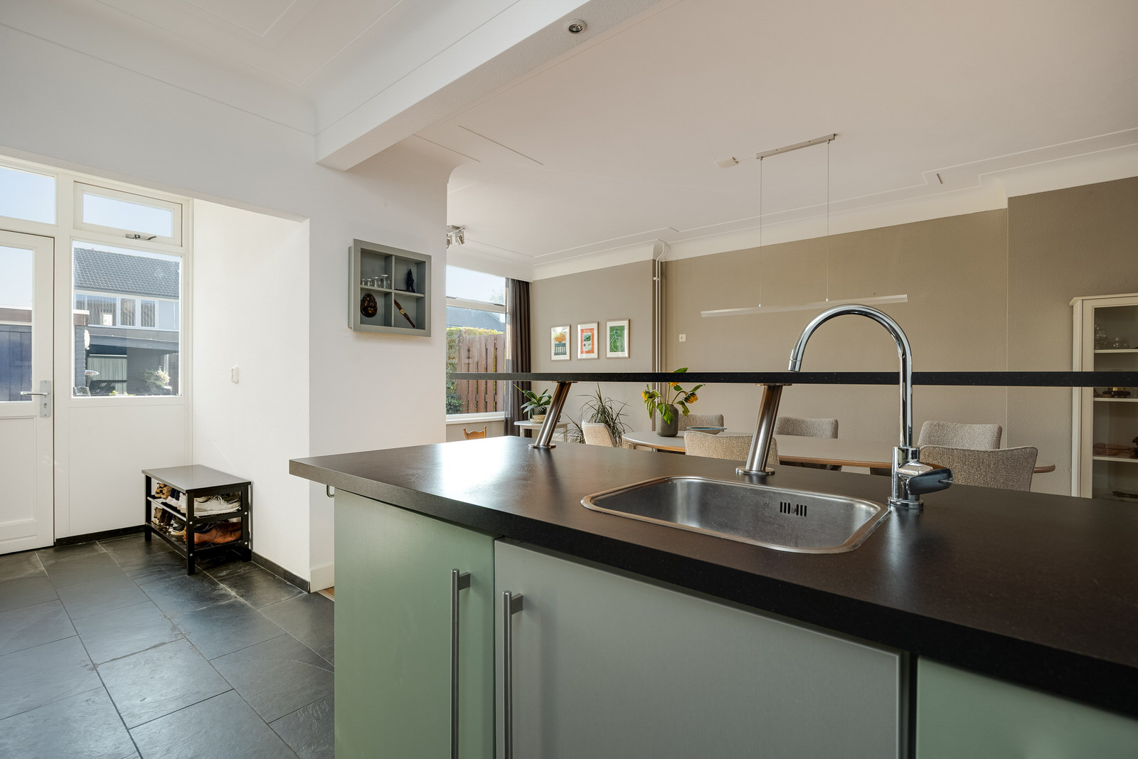 De open keuken met bar ligt aan de achterzijde van de woning en is uitgevoerd in een neutrale kleurstelling. De keuken is voorzien van een keramische kookplaat, afzuigkap, combi-oven, koelkast, vriezer en een vaatwasser die in 2023 is vernieuwd. Dankzij de praktische opstelling is er volop werk- en kastruimte.