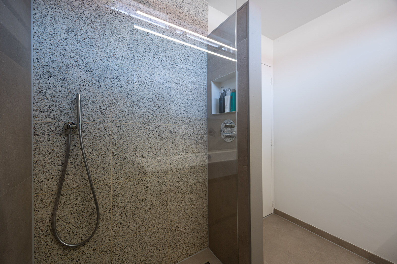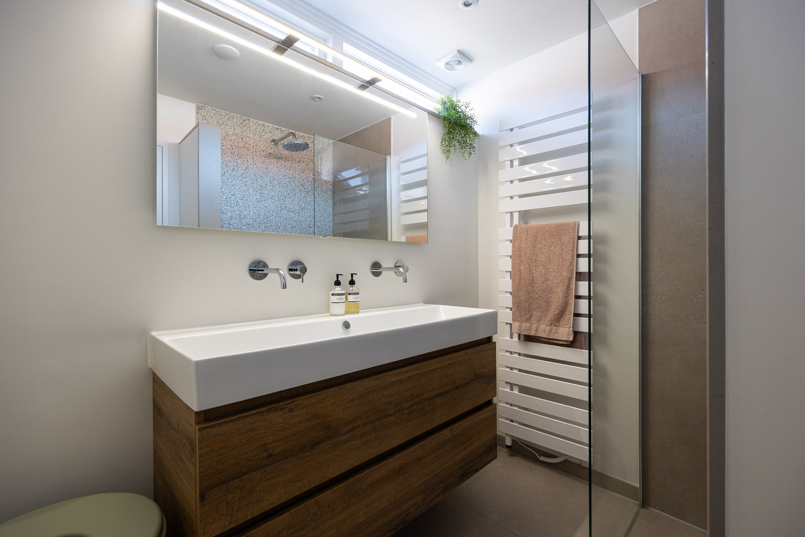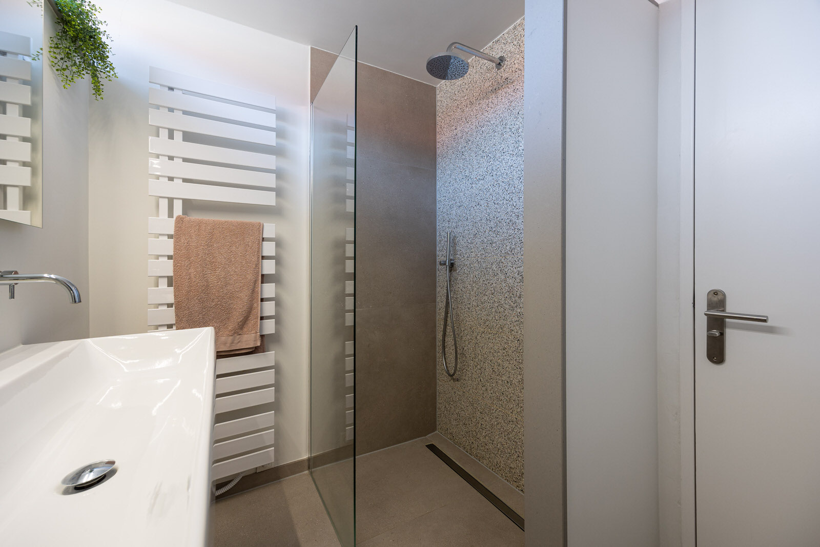 De badkamer is in het voorjaar van 2024 volledig vernieuwd. De ruimte is modern ingericht met een inloopdouche met glazen wand, een wastafelmeubel met dubbele kraan en een elektrische design haddoekradiator. De douche is voorzien van een handdouche en regendouche. De combinatie van lichte wandtegels, stucwerk en inbouwspots zorgt voor een frisse, eigentijdse uitstraling.
