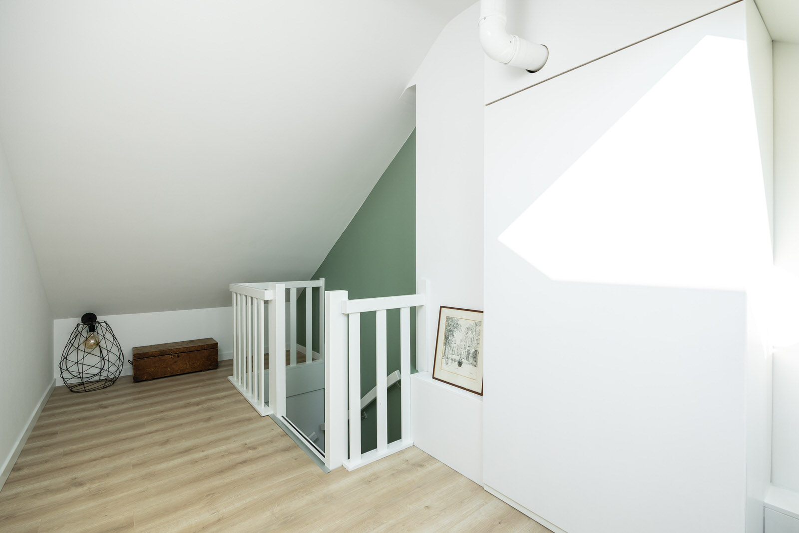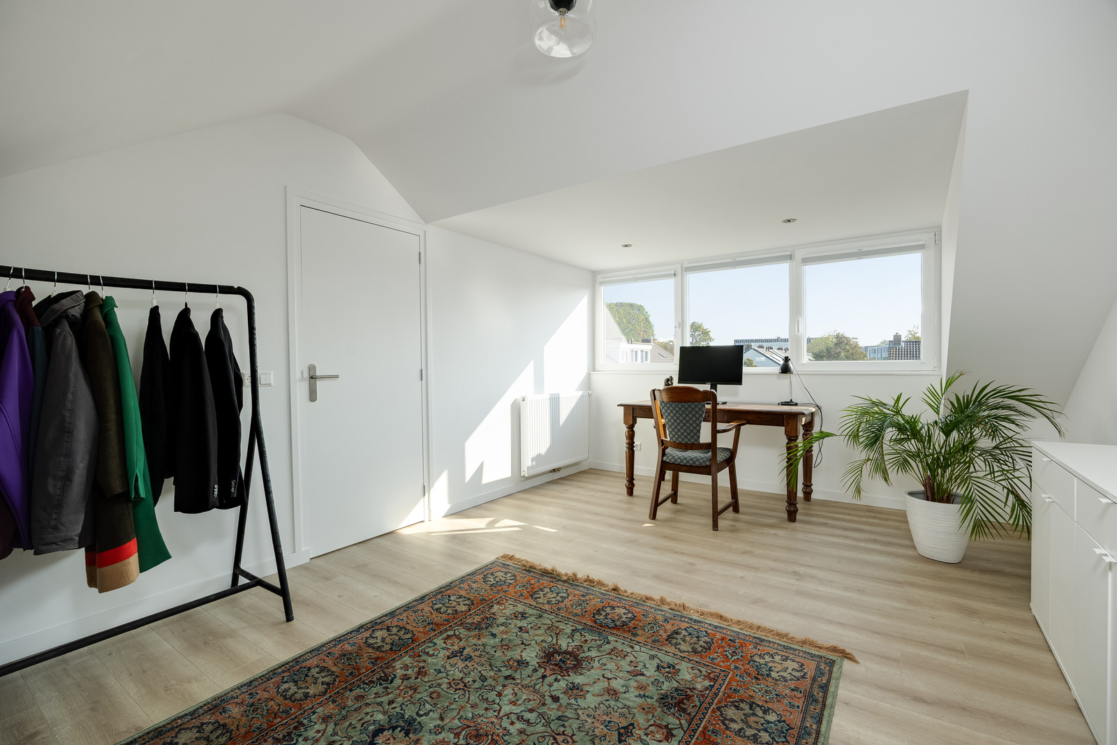 De ruime zolderkamer is in 2024 voorzien van een geïsoleerde dakkapel met plat dak en is uitstekend bruikbaar als vierde slaapkamer, werk- of hobbyruimte. Achter de knieschotten is extra bergruimte aanwezig.