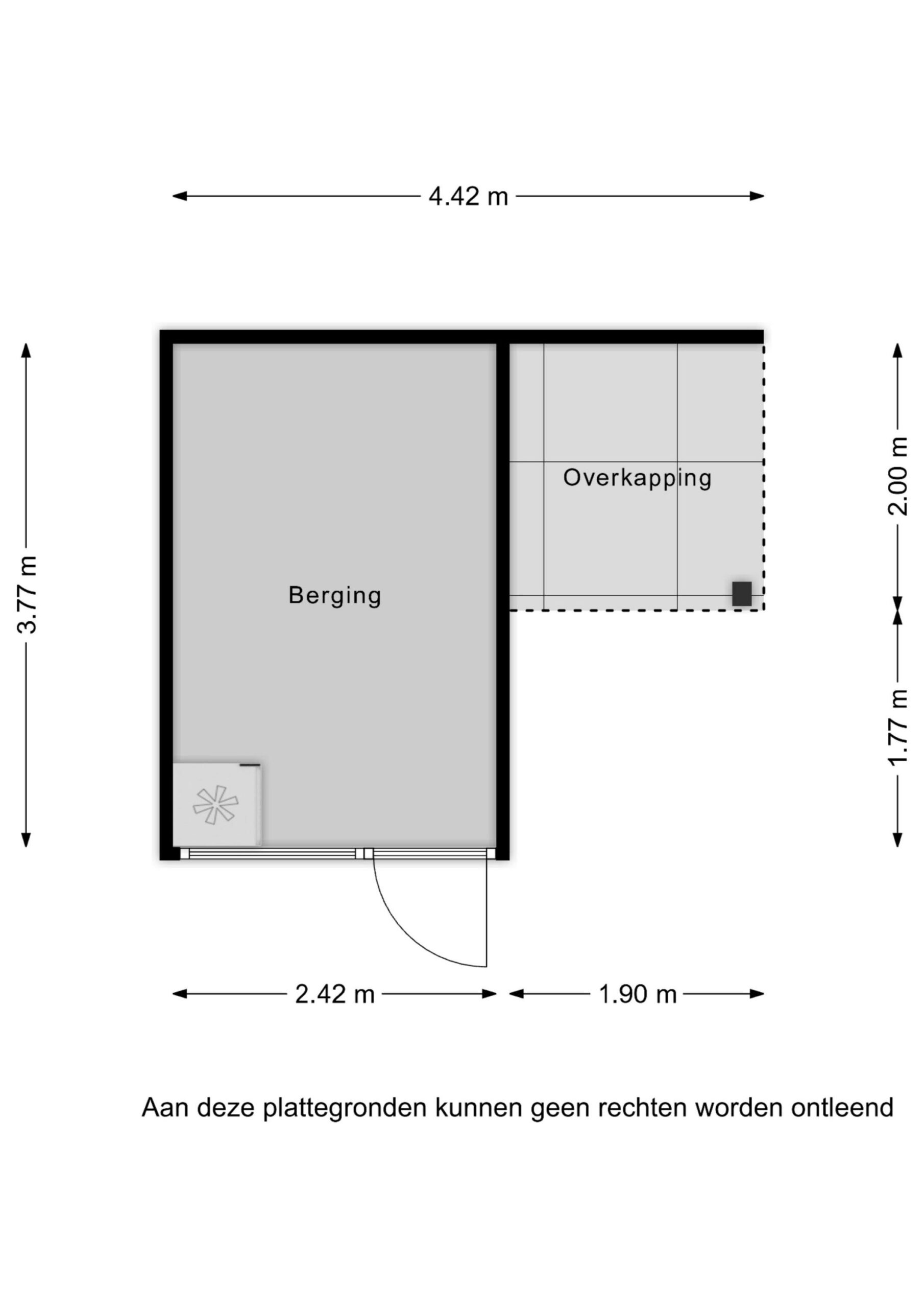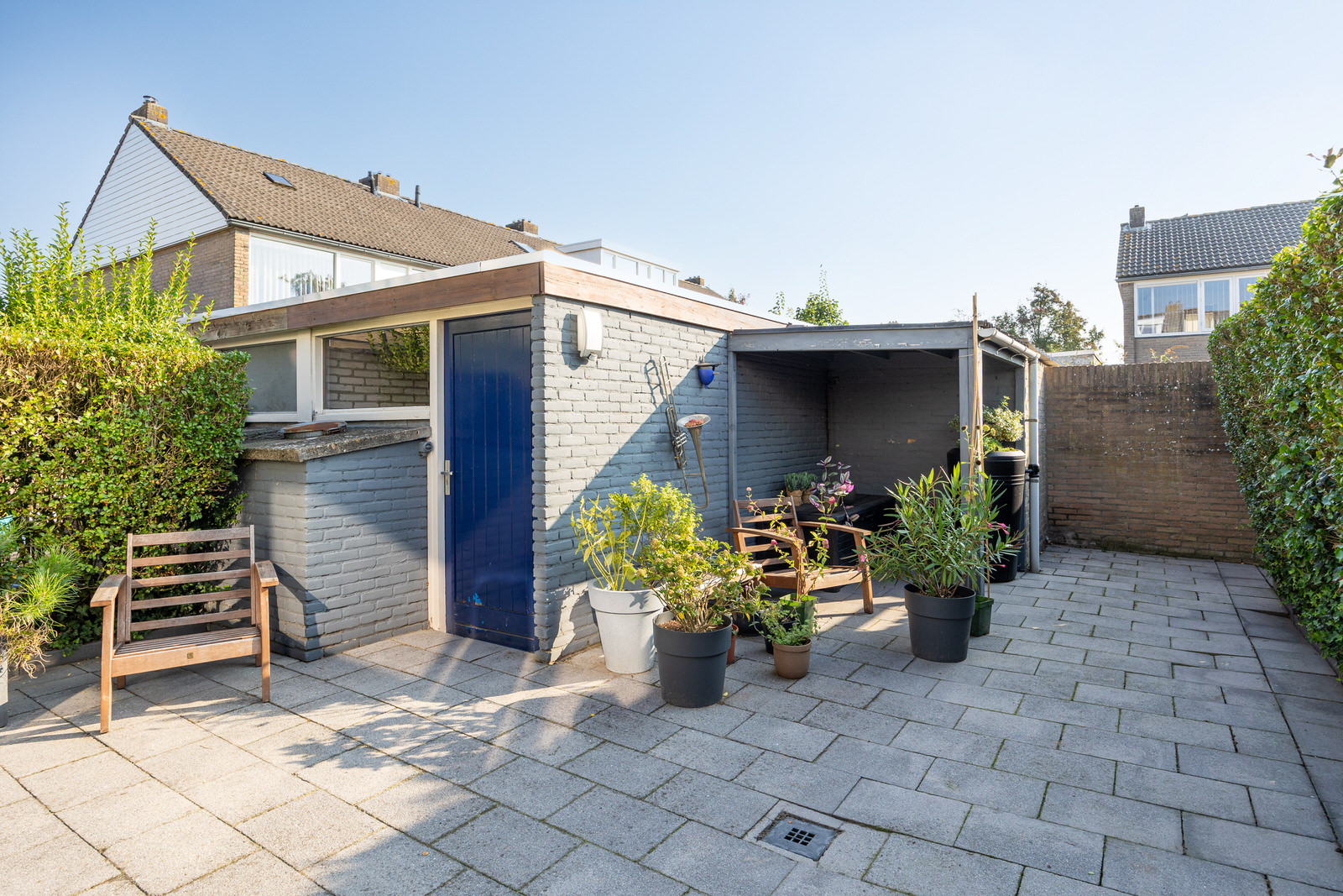 Achter in de tuin staat een stenen berging van circa 3,77 bij 2,42 meter, voorzien van elektra. Aangrenzend bevindt zich een overkapping die ruimte biedt voor fietsen of als sfeervolle zitplek waar je tot in de avonduren beschut kunt zitten.