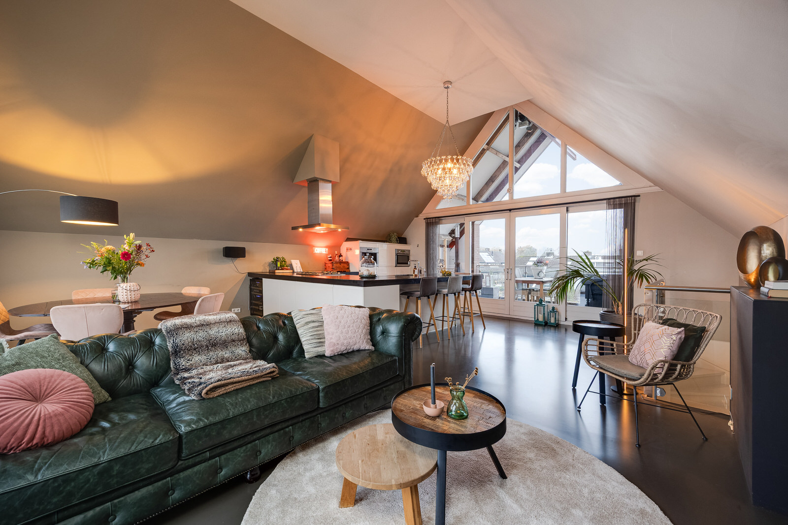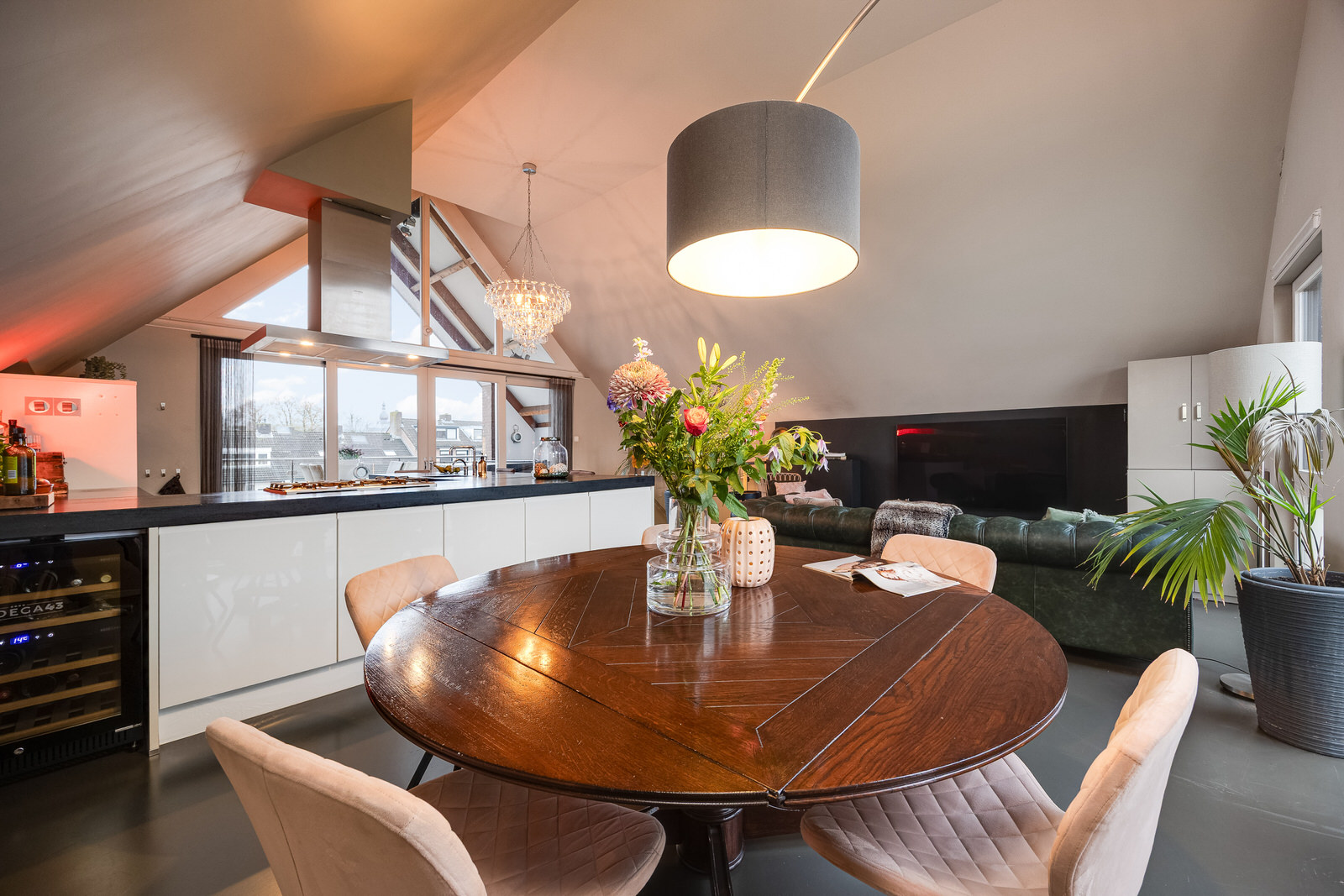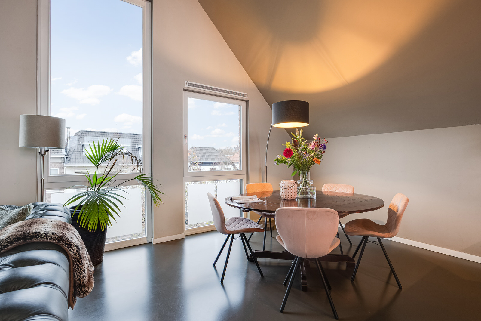 Aan de voorzijde bevinden zich het zitgedeelte en de eethoek. De hoge ramen en schuine kap zorgen voor een ruimtelijk gevoel en bieden een vrij uitzicht over het Marktveld. De eethoek ligt centraal in de ruimte, tussen het woongedeelte en de keuken. De plek leent zich uitstekend voor een grote eettafel en vormt een natuurlijk middelpunt op deze verdieping.