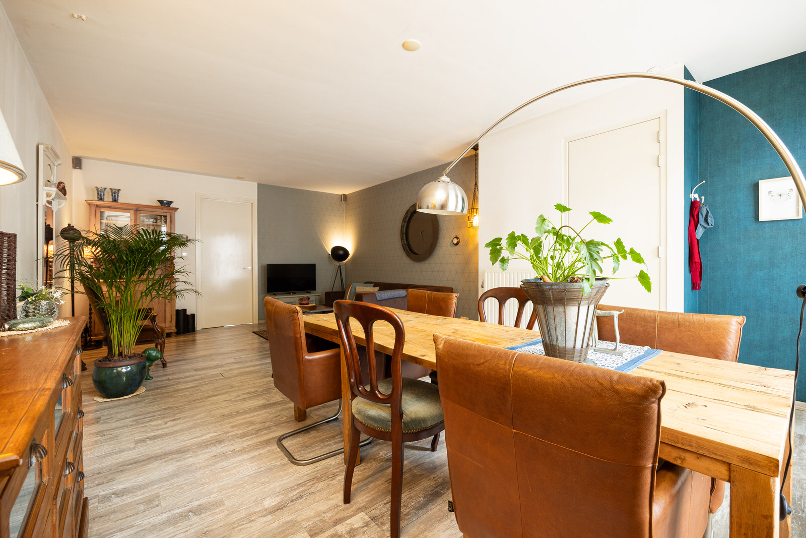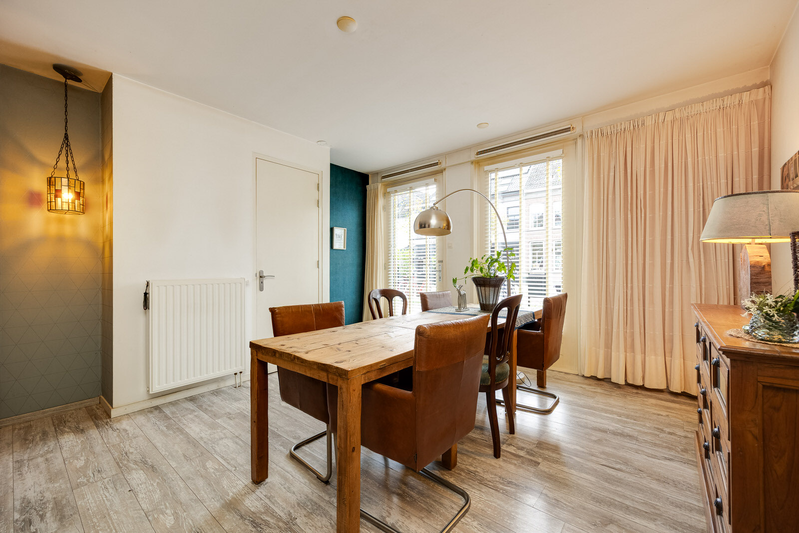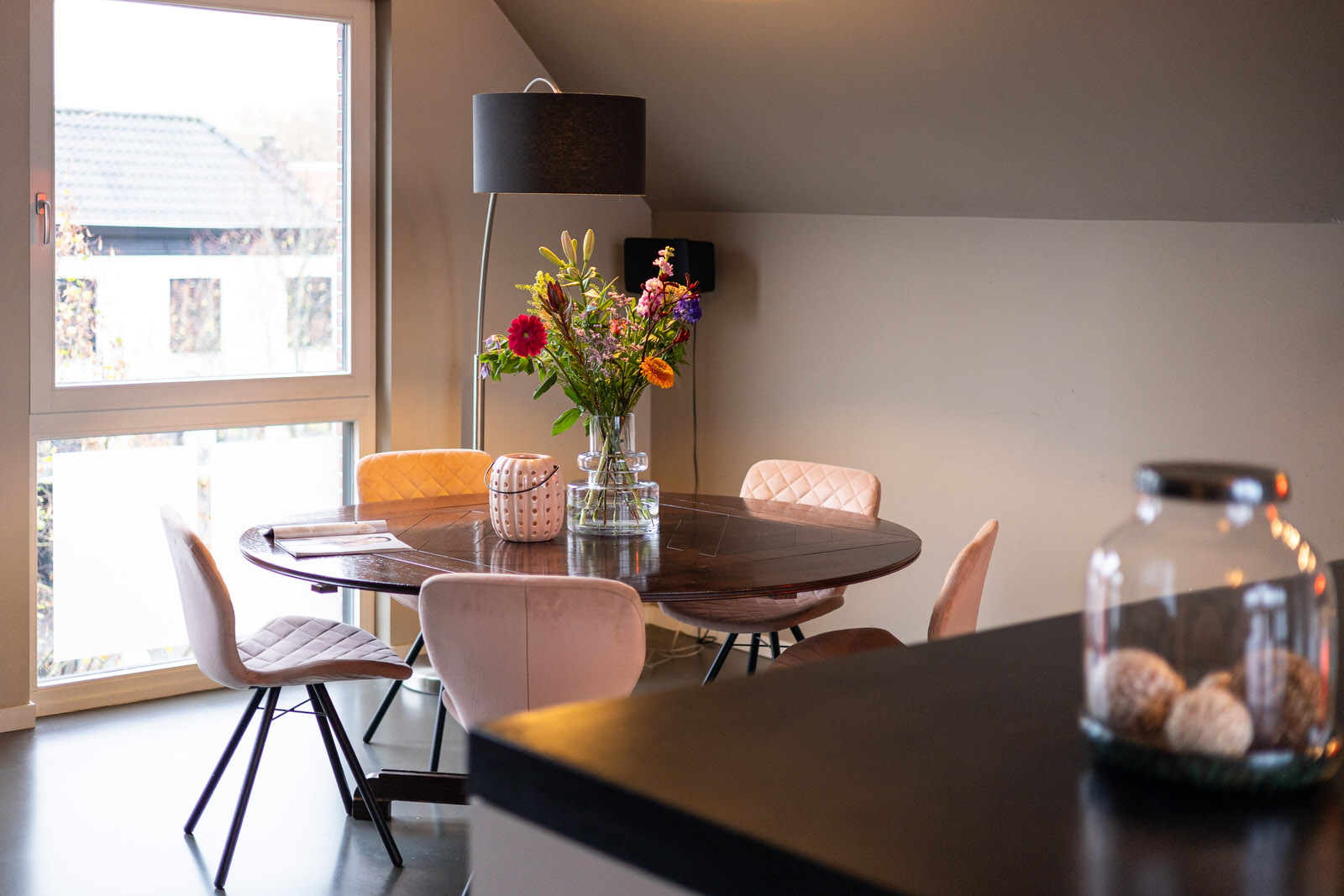 Aan de voorzijde bevinden zich het zitgedeelte en de eethoek. De hoge ramen en schuine kap zorgen voor een ruimtelijk gevoel en bieden een vrij uitzicht over het Marktveld. De eethoek ligt centraal in de ruimte, tussen het woongedeelte en de keuken. De plek leent zich uitstekend voor een grote eettafel en vormt een natuurlijk middelpunt op deze verdieping.