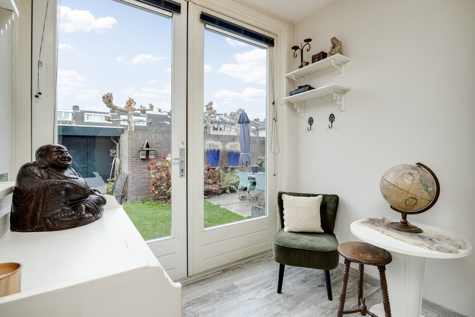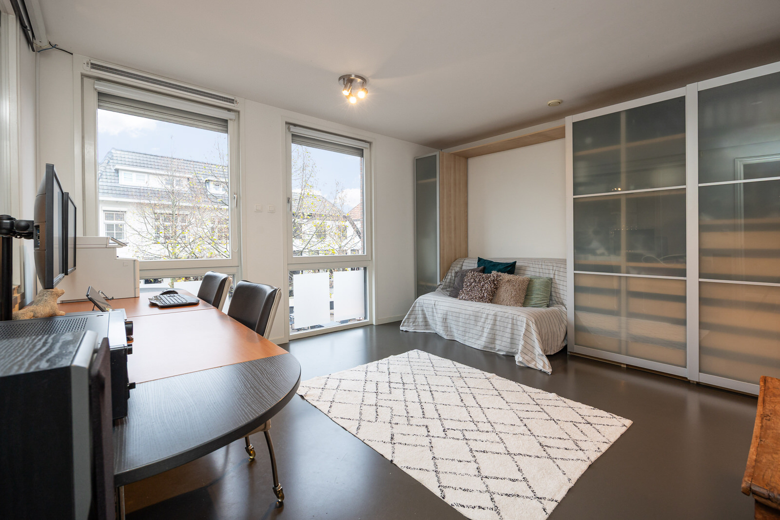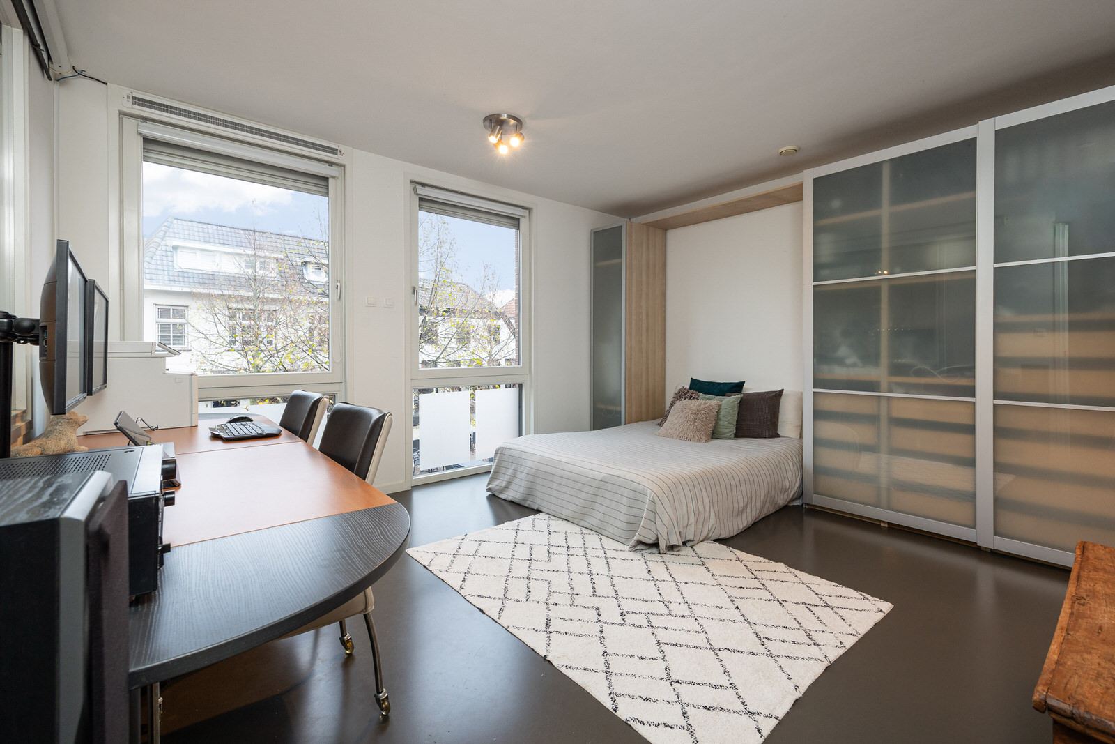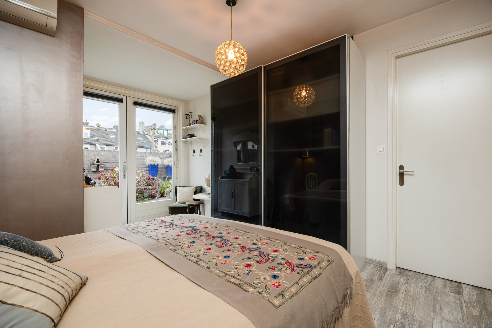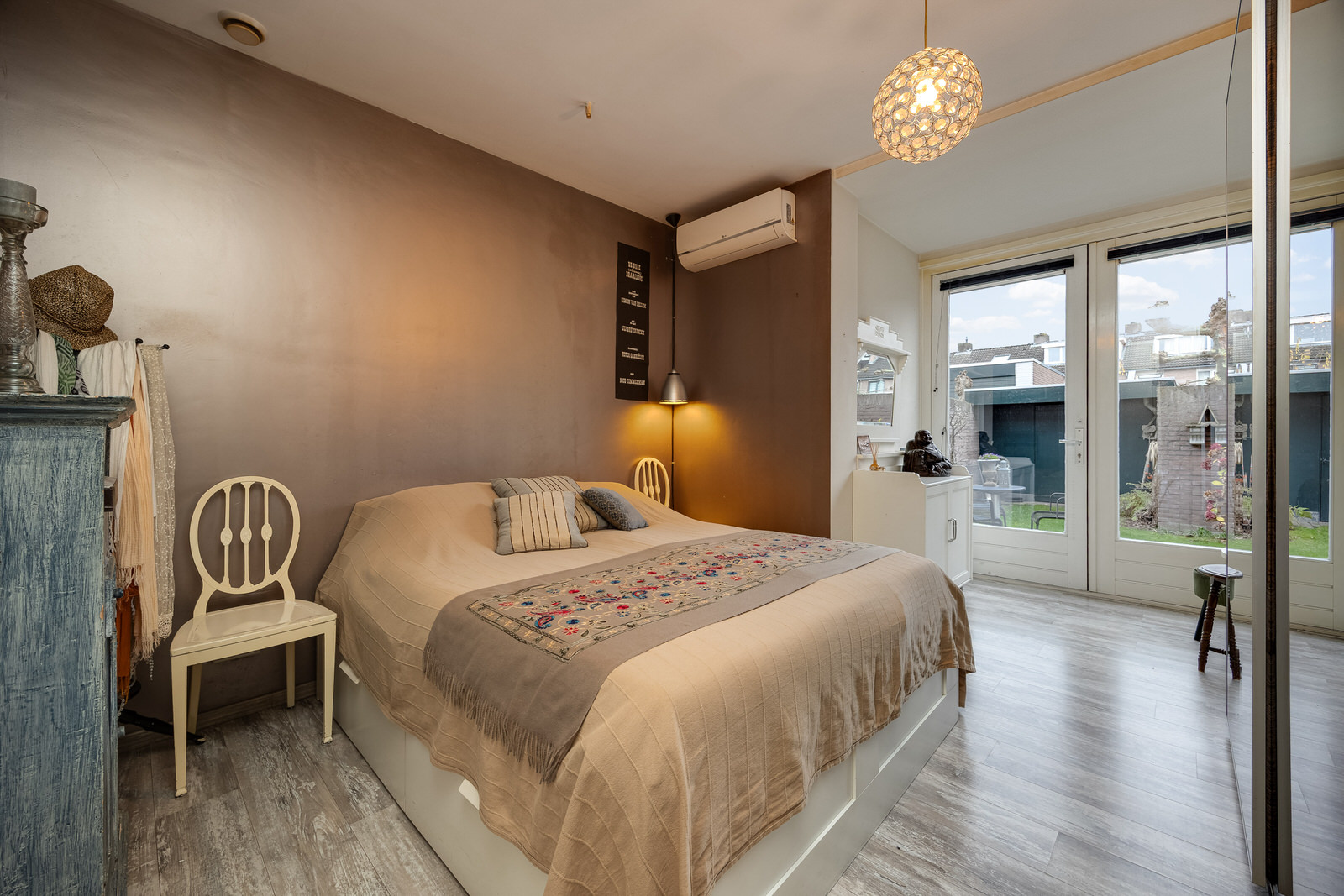 Aangrenzend aan de woonkamer bevindt zich de slaapkamer, voorzien van openslaande deuren naar de achtertuin. Deze ruimte beschikt over een airco-unit en is goed bruikbaar als slaapruimte, maar ook als werk- of hobbykamer.