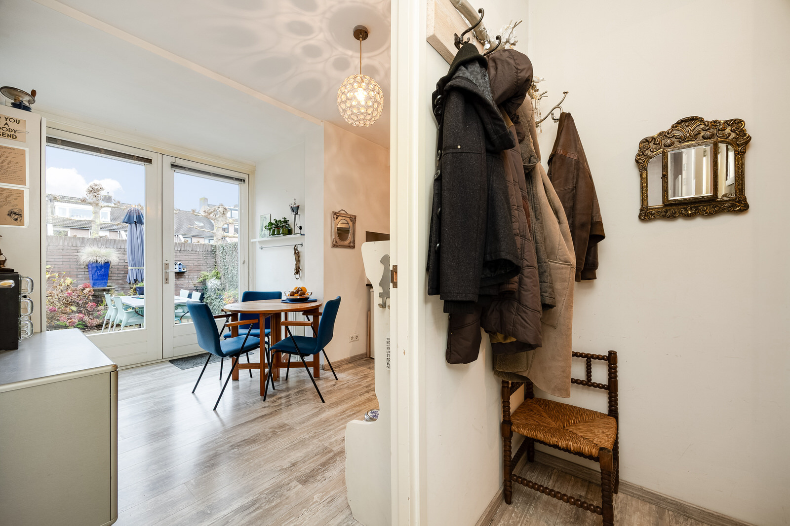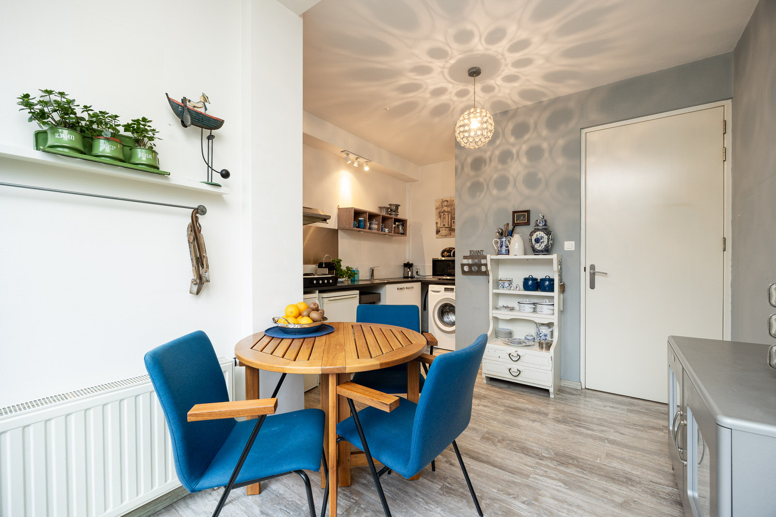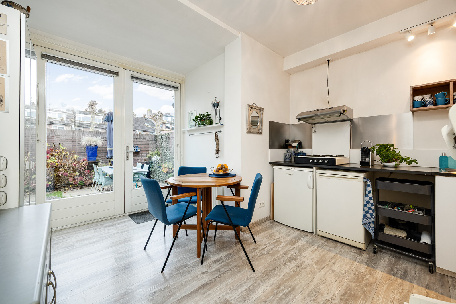 Via een tussenportaal is de keuken bereikbaar. De lichte opstelling bevindt zich aan de achterzijde van het pand en biedt zicht op de tuin. Via de openslaande deuren is de achtertuin bereikbaar.