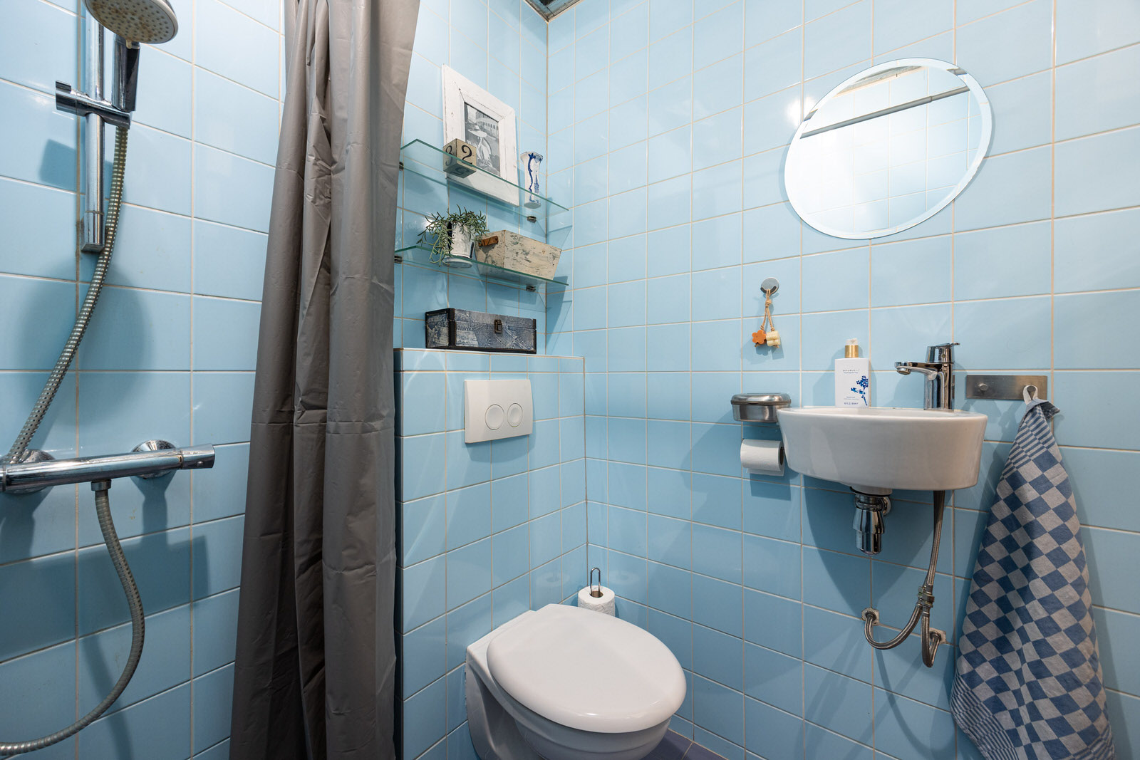 De badkamer is geheel betegeld en voorzien van een douche met thermostatische kraan, een wastafel en een zwevend closet.