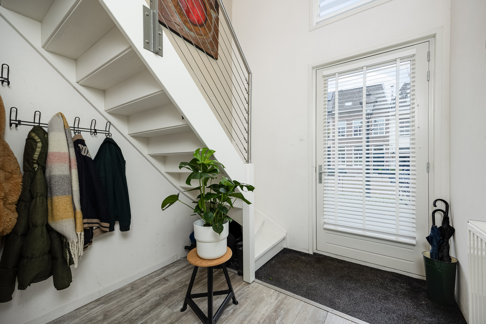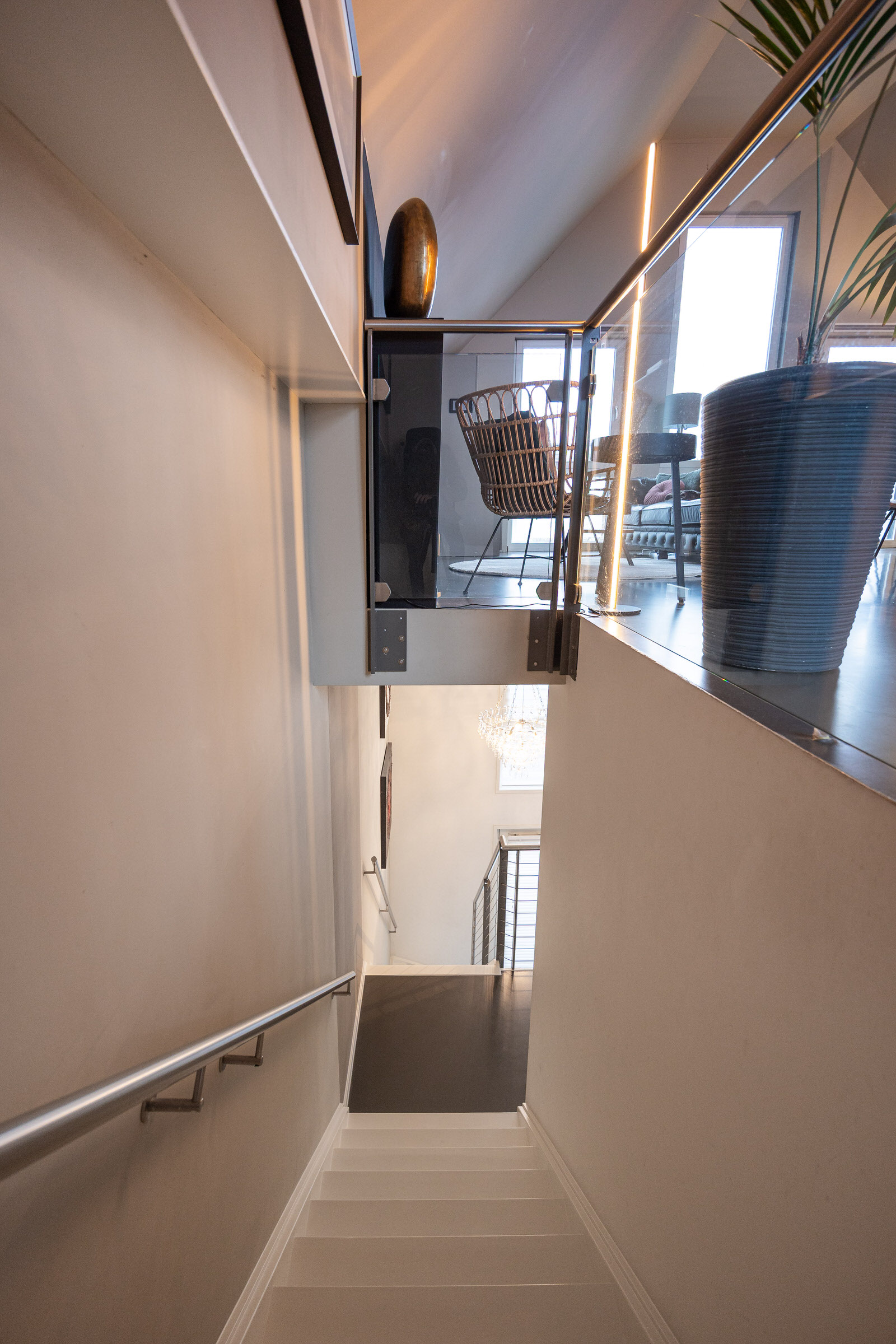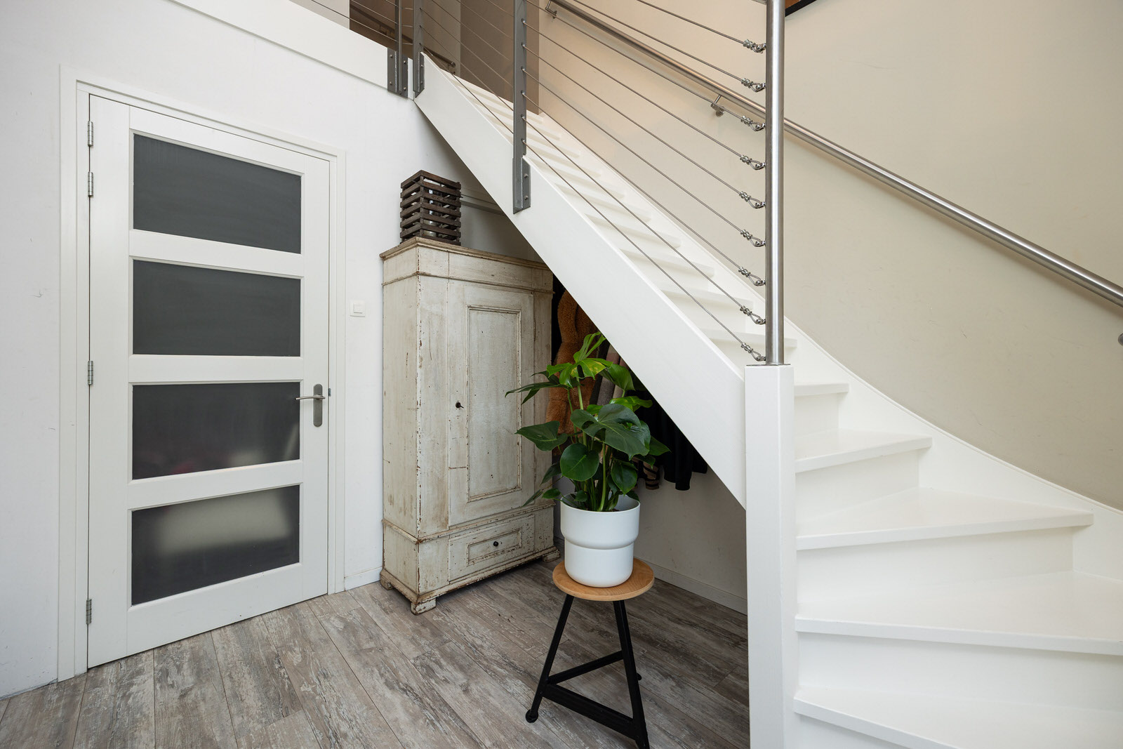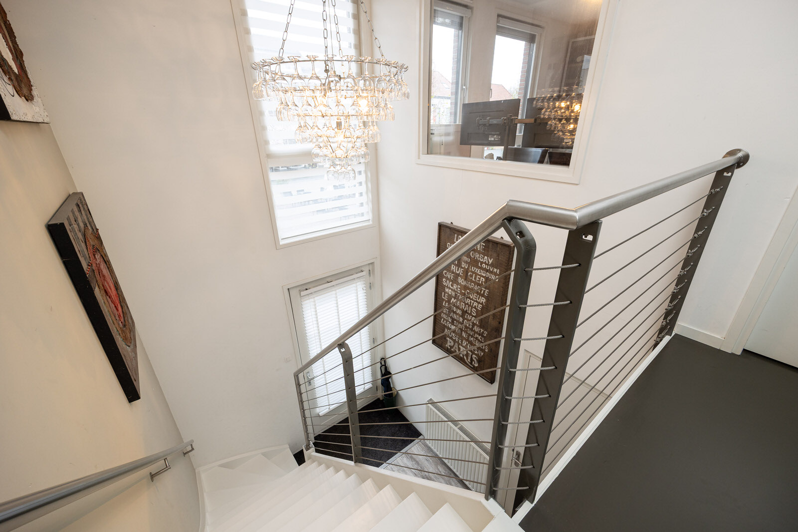 De ruime hal vormt een indrukwekkende binnenkomst door de hoogte tot aan de vide op de verdieping. De hal biedt toegang tot de meterkast, de inpandige berging met cv-ketel en de unit van de centrale stofzuiginstallatie. De trap leidt naar de eerste verdieping. Er bestaat tevens een mogelijkheid om op deze plek een boodschappenlift te realiseren.