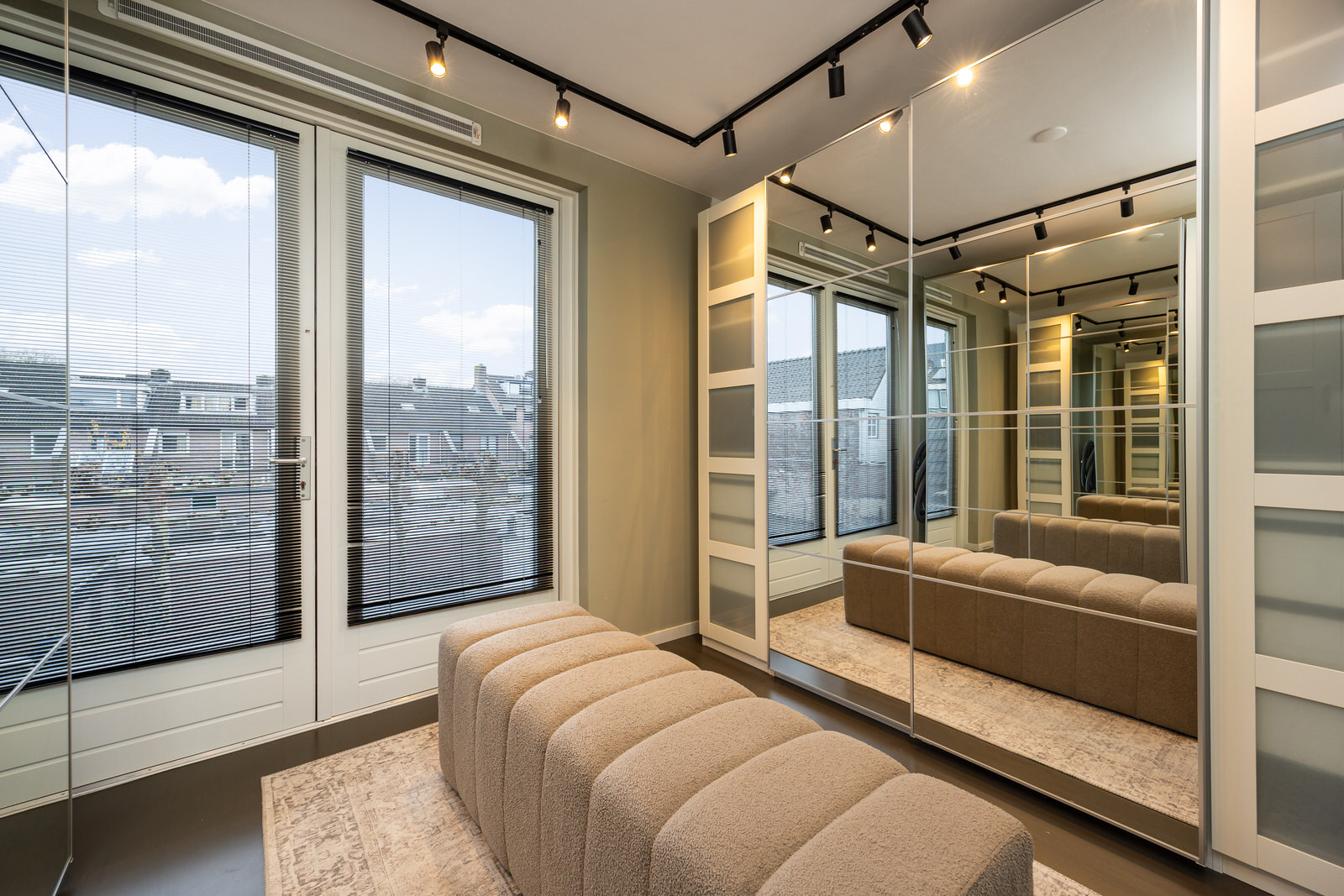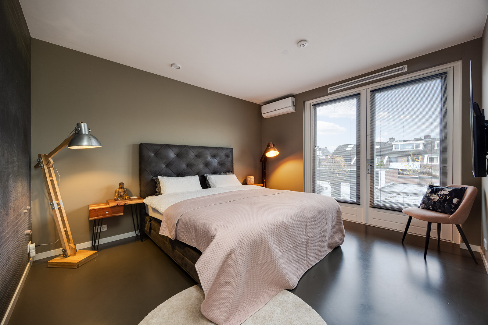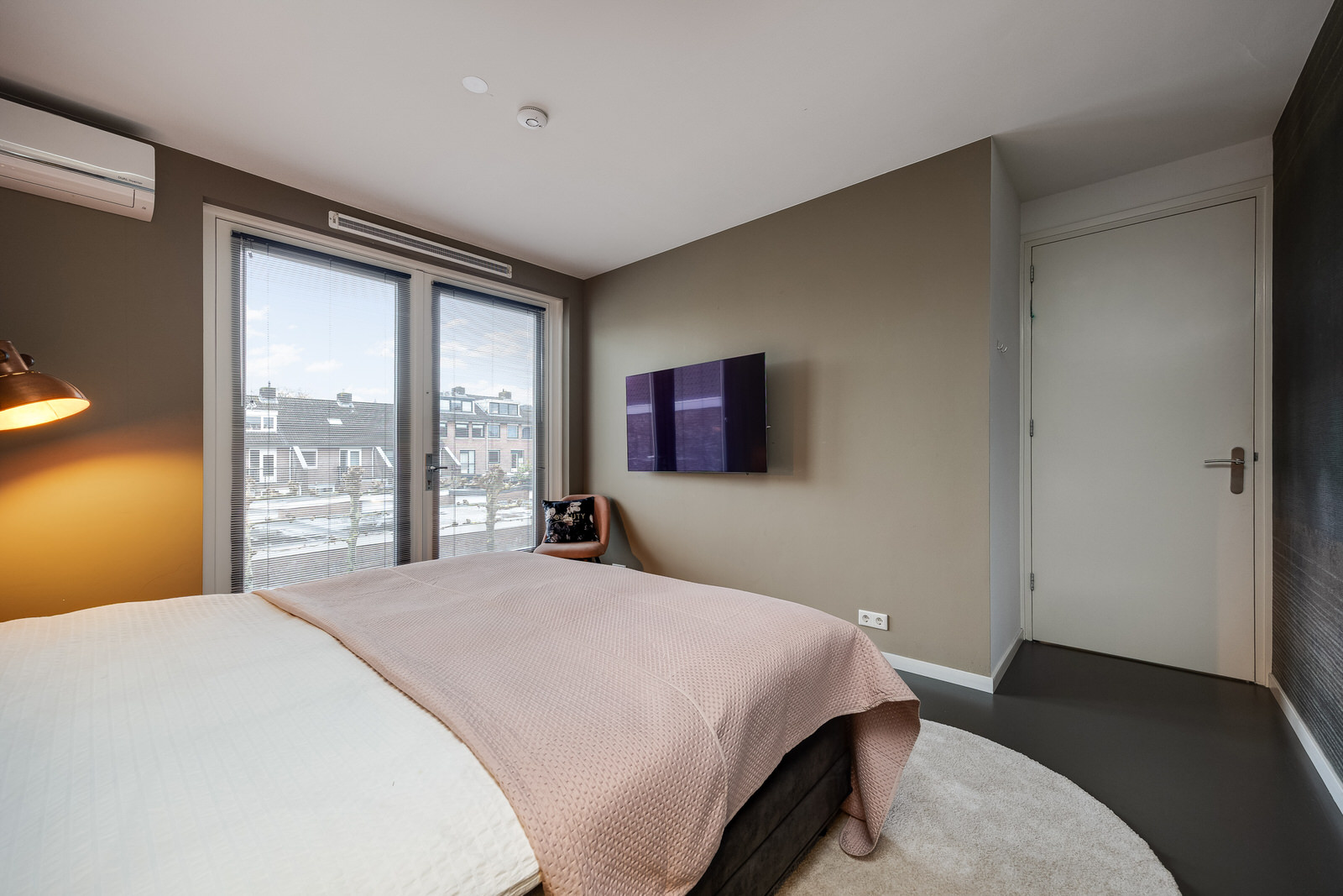Op deze verdieping bevinden zich drie volwaardige slaapkamers. Alle kamers zijn verzorgd afgewerkt. De slaapkamers aan de achterzijde zijn voorzien van openslaande deuren richting het platte dak. De grote slaapkamer aan de achterzijde is uitgerust met een LG-airconditioning, met voldoende capaciteit om meerdere ruimtes op de verdieping te koelen of te verwarmen. De slaapkamer aan de voorzijde beschikt daarnaast over elektrische rolluiken die via domotica bedienbaar zijn. In het gehele huis is een hoogwaardig domoticasysteem aanwezig van het merk Eaton, waarmee verwarming, verlichting en rolluiken zeer eenvoudig kunnen worden aangestuurd.